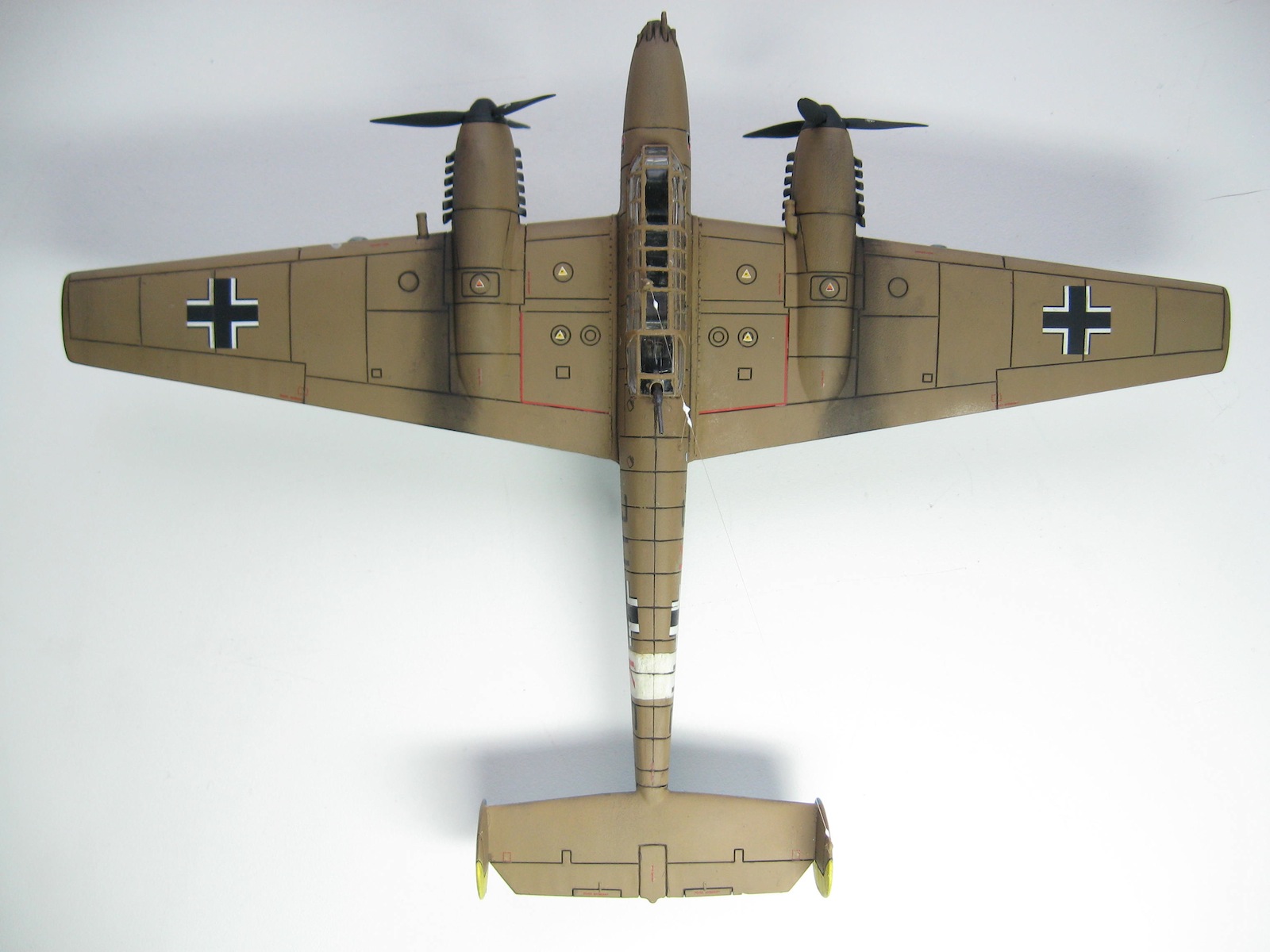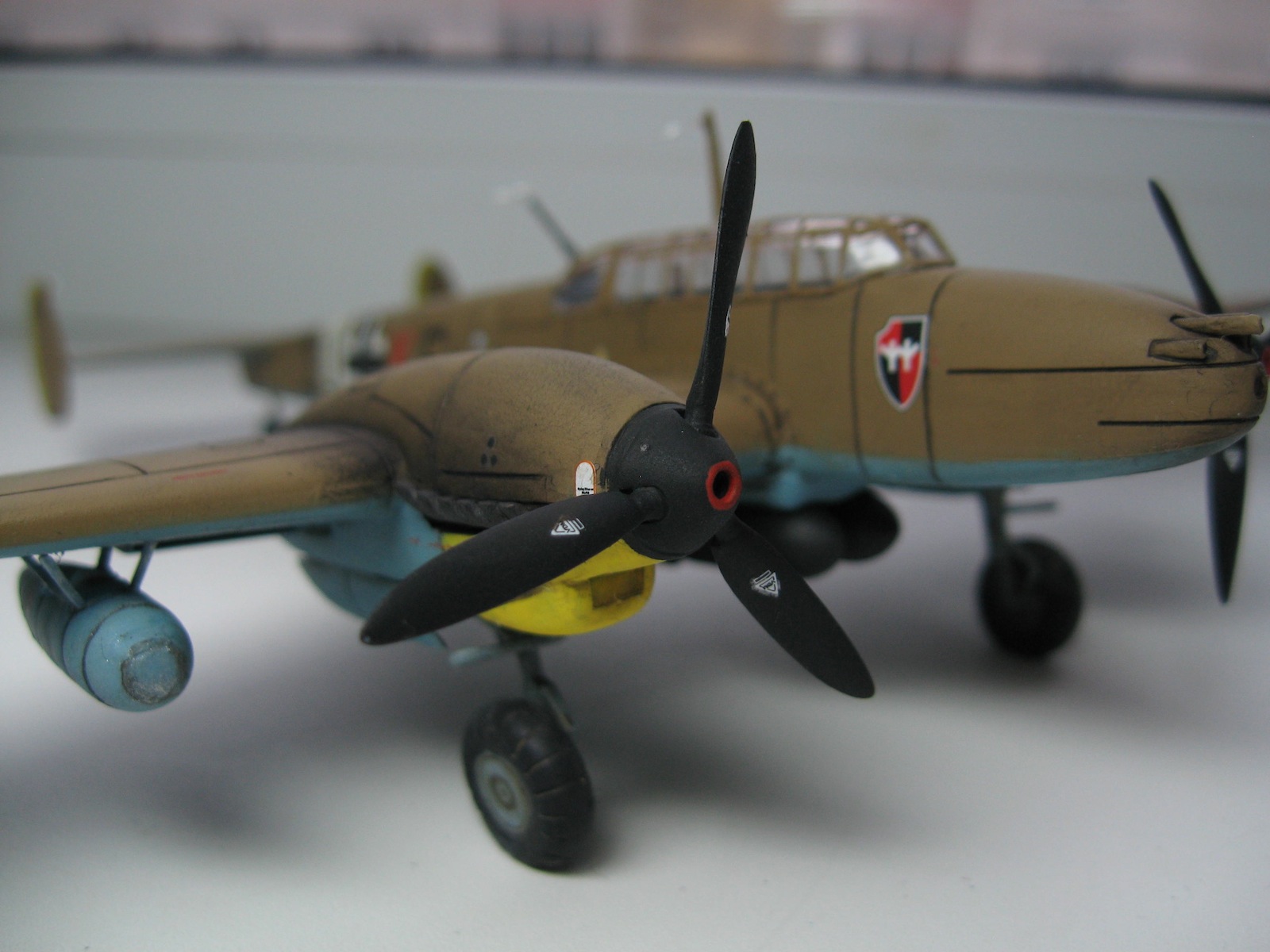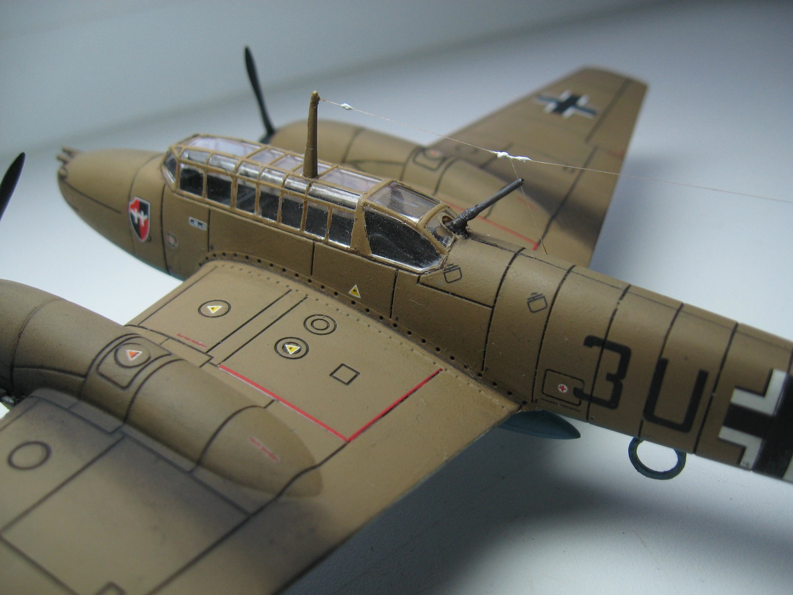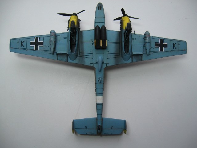 Хорошо для почину! Сборка и покраска почти без замечаний. Из везеринга - не стоит подчеркивать смывкой гипертрофированные косяки производителя, особенно если Вы и сами это видите. Это про расшивку. Максимум прешейдинг, и то под сомнением. И начинайте учить матчасть, хотя бы с базовых основ конструктива - как у вашего прототипа элероны и закрылки работают (производитель-подлец, пропустил линии стыков)? Кроме самих контуров их бы поглубже выделить надо было бы - сливаются с расшивкой. Много незамкнутых швов расшивки (где-то производитель накосячил, а где-то и мастер). Ну и размеры оборонительного 7,62 мм тянут минимум на MG 151/20.