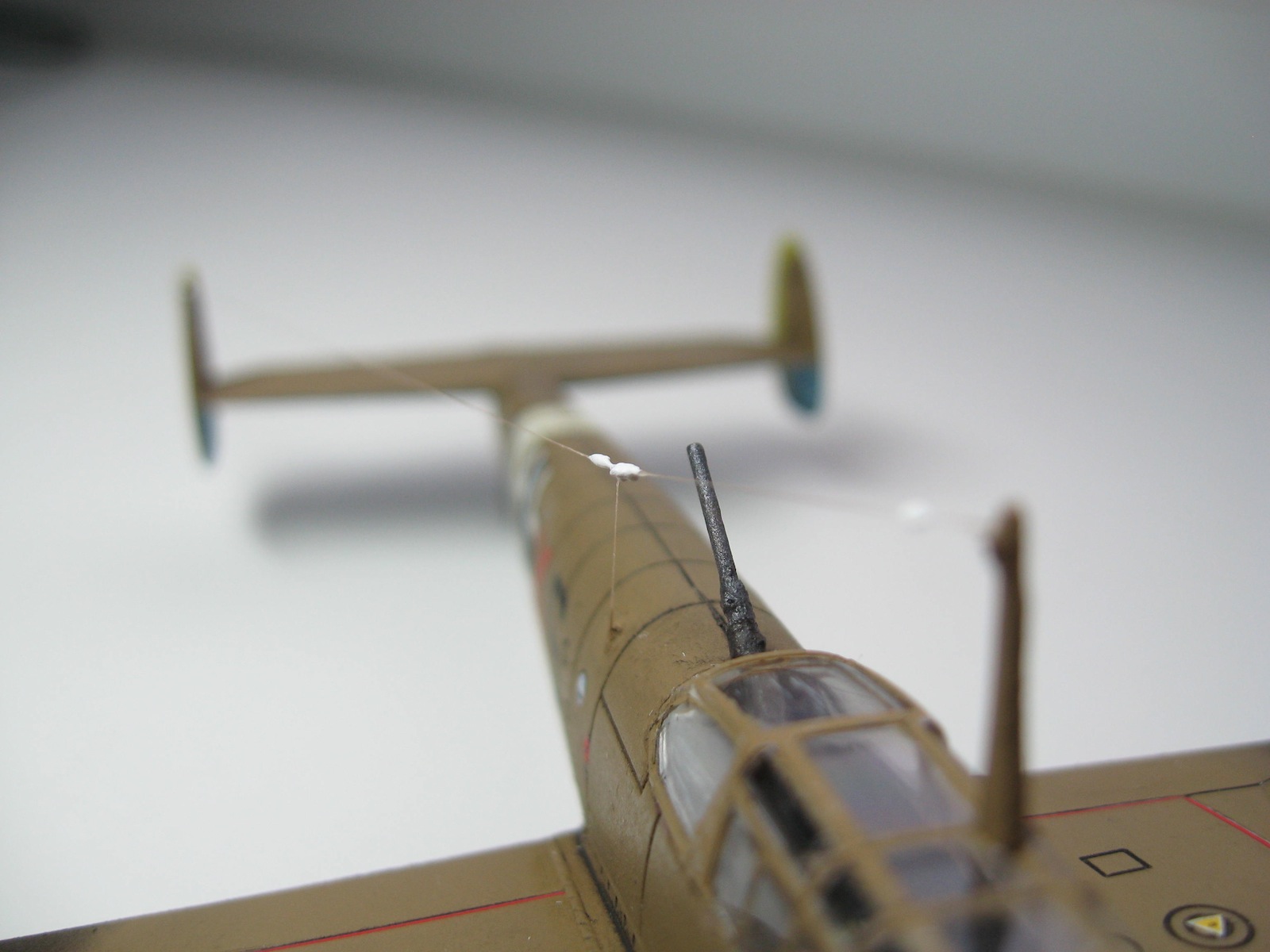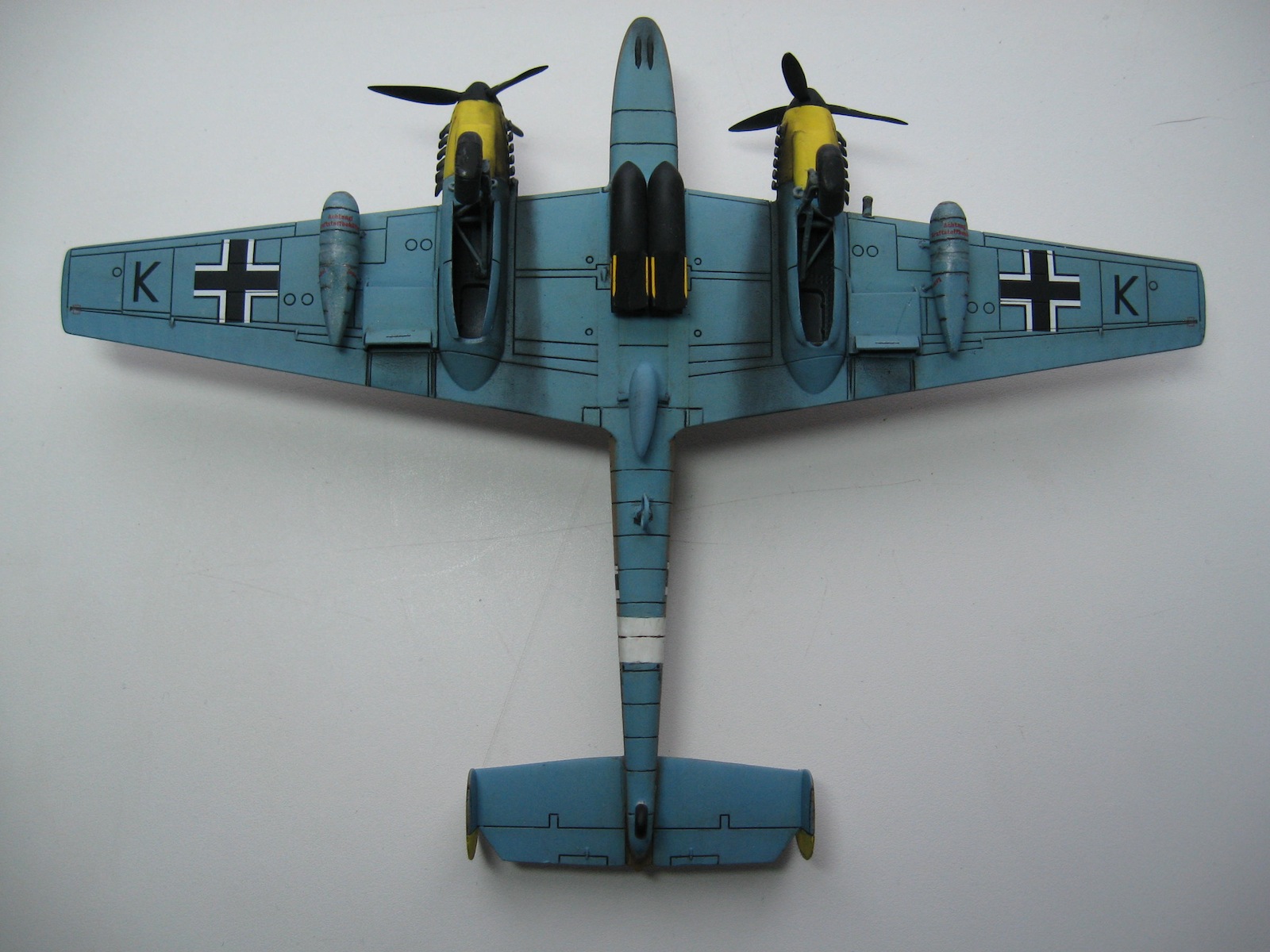 Это не палка, это швабра, для облегчения самолета и устрашения противника (если помните "ПерлХарбор" ))) Надписи проверю, может задел когда заднюю шасси переделывал, сломал случайно, когда лаком покрывал. А какие именно бомбы вас интересуют ? если под крыльями, то это баки подвесные. Их в наборе дается на выбор или 198 гал. или 66 гал., а под физюляжем бомбы SC500. Надписб сбоку как я понял это "keine bombe" - не бомба. а вторая надпись ''achtung kraftstoffbehalter'' - внимание топливный бак