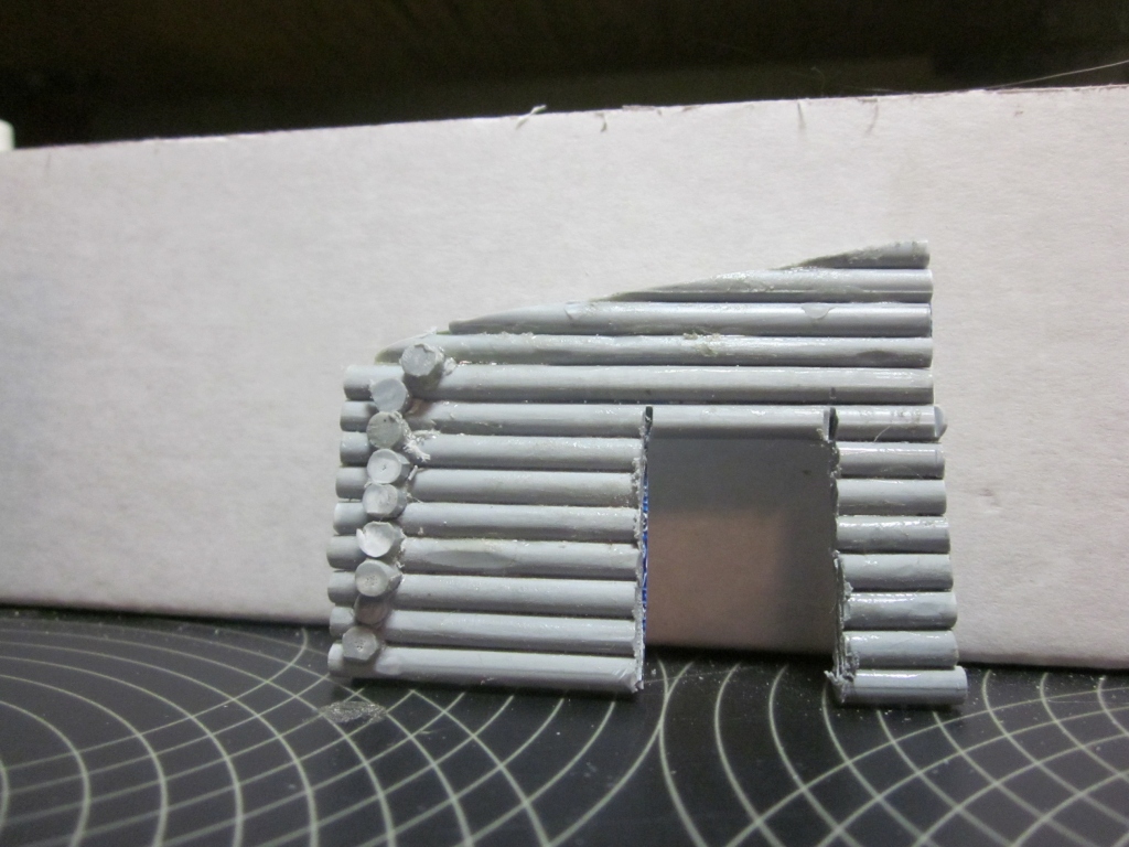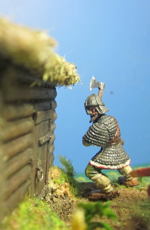 данная мини виньетка скорее эксперимент с окраской фигурок данного размера и созданием деревянных строений из остатков литников. Данное строение не является "жилым", а скорее "подсобным".