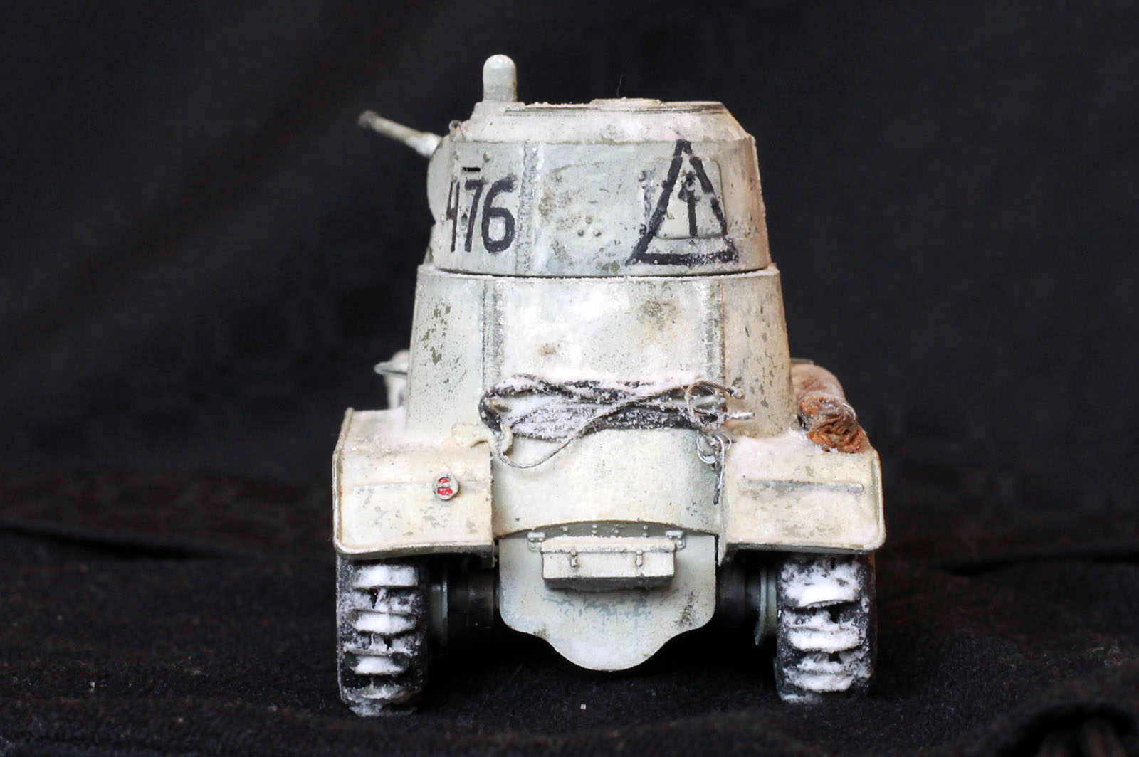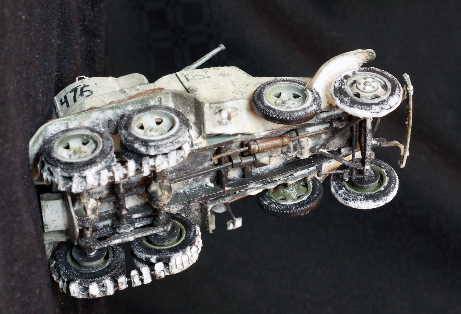 6. Следующий шаг, точнее много шагов, просто между этими шажками не фотал. Номерки нанёс через трафарет старым маркером и корректировал зубочисткой (пожалел, надо было аэрографом выдувать). Белым акрилом нанёс пятнышки, потом затонировал из аэрографа маслом (смесь коричневой и рыжей краски). Смывкой - чёрной и коричневой выделял и грязнил элементы машины. Лаком для волос фиксировал снег (соду). Фары сделал так: вырезал два кружочка из фольги и вдавил их светодиодом внутрь фар. Получилась сферическая форма. Белой и желтой краской сделал точки в центре. Закрыл это хозяйство кружочками из какой-то прозрачной пластиковой упаковки, предварительно нацарапав сеточку.