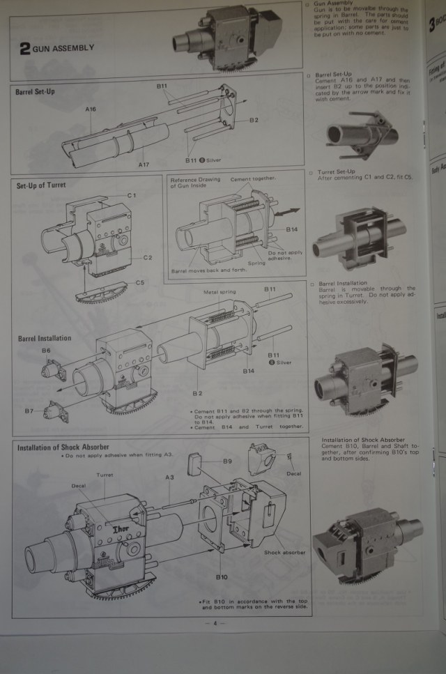 Hasegawa предлагает собрать мортиру с 600мм орудием, а именно Thor (судя по декалям). Модель собирается из пластиковых деталей, уместившихся на 4 литниках, 3 из которых соединены вместе, (2 детали даны отдельно, возможно вывалились), виниловых гусениц и 2х пружинок для отката орудия.