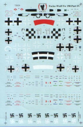 Поскольку некоторые производители, прямо скажем, не балуют покупателей ни качеством, ни содержанием своих декалей, представленная декаль может представлять большой интерес для обладателей моделей Fw-190 серий А-6, А-7, А-8 и даже G-3. Декаль содержит четыре самодостаточных комплекта обозначений (включая свастики и техничку) и позволяет полностью обдекалить 4 модели.