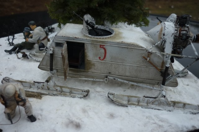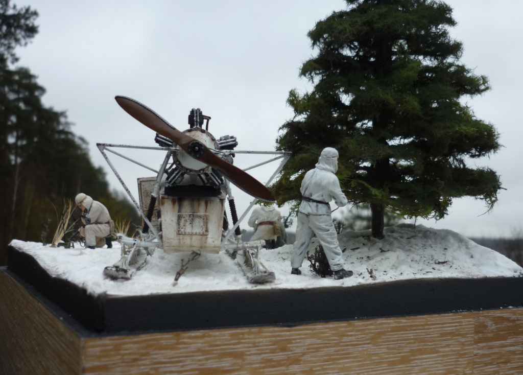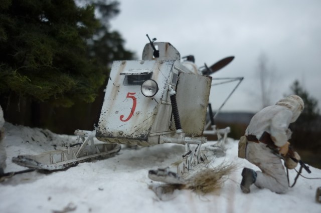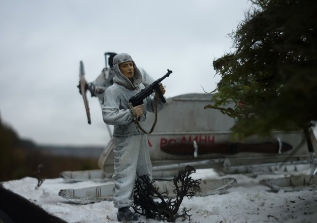 Очень понравилось! Аэросани вышли вообще на отлично, фигурки чуток похуже (хотя я вообще их красить не умею))). А сюжет, в принципе, логичен: взяли пехом тихо "языка", вышли к точке эвакуации, доложили... А сани тоже логичны - сплошной линии обороны в лесах и снегах не было....