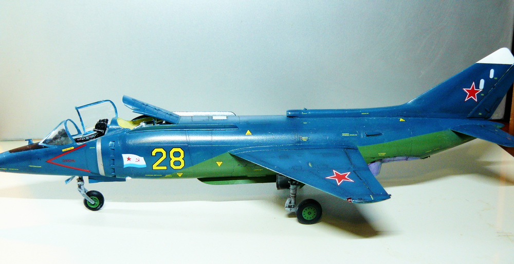 Здравствуйте. Модель была собрана год назад ,и только сей час решил ее выставить . Модель практически изкоробка , добавил кабину аирес и воздухозаборники квикбуст . Кит в работе очень приятный ,на афтер обзор я делал , и решил что модель в принципе самодостаточна для не искушенного моделиста . Красил как всегда акрилом акан , покупал тематический набор .Потом смывка , деки и футура . Матить не стал так как с глянцевой поверхности пыль проще протирать .Очень хотел сделать качественную побежалость на выхлопе , купил пигменты и металики специальные , но результат огорчил .С уважением .