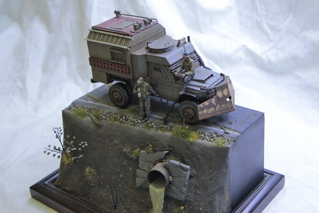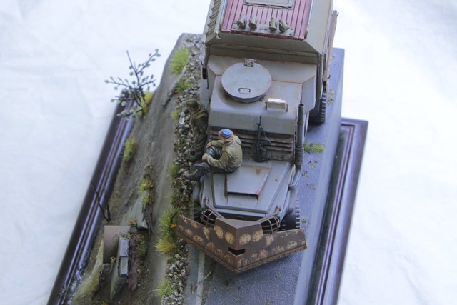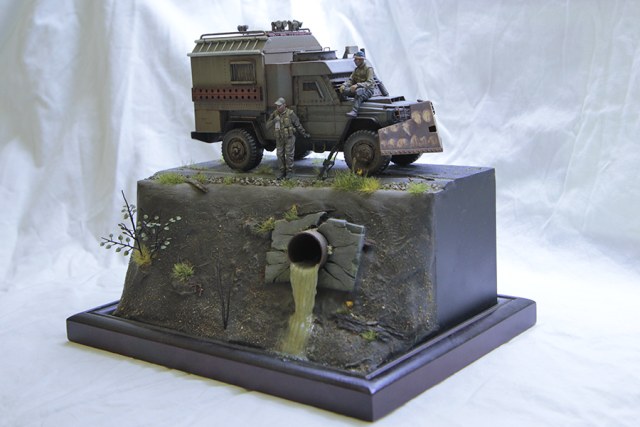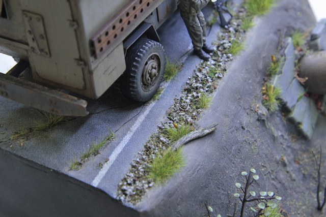 По материалам. Использовался листовой пластик разной толщины, медь, тянутый литник. Колеса от какого то американца (получил их в подарок), были значительно расширенны. Выхлоп - трубочка от детского сока. Деревянный настил на кунге - деревянные палочки от подстилочек для тарелок и тд. Асфальт сделан из наждачной бумаги. Придорожный щебень из гранулированного чая. Основа подставки пластик, гипс, суперклей. Труба из большого одноразового шприца. Вода сделана с помощью химии Vallejo water effects (надо отметить, что это первый мой опыт, как получилось - так получилось... дальше - лучше). Кусты сделаны из тянутого литника, листики Green Line (выглядят не много не так как я себе это рисовал, но в целом вроде ничего так). Травка так же Green Line, придорожный мусор Reality in scale. Химия на авто Акан, AK, Vallejo, Mig.