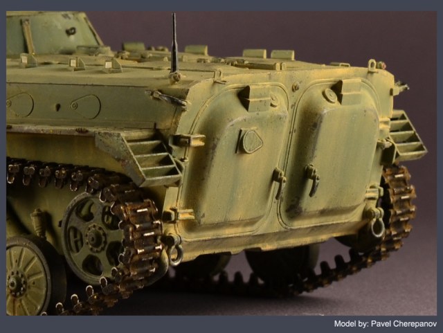 Откровенно не понравилась, и она совершенно не реаличтично смотрится (на мой взгляд, опять же) - копоть возле решётки. Я прочитал описание, и строки что сделано с нарочитым перебором - но выглядит как минимум странно. На боевых машинах в парке (БМП-2, правда...) ни разу не видел ничего похожего, даже на тех, которые постоянно ползали на полигон.