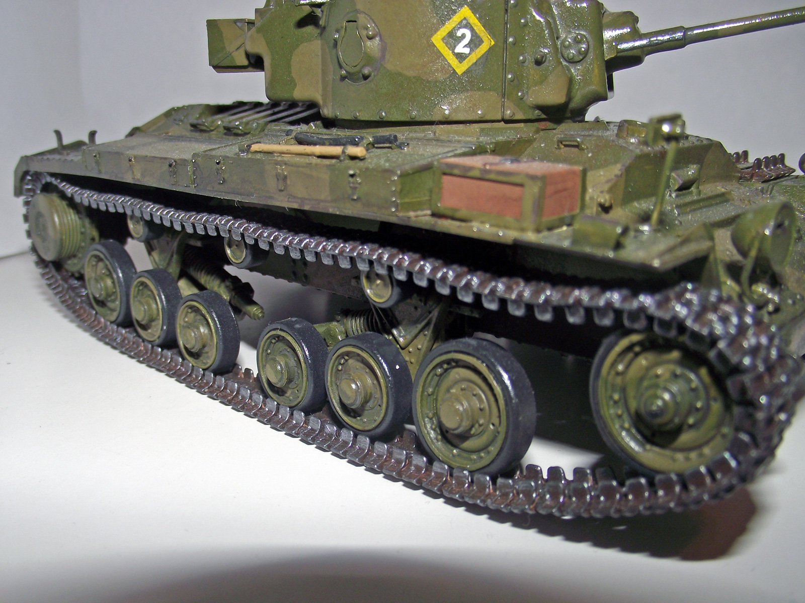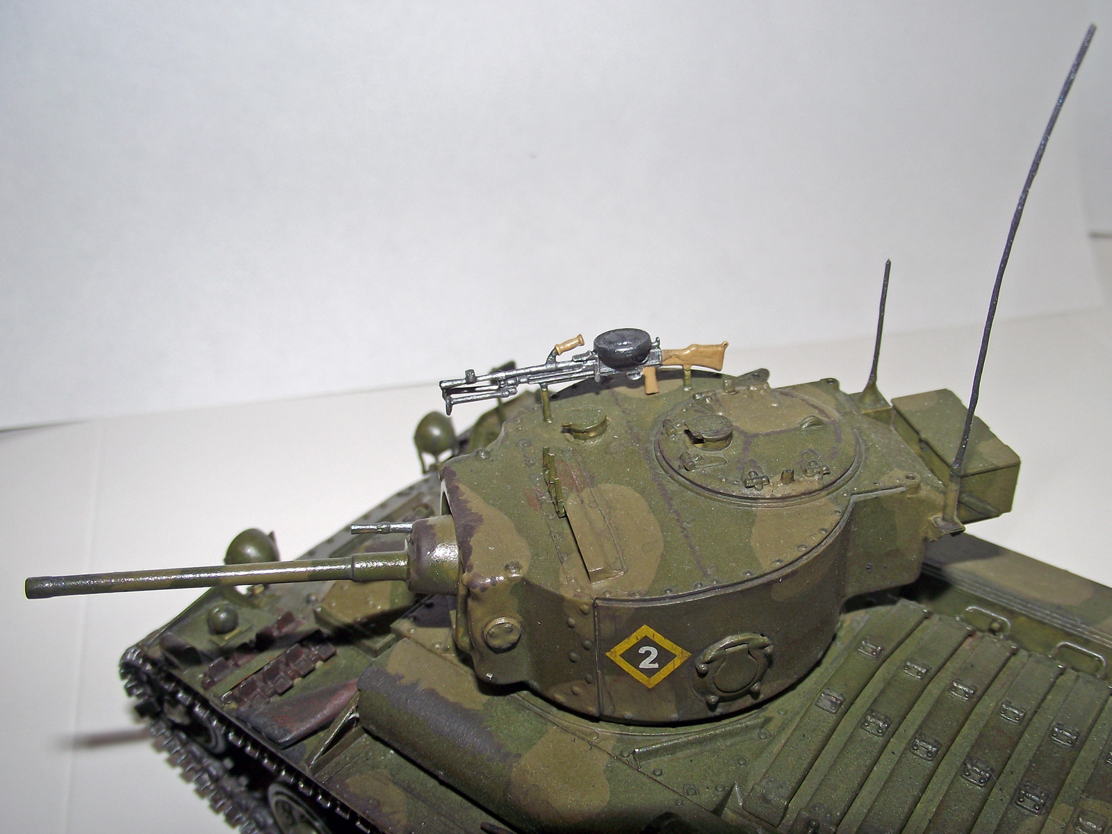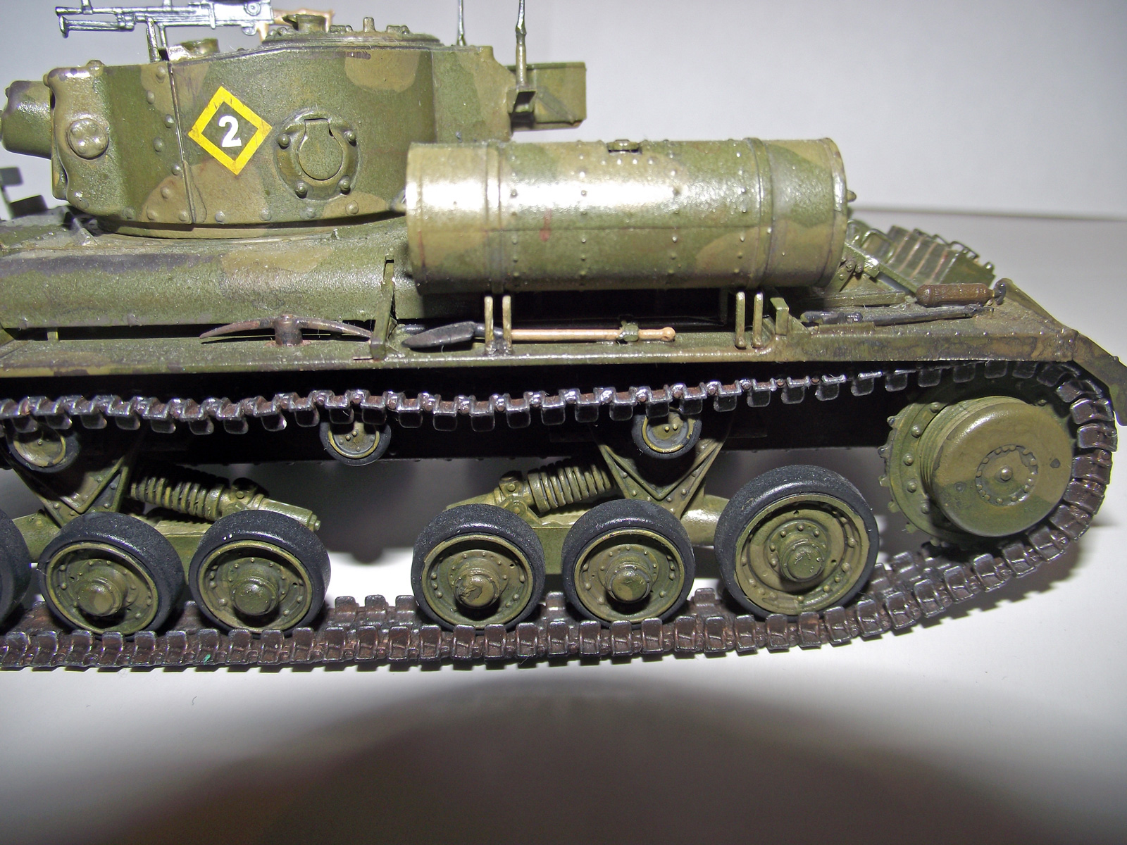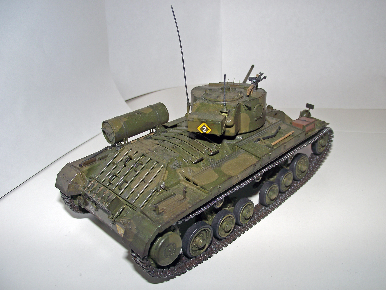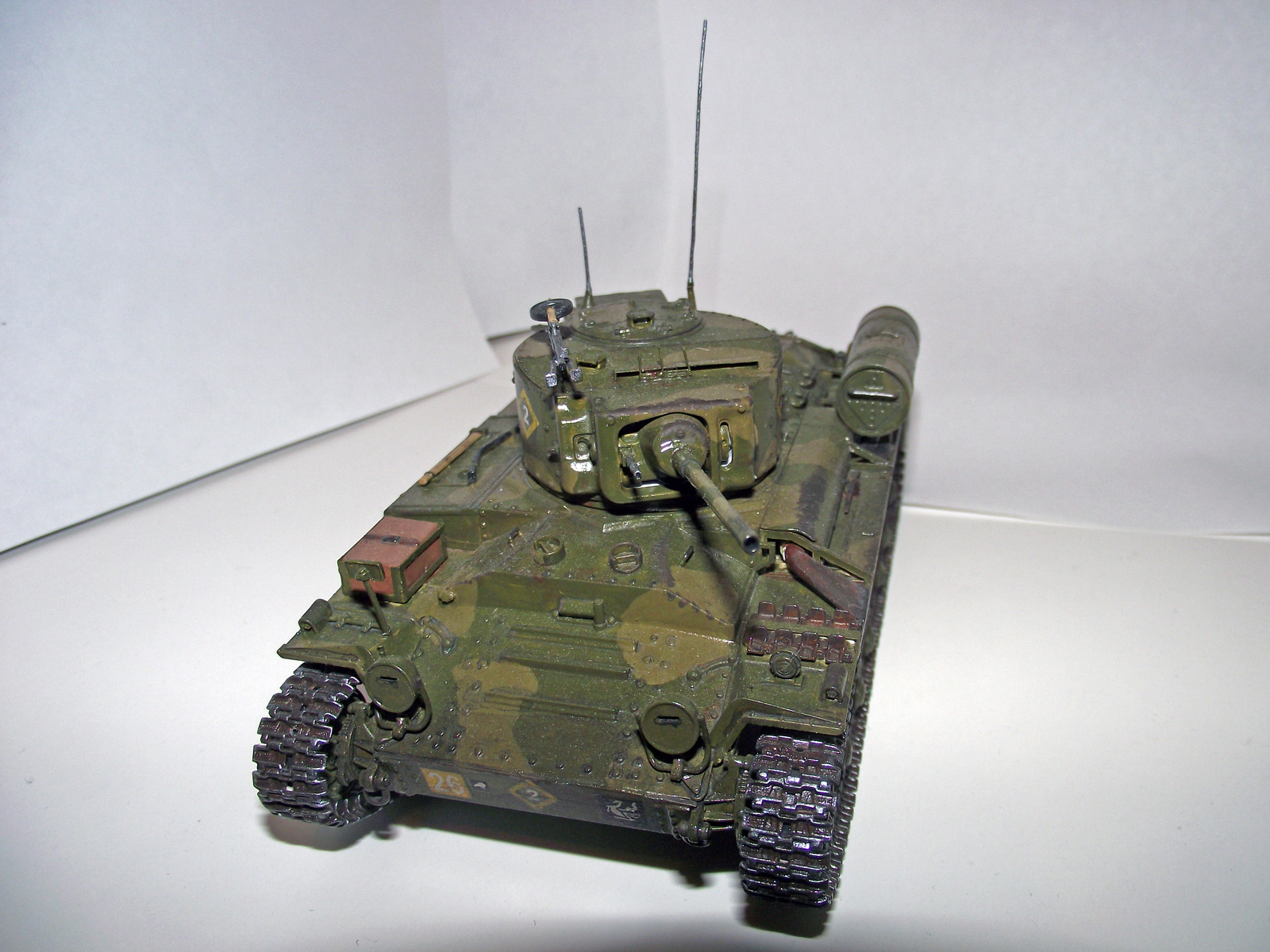 Окрашено кистью акрилом Tamiya и Звезда. Сделал только антенны из проволоки и поддон для канистр из остатков рамки от травления, а то они просто на броню клеились. Попробовал сделать смывку акрилом, но понял, что был не прав =) Также чуть потертости попытался сделать. Из неприятного - это катки: Когда монтировал гусянку они погнулись, т.к. стояли не паралелльно. Выпрямлять страшно, боюсь сломать гусеницы. Собирать этот набор очень понравилось - все стыкуется, куча мелочевки (порадовали литьевые номера на траках), гусеницы наборные. Комментариям и критике буду рад. Огрызаться не буду.