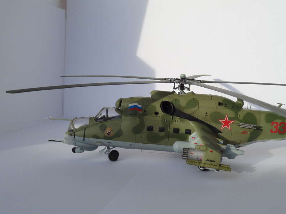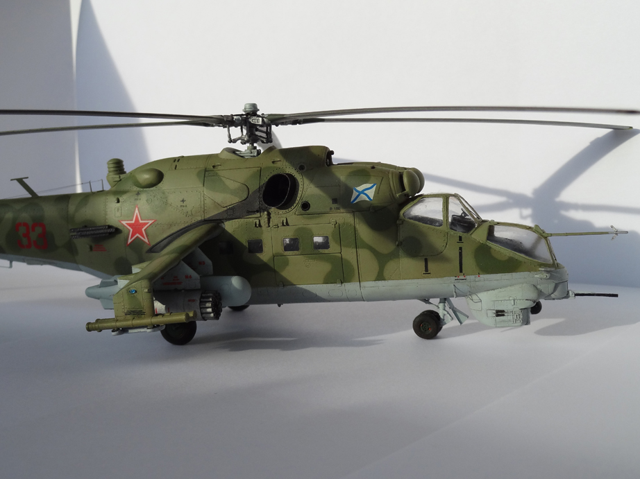 Доброго времени суток, коллеги. Давно была мечта в перерывах между постройкой самолетов сделать небольшую коллекцию отечественых вертолетов. Не знал, с чего начать. И тут на новый 2013 год анонимный дед мороз прислал мне подарок в виде Ми-24 от звезды. За что ему спасибо. Тут же приступил к поиску дополнений, были приобретены и использовались фототравление big ed Eduard, колеса Экипаж, стволы и еще кое какие мелочи Квик буст, фары Эльф, добавил от себя проводку клеп и прочее. Вариант был выбран из инструкции. Краска акан. В завершении работы масло и пигменты МИГ.