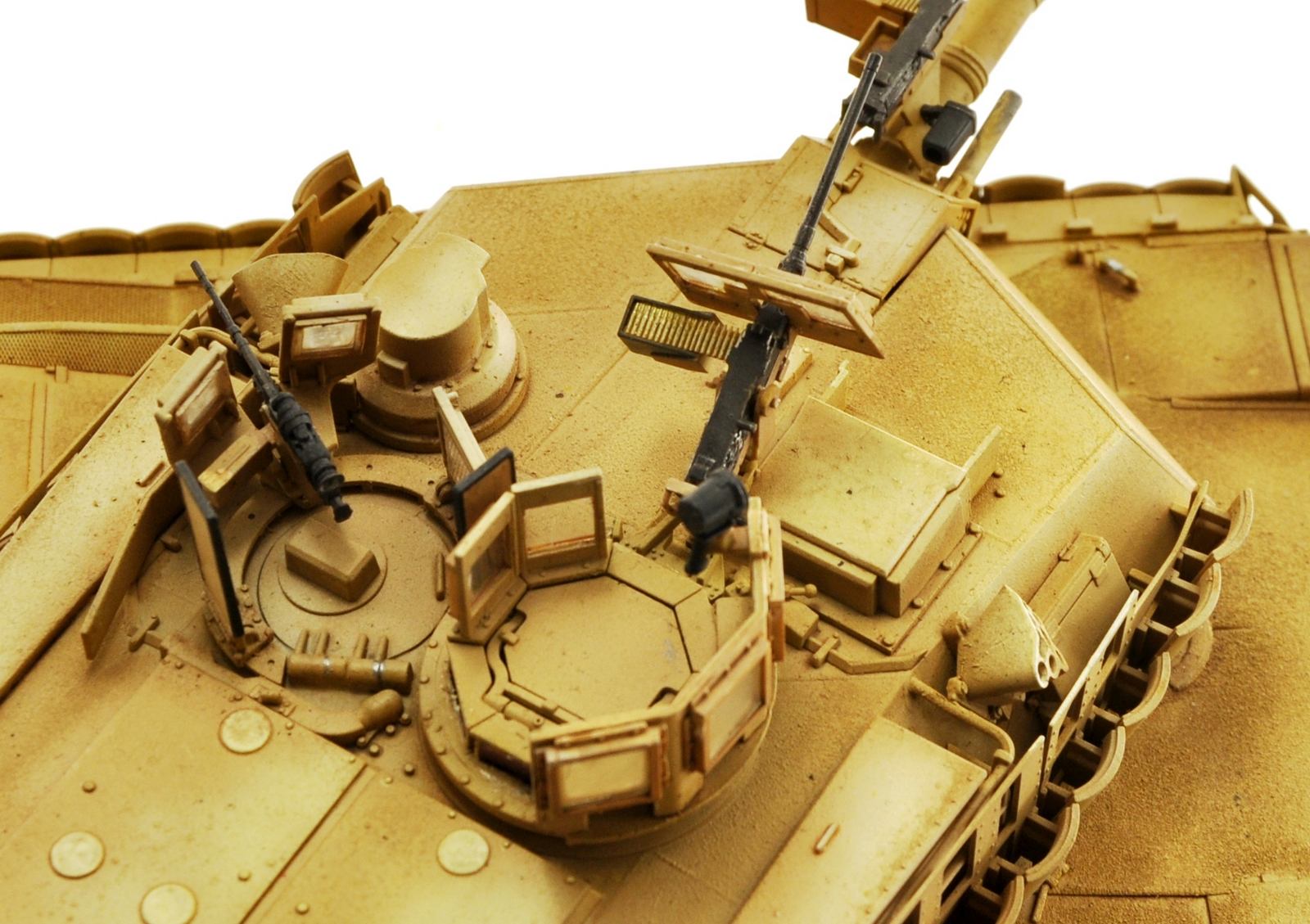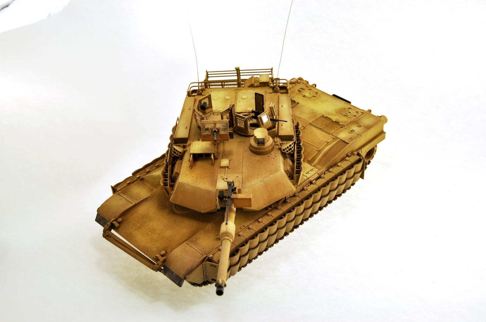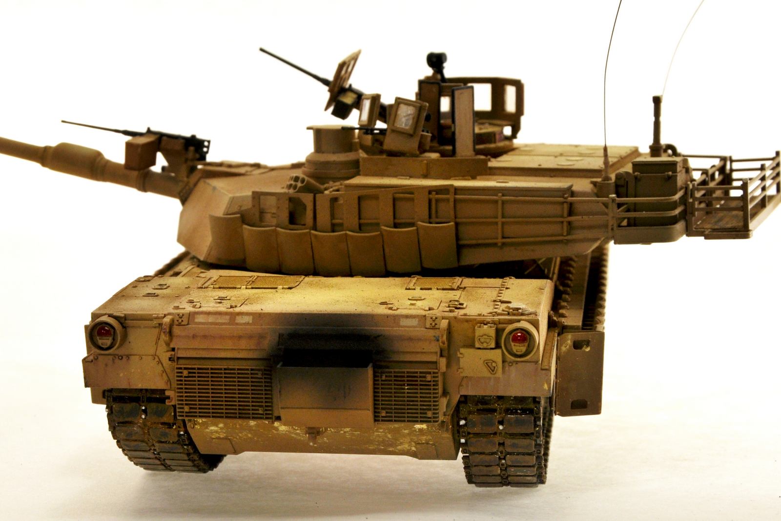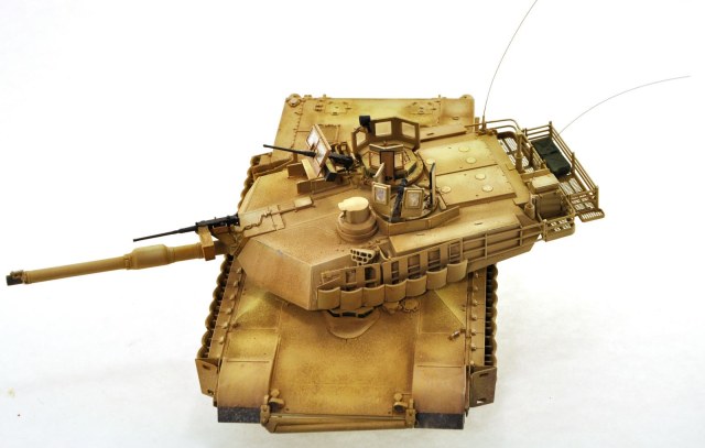тут есть один подводный камень абрамсы чистые... даже когда видно что танк сильно использованный на нем нет кучи сколов и грязи как на многих советских собратьях, все таки пустыня а там вокруг песок..и песок... и еще раз песок - вот фото пожалуй одного из самых "попользованных" абрамсов что я видел, НО! модификации TUSK II мало мальски поюзаных я не нашел (что не удивительно с учетом того что данных комплектов в войсках не так много и поступать они начали лишь 2006 -7 годах и устанавливался комплекс по логики вещей на танки в хорошем состояние) добавить эффектов не проблема - проблема что смотрятся они на нем неуместно, а выцветание.. возможно оно где то ярче чем следует тут дело вкуса, но если делать его меньше то в живую не смотрится танк, совсем, желтое пятно и все, никакого объема и "живости"