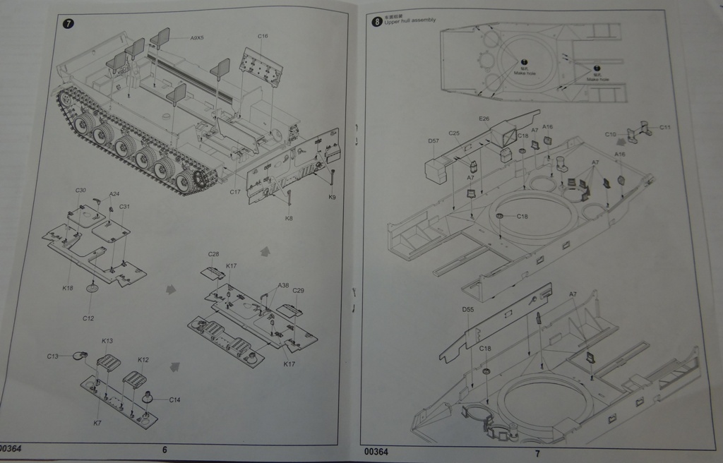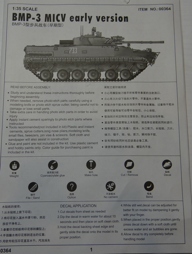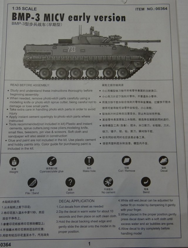 Приветствую всех жителей каропки и представляю Вашему вниманию очередной обзор БМП-3 от трампа. В расстроенных чувствах после скифа и почти защищённой десертацией по нецензурной брани я полез опять в интернет магазин в поисках интересующей мне модели. И, о чудо! Есть, Trumpeter 1/35 BMP-3 MICV early version ! Начинаю лазить по каропке в поисках данного кита, вроде нормальная и отзывы хорошие. Беру! Ну и плюс ко всему заказал стволы с пулемётами и травлю. Приходит посылка, вскрываю, достаю и.... просто млею, приятно брать в руки! Итак, в коробке из плотного картона имеются: подробная и понятная инструкция с 2-мя цветными вариантами окраски, 2-е раздельные части корпуса (верх, низ), отдельно башня, 11 литников песочного цвета из приятного не жёсткого пластика, литник с прозрачными деталями, плата травления и листочек с декалями (2 варианта номерных обозначений), пакетик с наборными траками и 2 литника с гребнями. По сравнению со скифом этот кит просто чудо! Утяжин и облоя не заметил, качество отливок на 5-ку. В целом этот вариант мне понравился, советую всем, кто хочет собрать нормальную БМП-3.