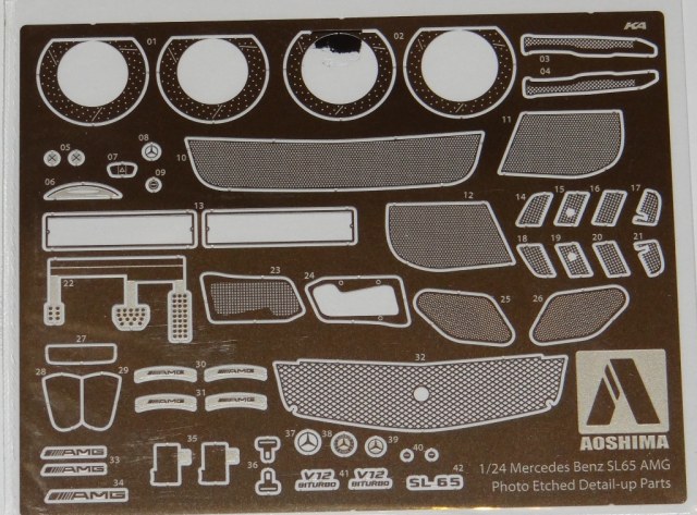 Приветствую всех жителей Каропки и представляю Вашему вниманию творение от Aoshima в виде Mercedes Benz SL65 AMG. Все его ТТХ описывать не буду,т.к. считаю это не уместным здесь, ведь нам интересно узнать о модели, а не о том в каком году данный автомобиль сошёл с конвеера и т.д. (ИМХО). Итак, в плотной картонной каропке имелась инструкция по сборке, отдельный корпус кузова, 9 литников качественной отливки и пластика, 3 литника с прозрачными деталями (стёкла, фары, стопы), 3 литника хромированых деталей (колёсные диски, раковины фар и стопарей), листочек с декалями, листочек с хромироваными наклейками, маски на стёкла, сеточкака, пружинки амортизаторов и сами покрышки (мягенькие, с полным отсутствием неприятной бахрамы по центру колёс, что присутствует у некоторых фирм). Ну и ко всему этому я приобрёл набор травли от той же фирмы Aoshima. Облоя и утяжин не обнаружено, повторюсь, что отливка деталей качественно выполнена. По инструкции можно собрать с открывающимся капотом. Хорошая детализация салона, двигателя и ходовой. В общем набор очень понравился. По качеству может стать серьёзным подспорьем для тамии (ИМХО).