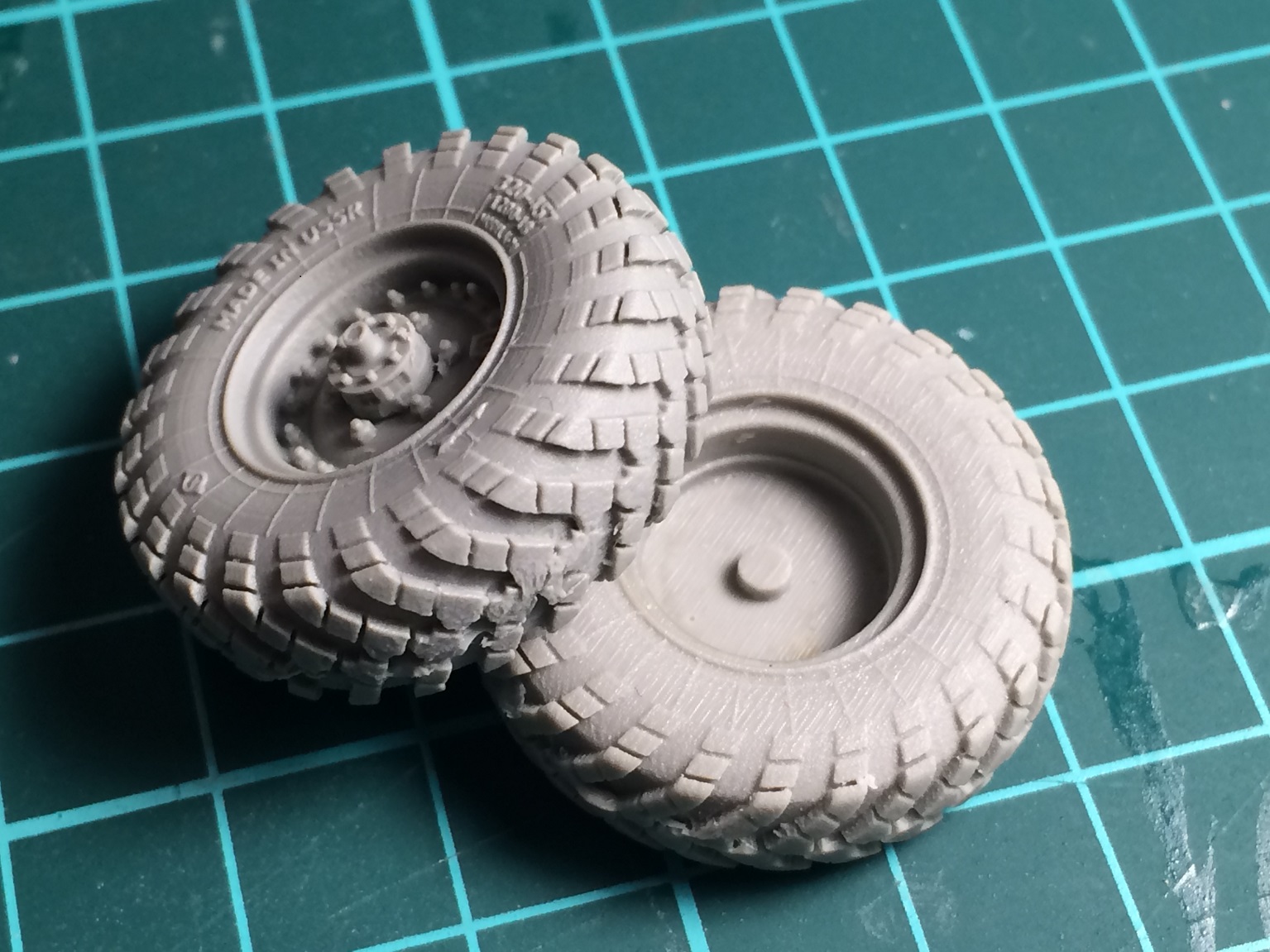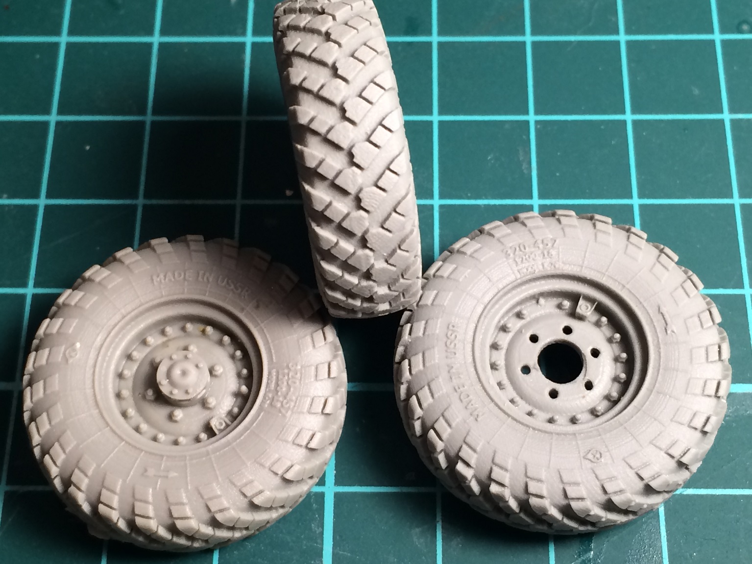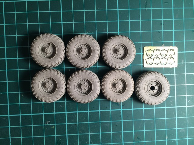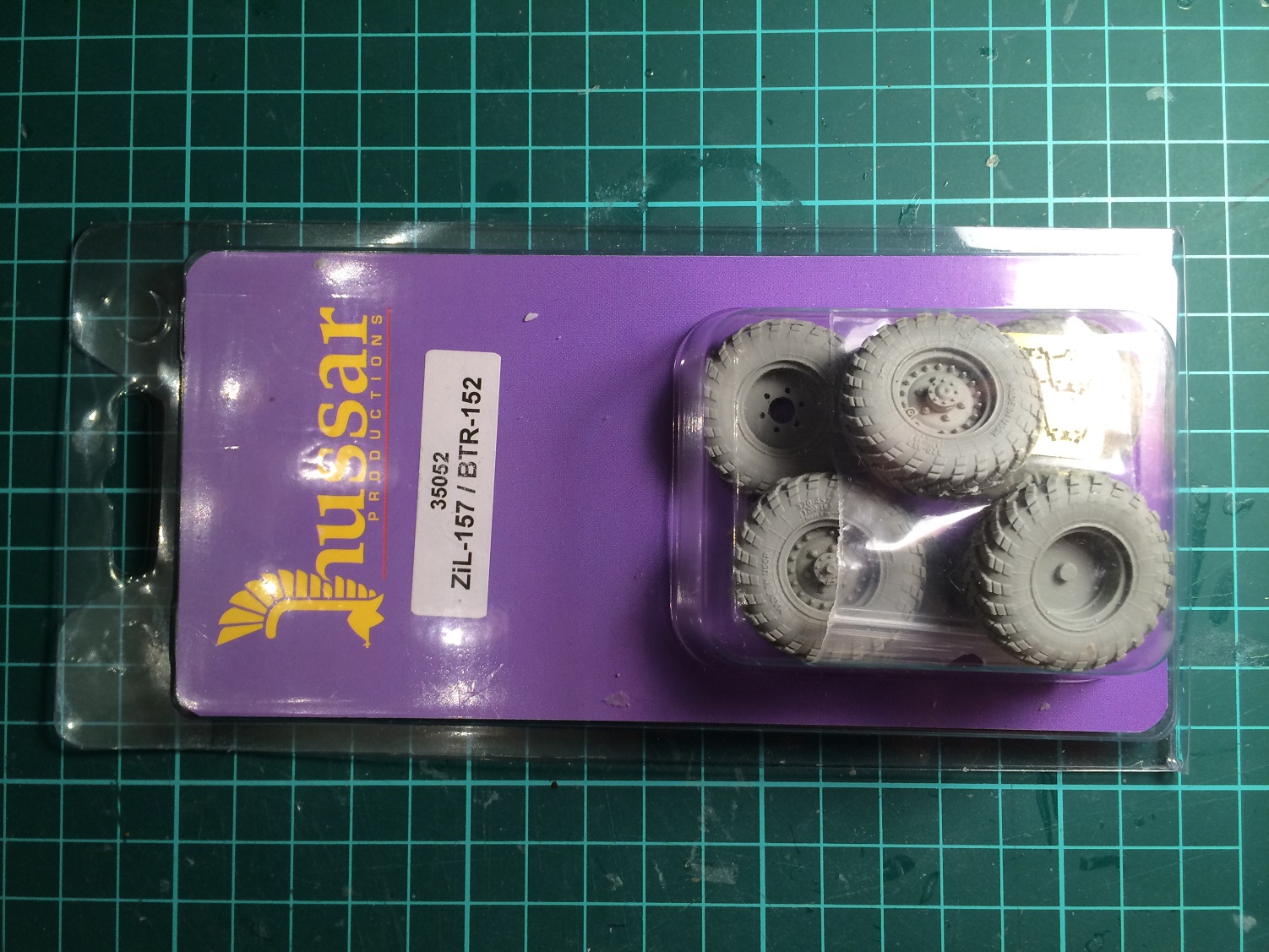 Выставляю обзор на дополнение, представляющее собой смоляные колёса к зилу 157. В упаковке лежат сами колёса 7 штук и платка ФТТ с корпусом подкачки.