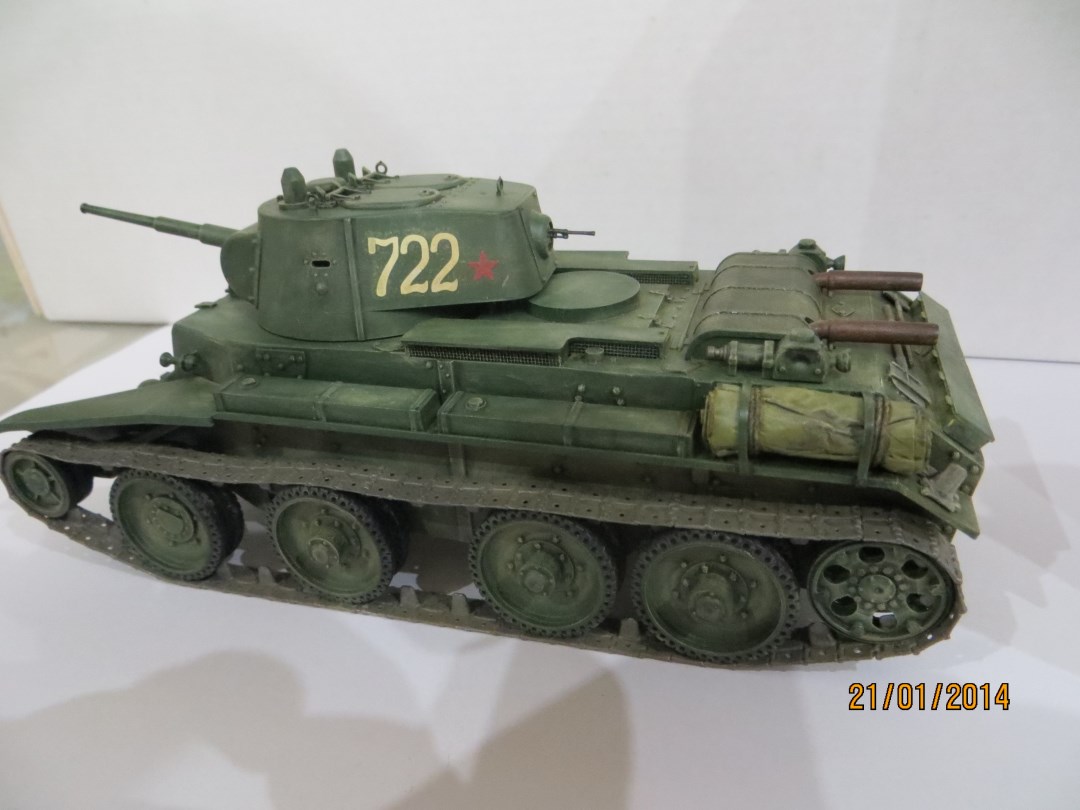 Хороший БТха получился! Сколов и потертостей бы добавить, следов технических жидкостей, ведь танк заправляют и обслуживают!В матчасти БТ не силен но из недочетов на мой взгляд: крышки ступиц стоят криво, чем закреплен брезент- это ремни или металические полосы- непонятно, декали жесть( лучше каждую цифру вырезать по контуру и наносить на глянцевую поверхность, затем покрыть её сверху глянцем), цепь вообще не понравилась .