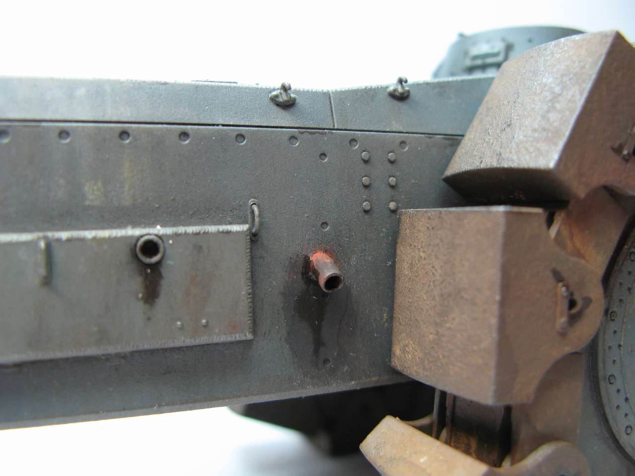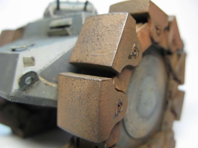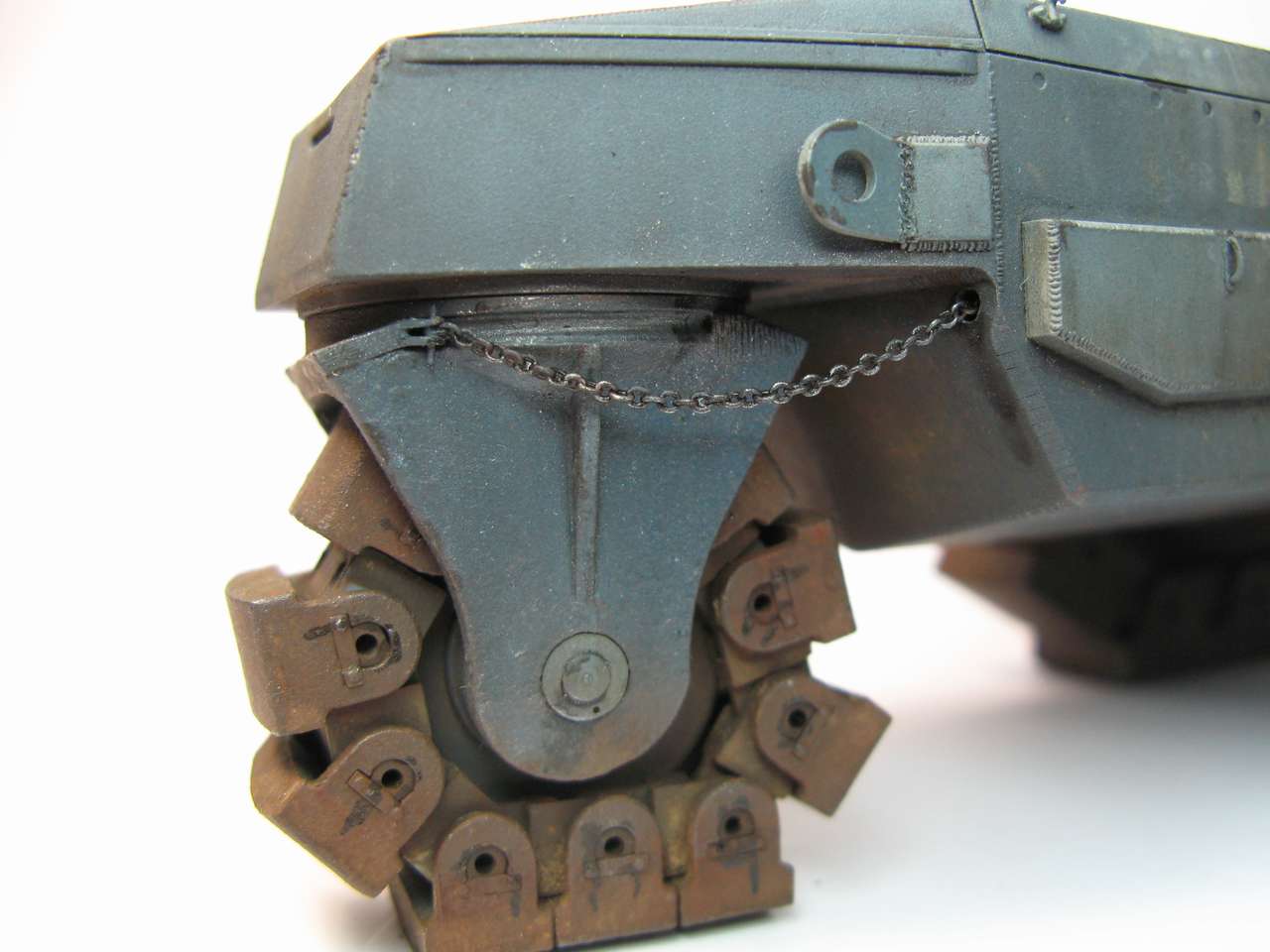 Сборка была не сложной, но нудной. Особенно доставило проблем запил надфилем траков (их можно не пилить, если вы хотите не подвижную ходовую). Ходовая часть полностью рабочая и подвижная. В некоторых местах пришлось пользоваться шпаклевкой. Срезы броневых плит были имитированы цанговым ножом. Некоторые детали были заменены (например ручки из проволоки). Для имитации литых деталей (башмаки, вилка управляющего колеса) была использована жидкость от Акан. Более детальную информацию найдете в сказке.