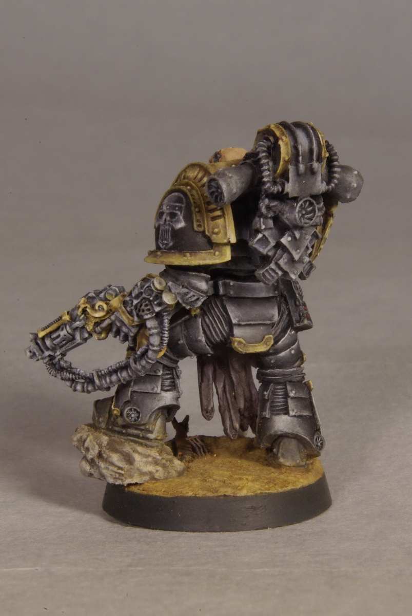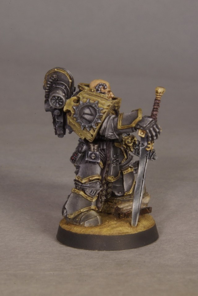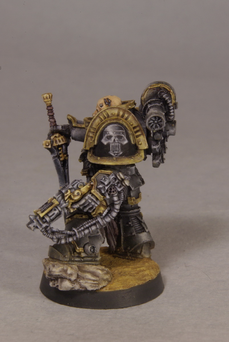 Данный персонаж облачен в особо редкую броню оружейника(?), так и не нашел перевода, в оригинале это называется Artificer Armour. Эти доспехи ценятся наравне с дредноутами и терминаторскими доспехами, причем, с последними еще и могут конкурировать. Поэтому даже в случае смерти носителя технодесантники легиона стремятся забрать доспех с поля боя и поместить в хранилище, чтобы потом передать другому достойному воину. Вроде как, немало подобных моделей дожило до 40К, и активно используется орденами. По оружию ничего не нашел, меч, как меч, болтер - явно какой-то археотех.