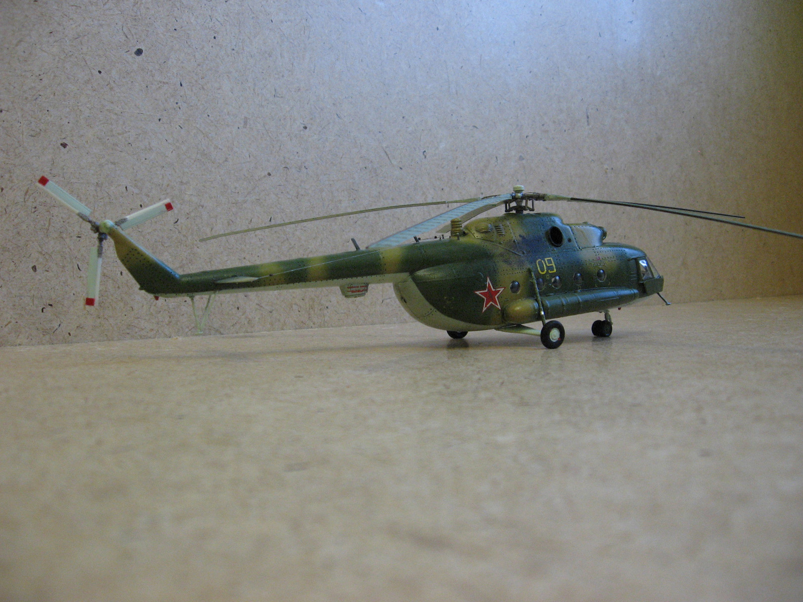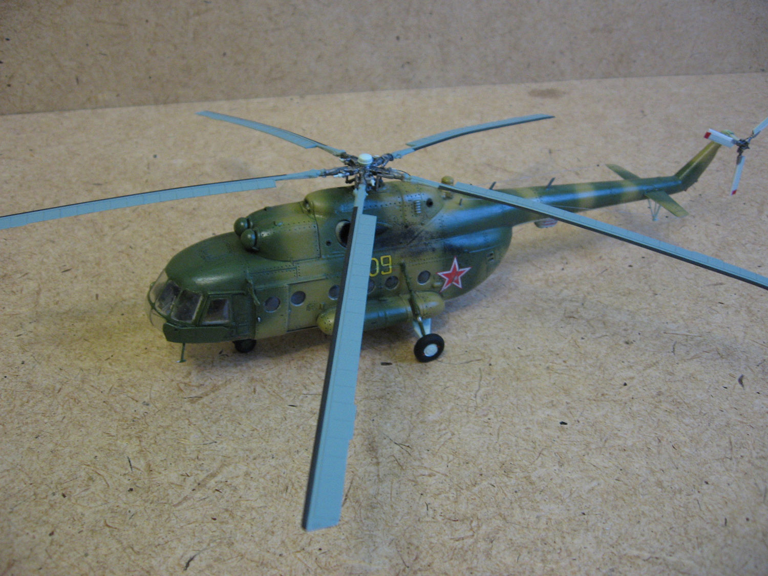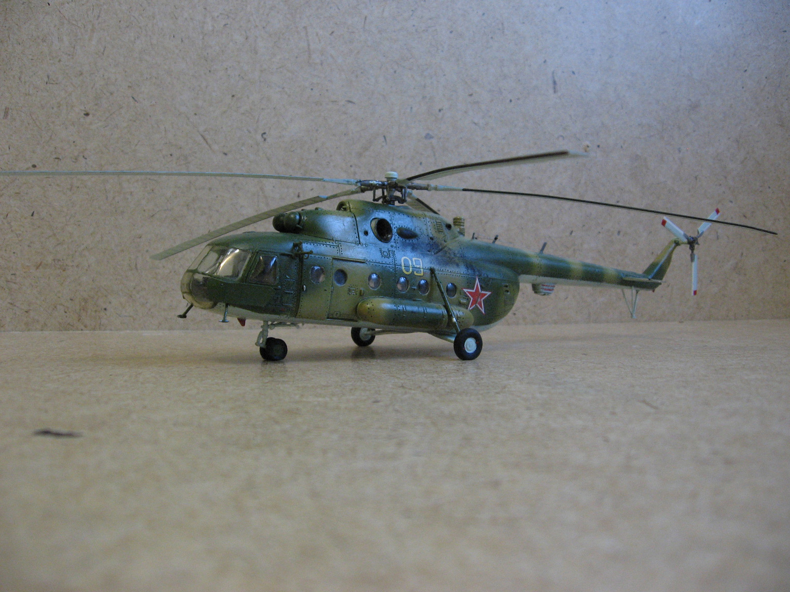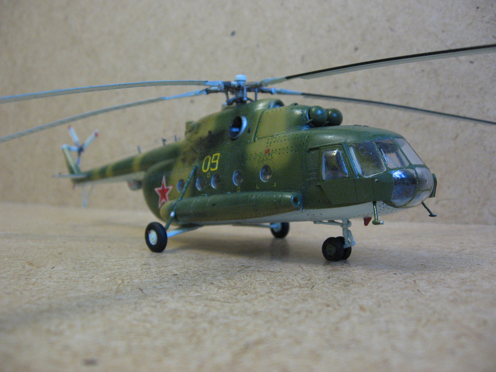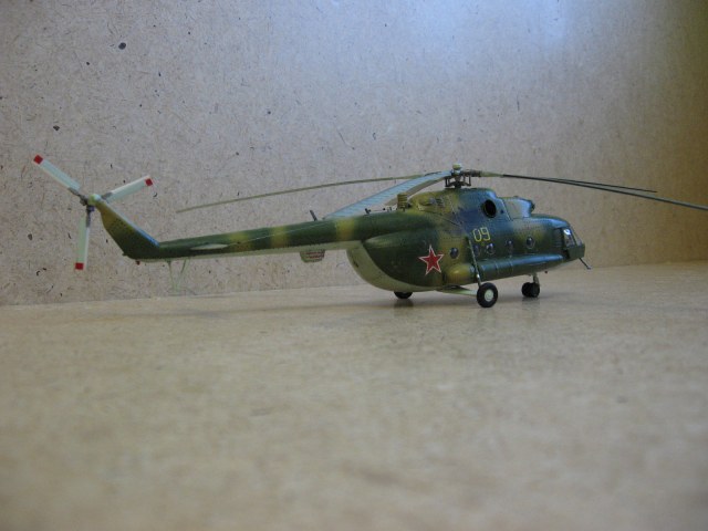 Доброго времени суток Уважаемые моделисты. Хочу представить вам модель ми-8 мт от Hobbyboss. Собирал ее очень долго около года с большими перерывами, т.к. очень мало свободного времени. Собиралась модель легко. Шпаклевки ушло не много. Из доработок сделал хвостовые антенны и попробовал нанести клепку, но с клепкой похоже переборщил- очень крупная получилась,да и редкая очень. В перспективе еще сделать зеркала заднего вида. Красил модель красками modelmaster. Красил аэрографом, затем модель покрывалась глянцевым лаком –смывка- матовый лак. Вертолет немножко блестит , но вроде на настоящих если свежая краска тоже блеск присутствует Никакой исторической привязки нет. Скорей собирательный образ ми-8мт. Жду от вас оценок и советов.