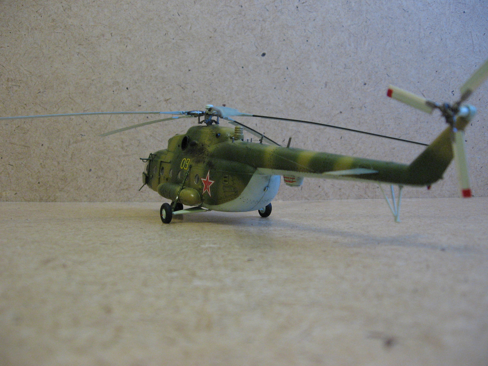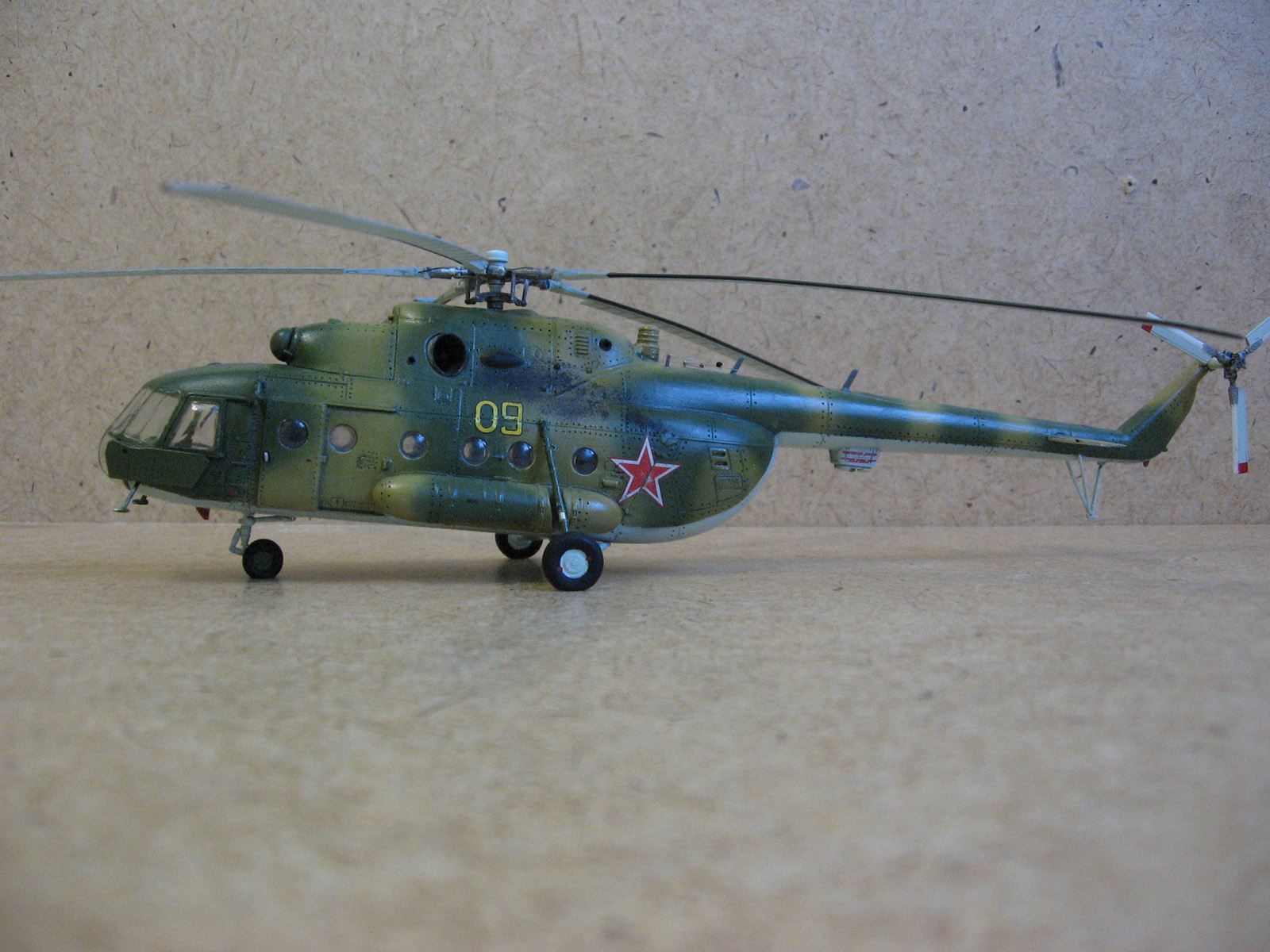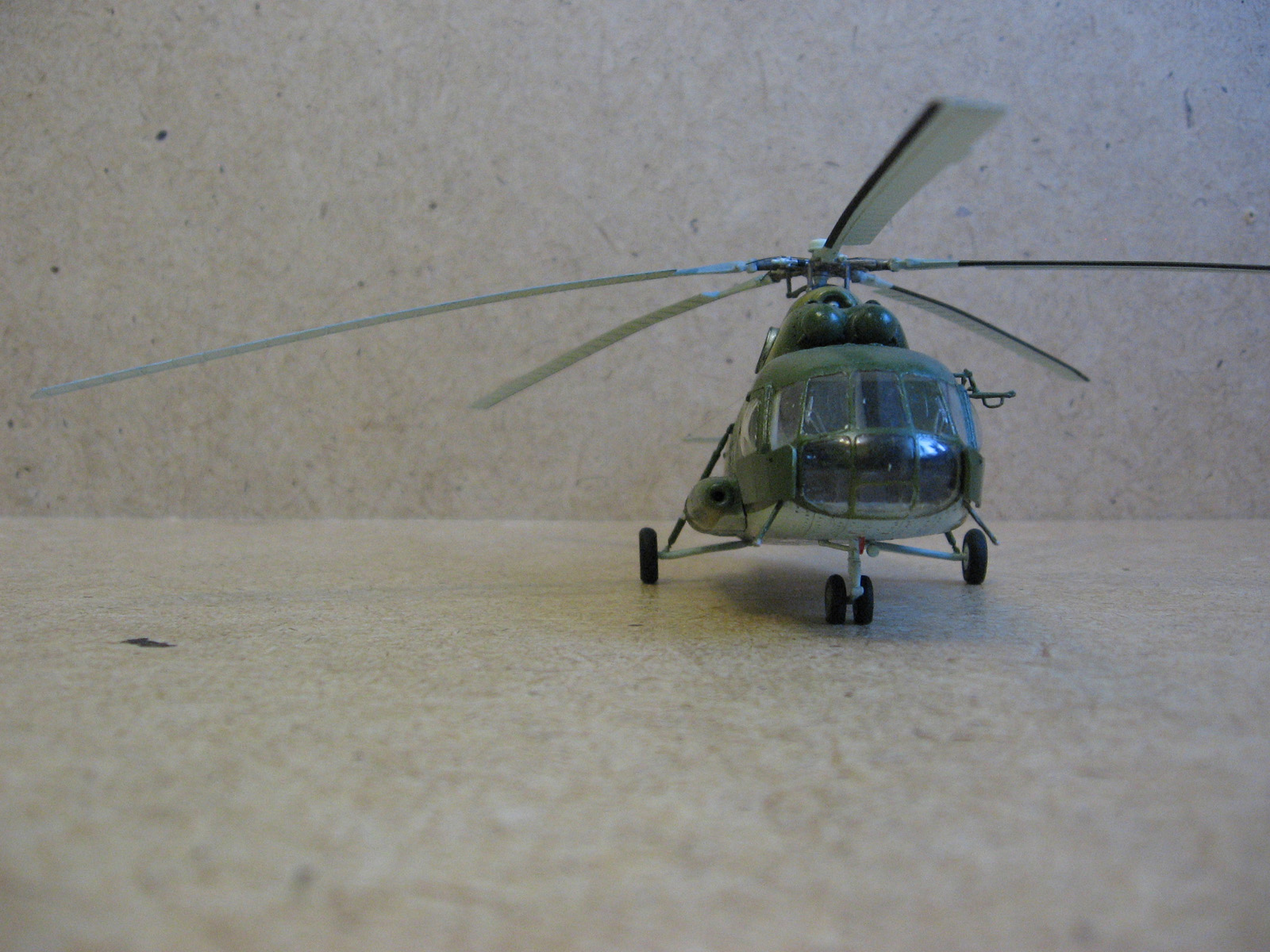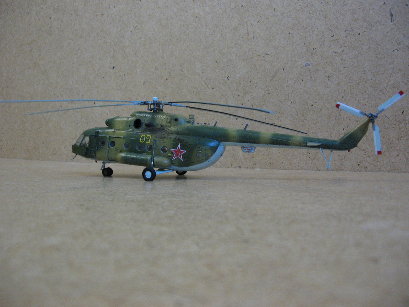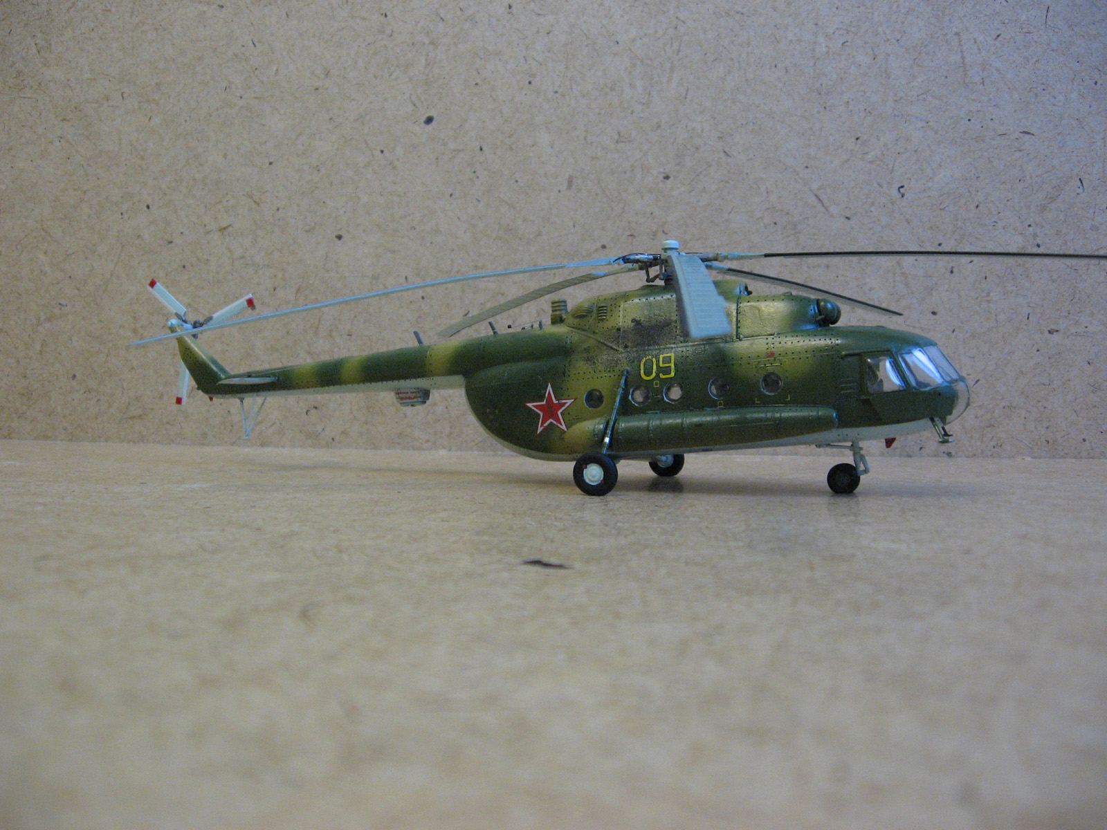 Доброго времени суток Уважаемые моделисты. Хочу представить вам модель ми-8 мт от Hobbyboss. Собирал ее очень долго около года с большими перерывами, т.к. очень мало свободного времени. Собиралась модель легко. Шпаклевки ушло не много. Из доработок сделал хвостовые антенны и попробовал нанести клепку, но с клепкой похоже переборщил- очень крупная получилась,да и редкая очень. В перспективе еще сделать зеркала заднего вида. Красил модель красками modelmaster. Красил аэрографом, затем модель покрывалась глянцевым лаком –смывка- матовый лак. Вертолет немножко блестит , но вроде на настоящих если свежая краска тоже блеск присутствует Никакой исторической привязки нет. Скорей собирательный образ ми-8мт. Жду от вас оценок и советов.