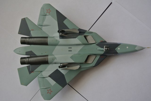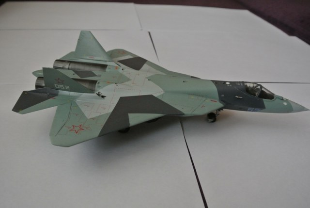 Доброго времени суток .Это мой долгострой,моя первая модель от звезды ПАК ФА. Окрашен красками тамия и звезда из простенького аэрографа. Декали Бегемот.