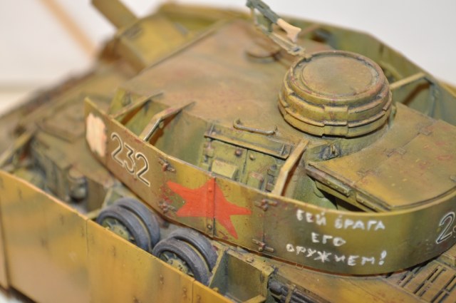 когда то давно модель была собрана и окрашена неопытными руками... прошли годы и она попалась мне опять на глаза. как раз решил освоить камуфляж аэром (думаю не получилось). Решил пусть будет как есть, тока помял немного экраны, ничего не переделывалось не шпаклевалось соответственно матчасть отсутствует как вид. краски пользовал акан и мастер от звезды, масло и пастель. когда настала очередь декалей нашел в запасах тока борт номера, ни крестов ничего подобного, поэтому решил сделать а-ля трофей.(условно номер совпал) ну вроде вкратце все...