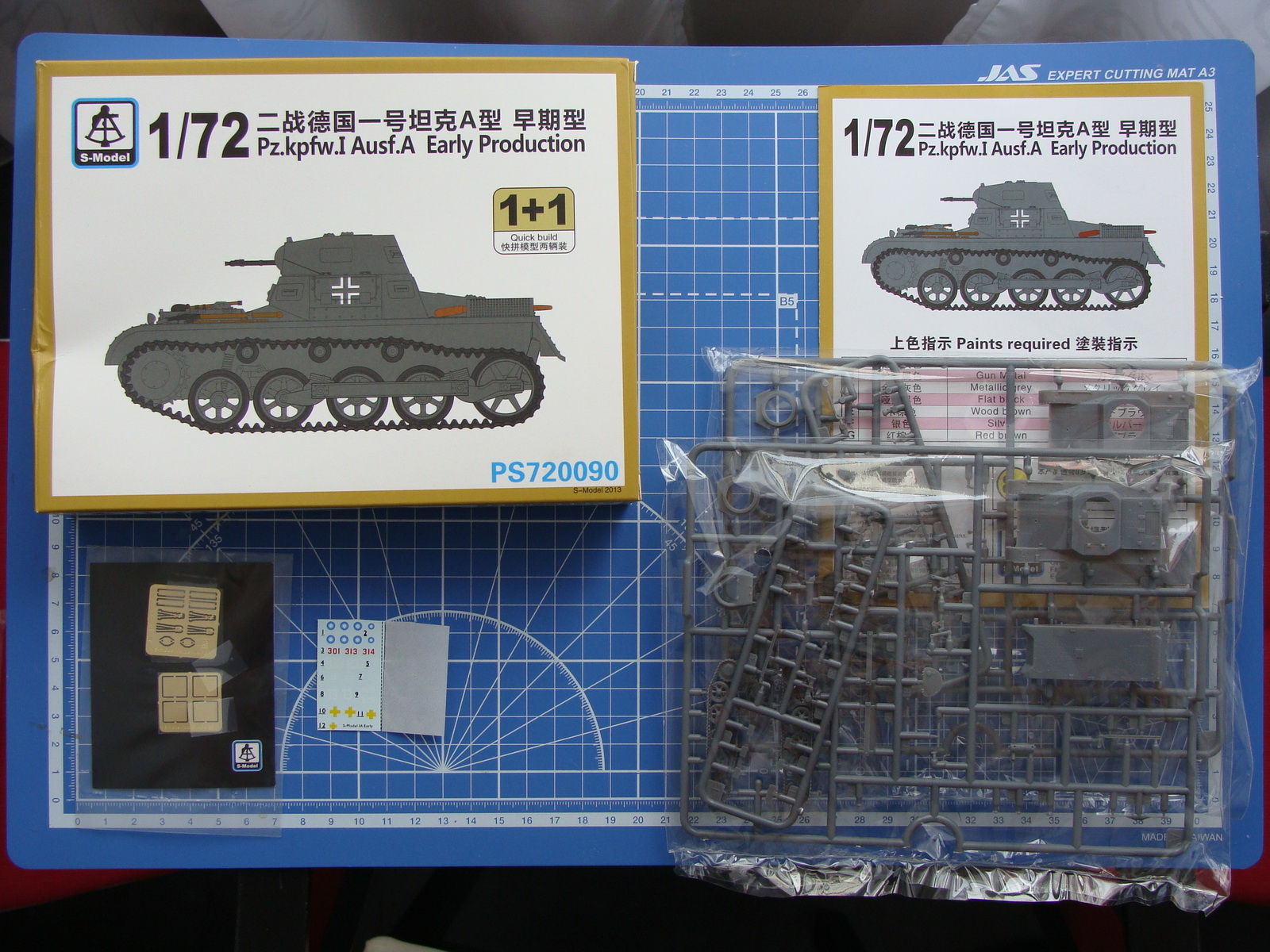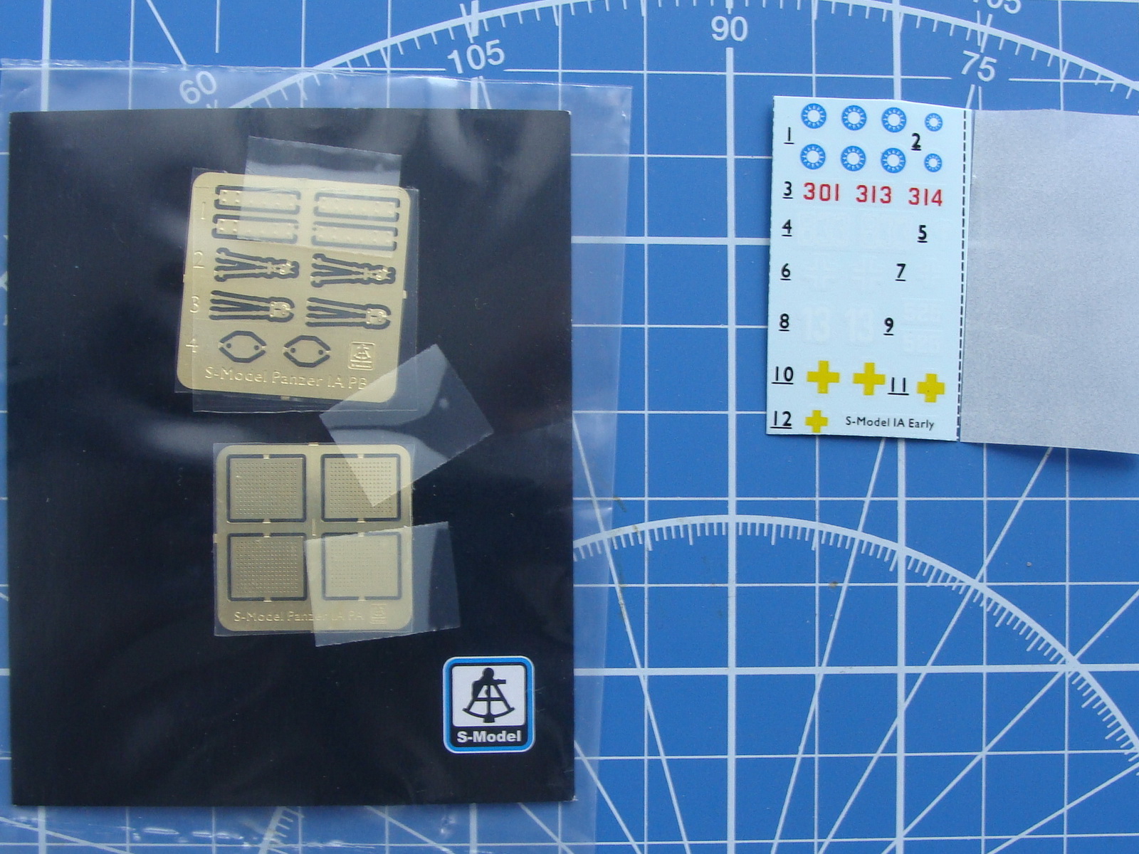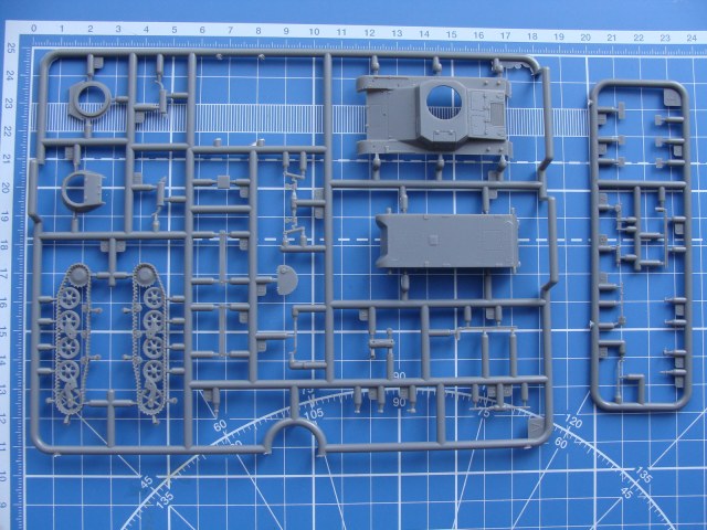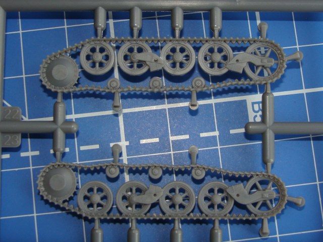 Коробка ,травление,2 модели,отличное литье и очень удовлетворительная прорабока..Опасался за гусеницу, но вот уже 3 дня как модель стоит под носом в буквальном смысле,и склоняюсь к мысли ,что ходовка переделываться не будет ни коим образом.(хотелось сделать рабочую)))) шутка)