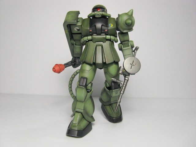 Очень симпатичный Zaku получился! Автомат слегка бы потемнее (можно смывку жесткую с последующим высветлением), но это дело вкуса.Ступни достойно доработаны.