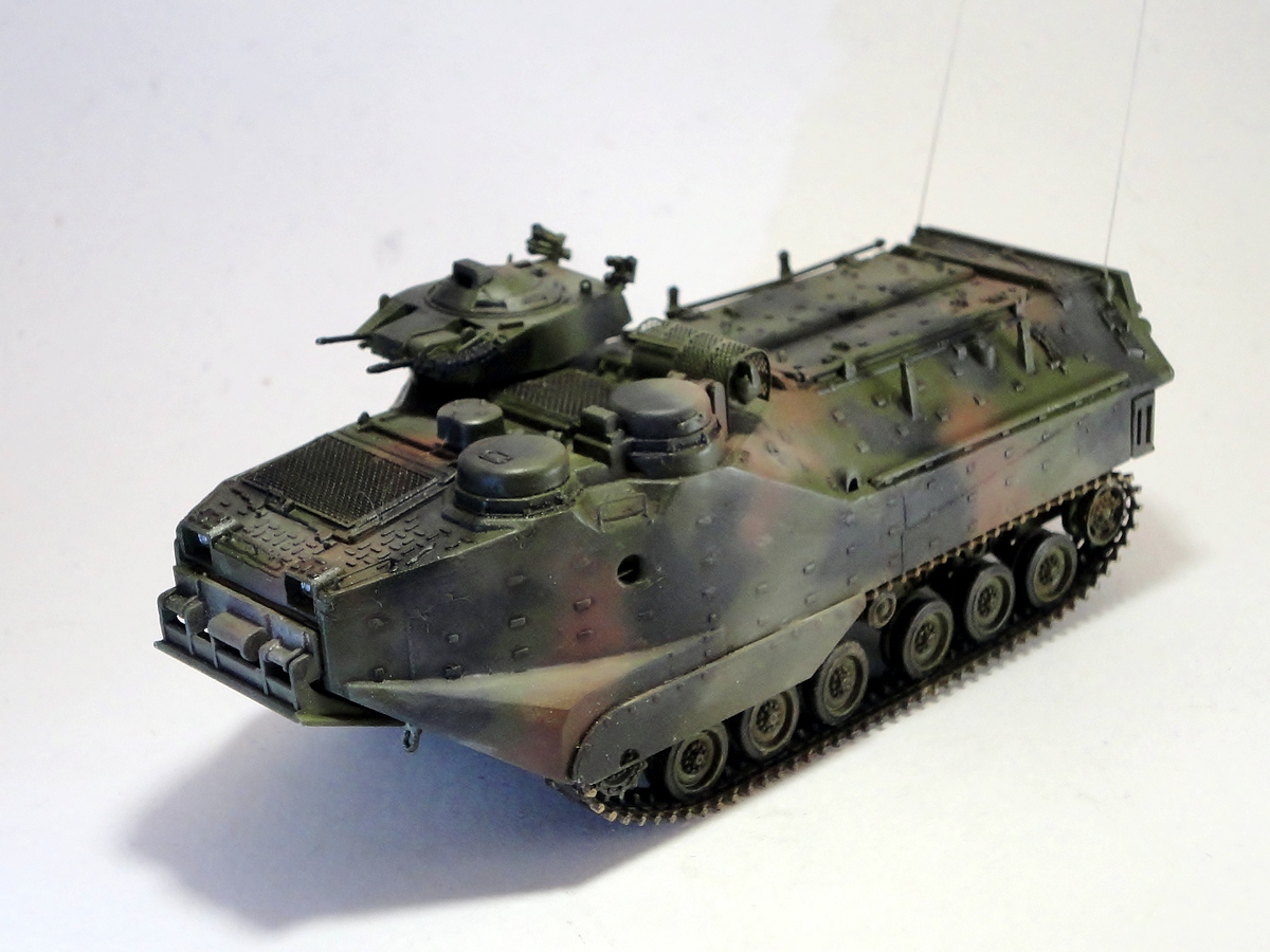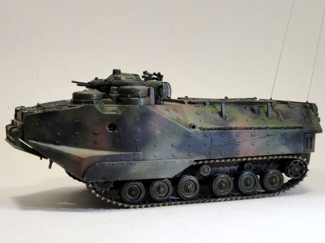 Собрал давно валявшийся у меня Dragon-овский набор AAV7A1. Правда он был с установкой дистанционного разминирования MICLIC, но последнюю пришлось тупо выкинуть, поскольку там внутри все пусто, а это "не комильфо" ( не понятна укладка самого заряда), но и без него этот "имперский бронеход" выглядит достаточно брутально. Модель собирается не без проблем- здоровенный шов между крышей и корпусом, который замучился шпатлевать.
