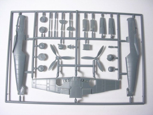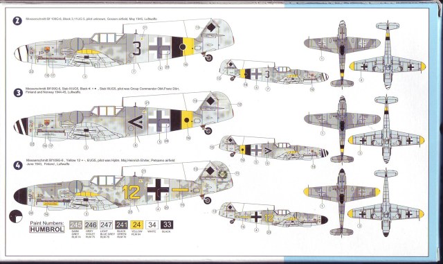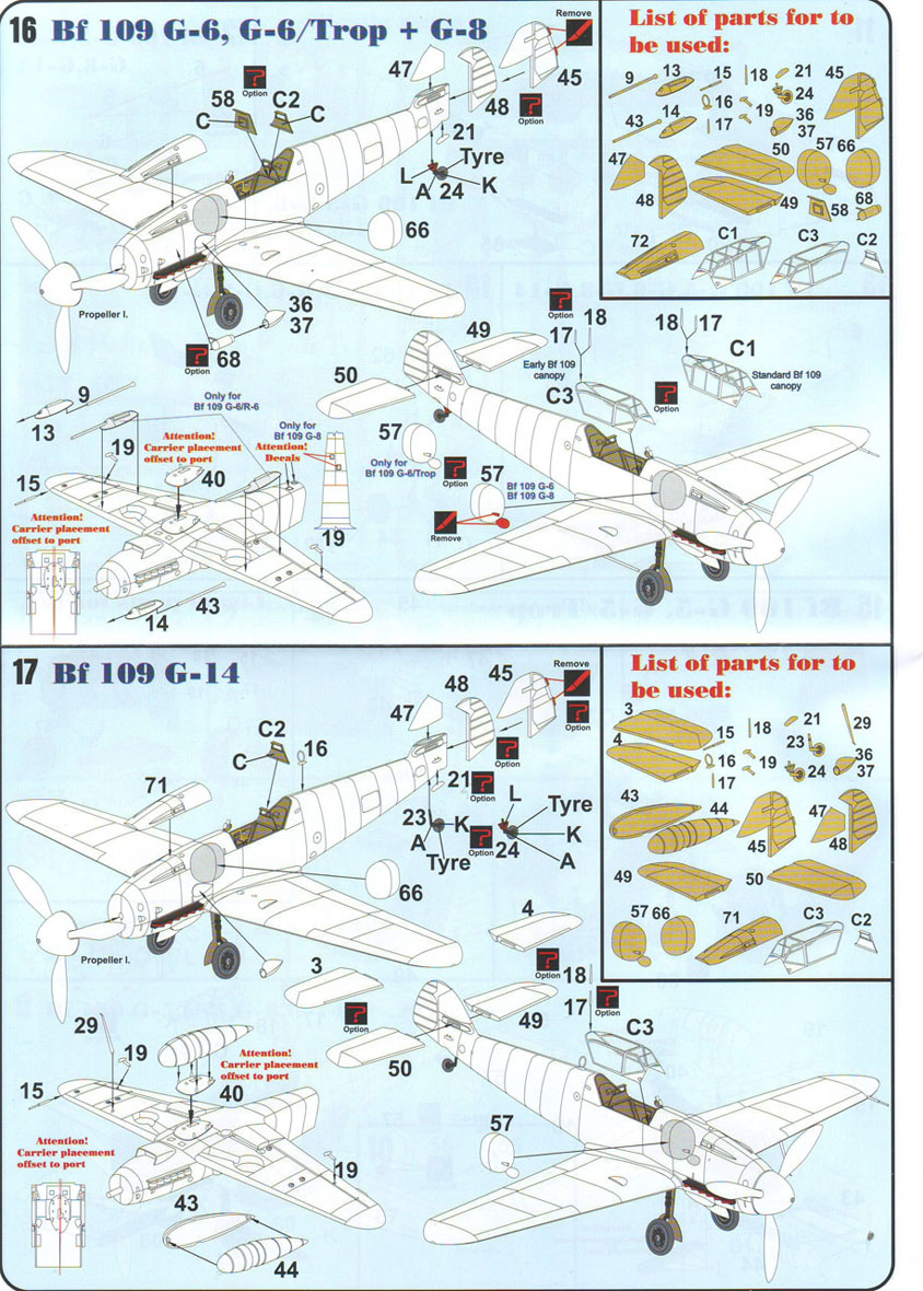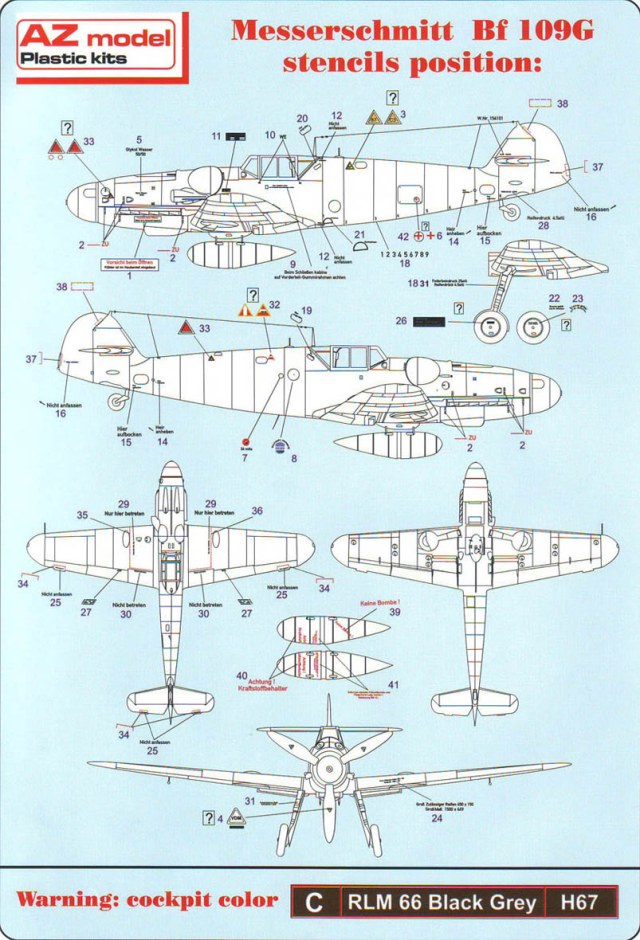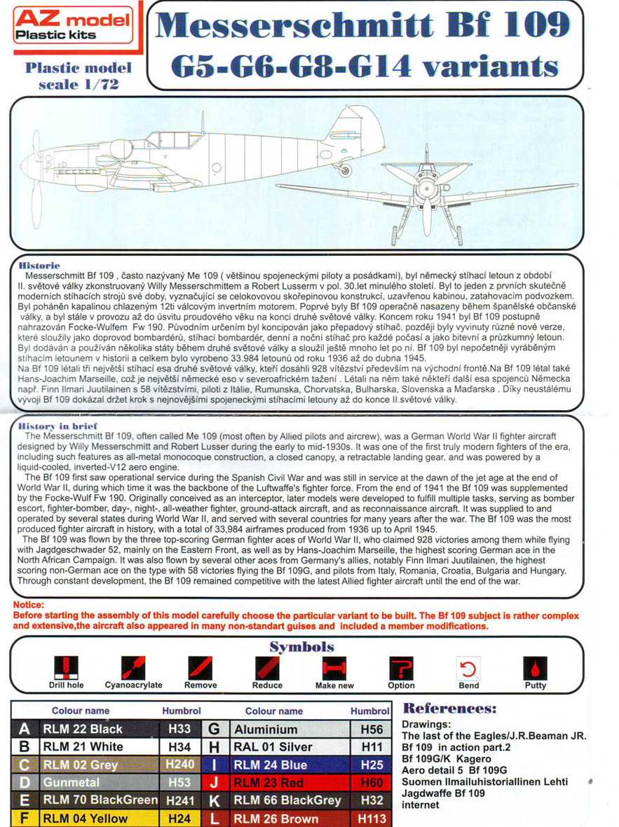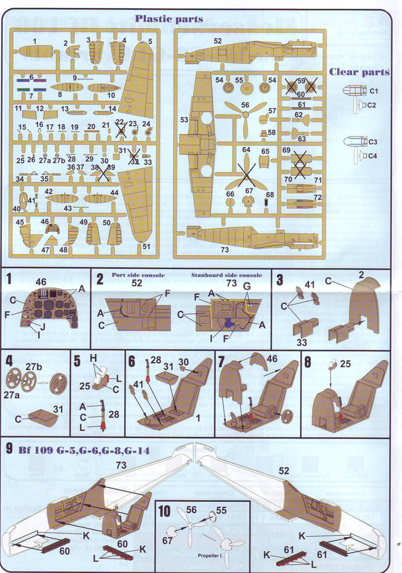 Итак,модели упакованы в небольшую коробку размером 250Х145Х40 мм с боковой загрузкой,на лицевой стороне коробки изображён Bf.109 в одном из вариантов окраски,на тыльной стороне нарисованы остальные 3 варианта окраски.Инструкция на 4-х страницах А4 выполнена в цвете,плюс отдельный лист с подробной схемой нанесения технических надписей,на мелованной бумаге,очень подробная и понятная ,даны рекомендации по окраске деталей интерьера и отдельных частей машины.Сами детали находятся на 2-х литниках серого цвета и одном литнике из прозрачного пластика с фонарём .Отлита модель очень качественно,облой,утяжины и прочие безобразия отсутствуют как класс,небольшие следы толкателей присутствуют только в местах,незаметных на собранной модели.Неплохо проработана поверхность,расшивка тонкая внутренняя,ровная и аккуратная,местами воспроизведена клёпка,полотно на рулевых поверхностях показано имитацией киперных лент.Интерьер кабины заслуживает на мой взгляд отдельной похвалы,часть его качественно отлита на половинках фюзеляжа,задняя часть со спинкой кресла пилота и полом кабины тоже имеет положенный рельеф,педали,штурвалы триммирования,два варианта кожуха пушки,два варианта прицела,чашка сиденья,выпуклая крышка аккумуляторного отсека(для машин с MW50) даны отдельными деталями.Приборная доска выполнена рельефной,плюс даётся декаль для её оформления,можно попробовать сточить её до нужной толщины ,рассверлить отверстия приборов и подложить снизу декаль,должно получиться неплохо.Вообще исполнение кабины очень понравилось,лучшее из виденного мною на Bf.109 в 72м(даст фору даже некоторым в 48м).Фонарь кабины тонкий и прозрачный,только жаль,что дан одной деталью.Также в пластике присутствуют два варианта крышки капота:для машин пр-ва Erla и пр-ва WNF/Mtt Reg,правда имитация пулемётов выполнена не очень удачно,правый пузырь на капоте дан только для машин пр-ва Erla,для получения других предлагается срезать ненужные части.Даётся два варианта киля и руля высоты(стандартный и высокий),два варианта стабилизатора,три варианта хвостового колеса,два варианта воздухозаборника нагнетателя,два варианта лопастей винта.Выхлопные патрубки даны отдельными деталями и выглядят очень неплохо.На внутренних поверхностях верхних половин крыла воспроизведён рельеф верхней части ниш шасси,на нижних половинах крыла отверстия облегчения в нишах и гильзосбросы пулемётов уже прорезаны,створки крыльевых водорадиаторов можно сделать в отклонённом положении,верхнюю подпилить с одного края и отогнуть,нижняя даётся отдельной деталью,створки имеют положенный внутренний рельеф.Стойки шасси вполне на себя похожи,есть два варианта колёс,крыло даётся с маленьким наплывом для стандартных для Г6 колёс,но также присутствуют отдельными деталями и большие обтекатели,для увеличенных колёс.Присутствует тропический фильтр,пилон для ПТБ и два варианта самого ПТБ,даны подвесные пушечные контейнеры.В общем после сборки останется довольно много запасных частей для оформления других моделей.