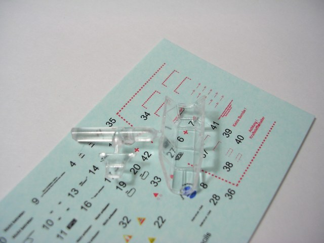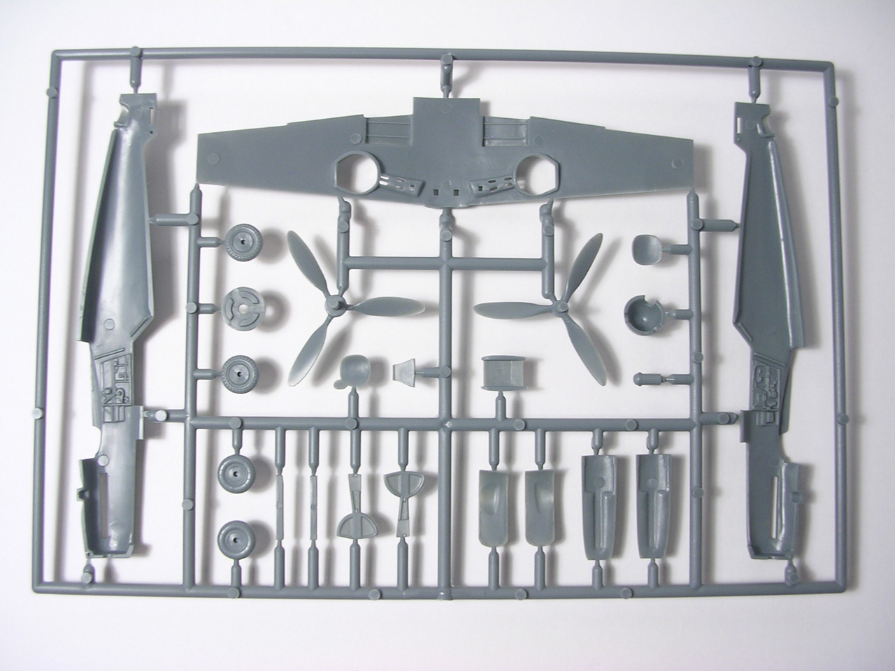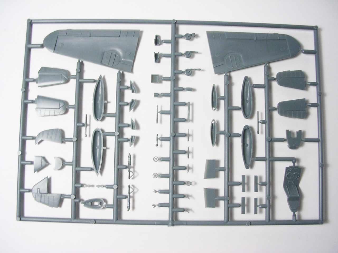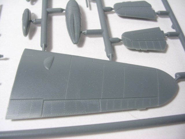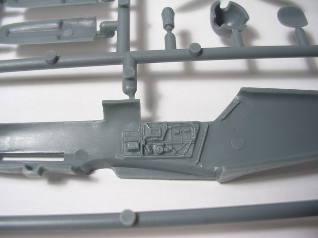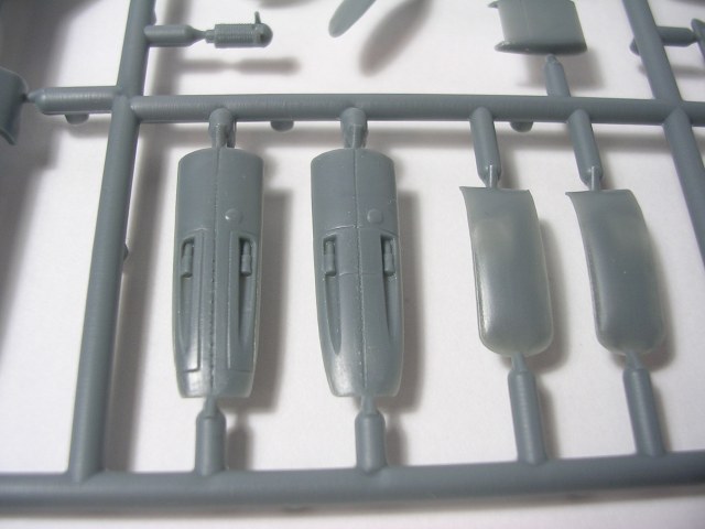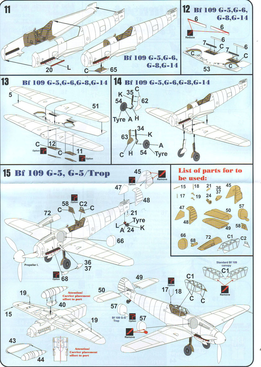 Итак,модели упакованы в небольшую коробку размером 250Х145Х40 мм с боковой загрузкой,на лицевой стороне коробки изображён Bf.109 в одном из вариантов окраски,на тыльной стороне нарисованы остальные 3 варианта окраски.Инструкция на 4-х страницах А4 выполнена в цвете,плюс отдельный лист с подробной схемой нанесения технических надписей,на мелованной бумаге,очень подробная и понятная ,даны рекомендации по окраске деталей интерьера и отдельных частей машины.Сами детали находятся на 2-х литниках серого цвета и одном литнике из прозрачного пластика с фонарём .Отлита модель очень качественно,облой,утяжины и прочие безобразия отсутствуют как класс,небольшие следы толкателей присутствуют только в местах,незаметных на собранной модели.Неплохо проработана поверхность,расшивка тонкая внутренняя,ровная и аккуратная,местами воспроизведена клёпка,полотно на рулевых поверхностях показано имитацией киперных лент.Интерьер кабины заслуживает на мой взгляд отдельной похвалы,часть его качественно отлита на половинках фюзеляжа,задняя часть со спинкой кресла пилота и полом кабины тоже имеет положенный рельеф,педали,штурвалы триммирования,два варианта кожуха пушки,два варианта прицела,чашка сиденья,выпуклая крышка аккумуляторного отсека(для машин с MW50) даны отдельными деталями.Приборная доска выполнена рельефной,плюс даётся декаль для её оформления,можно попробовать сточить её до нужной толщины ,рассверлить отверстия приборов и подложить снизу декаль,должно получиться неплохо.Вообще исполнение кабины очень понравилось,лучшее из виденного мною на Bf.109 в 72м(даст фору даже некоторым в 48м).Фонарь кабины тонкий и прозрачный,только жаль,что дан одной деталью.Также в пластике присутствуют два варианта крышки капота:для машин пр-ва Erla и пр-ва WNF/Mtt Reg,правда имитация пулемётов выполнена не очень удачно,правый пузырь на капоте дан только для машин пр-ва Erla,для получения других предлагается срезать ненужные части.Даётся два варианта киля и руля высоты(стандартный и высокий),два варианта стабилизатора,три варианта хвостового колеса,два варианта воздухозаборника нагнетателя,два варианта лопастей винта.Выхлопные патрубки даны отдельными деталями и выглядят очень неплохо.На внутренних поверхностях верхних половин крыла воспроизведён рельеф верхней части ниш шасси,на нижних половинах крыла отверстия облегчения в нишах и гильзосбросы пулемётов уже прорезаны,створки крыльевых водорадиаторов можно сделать в отклонённом положении,верхнюю подпилить с одного края и отогнуть,нижняя даётся отдельной деталью,створки имеют положенный внутренний рельеф.Стойки шасси вполне на себя похожи,есть два варианта колёс,крыло даётся с маленьким наплывом для стандартных для Г6 колёс,но также присутствуют отдельными деталями и большие обтекатели,для увеличенных колёс.Присутствует тропический фильтр,пилон для ПТБ и два варианта самого ПТБ,даны подвесные пушечные контейнеры.В общем после сборки останется довольно много запасных частей для оформления других моделей.