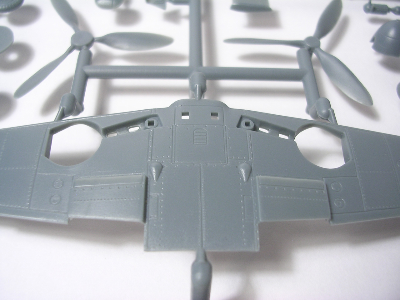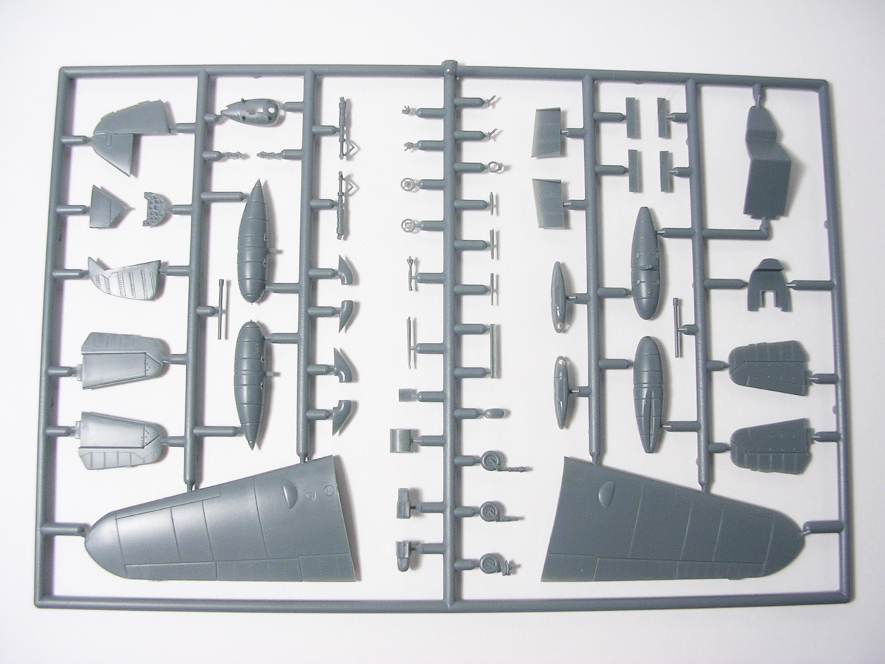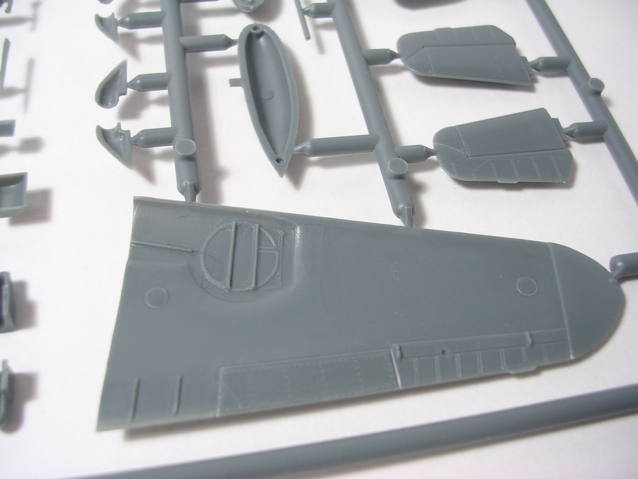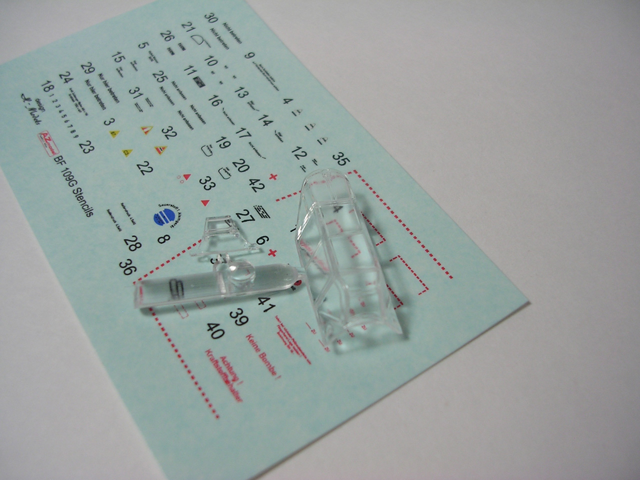 Итак,модели упакованы в небольшую коробку размером 250Х145Х40 мм с боковой загрузкой,на лицевой стороне коробки изображён Bf.109 в одном из вариантов окраски,на тыльной стороне нарисованы остальные 3 варианта окраски.Инструкция на 4-х страницах А4 выполнена в цвете,плюс отдельный лист с подробной схемой нанесения технических надписей,на мелованной бумаге,очень подробная и понятная ,даны рекомендации по окраске деталей интерьера и отдельных частей машины.Сами детали находятся на 2-х литниках серого цвета и одном литнике из прозрачного пластика с фонарём .Отлита модель очень качественно,облой,утяжины и прочие безобразия отсутствуют как класс,небольшие следы толкателей присутствуют только в местах,незаметных на собранной модели.Неплохо проработана поверхность,расшивка тонкая внутренняя,ровная и аккуратная,местами воспроизведена клёпка,полотно на рулевых поверхностях показано имитацией киперных лент.Интерьер кабины заслуживает на мой взгляд отдельной похвалы,часть его качественно отлита на половинках фюзеляжа,задняя часть со спинкой кресла пилота и полом кабины тоже имеет положенный рельеф,педали,штурвалы триммирования,два варианта кожуха пушки,два варианта прицела,чашка сиденья,выпуклая крышка аккумуляторного отсека(для машин с MW50) даны отдельными деталями.Приборная доска выполнена рельефной,плюс даётся декаль для её оформления,можно попробовать сточить её до нужной толщины ,рассверлить отверстия приборов и подложить снизу декаль,должно получиться неплохо.Вообще исполнение кабины очень понравилось,лучшее из виденного мною на Bf.109 в 72м(даст фору даже некоторым в 48м).Фонарь кабины тонкий и прозрачный,только жаль,что дан одной деталью.Также в пластике присутствуют два варианта крышки капота:для машин пр-ва Erla и пр-ва WNF/Mtt Reg,правда имитация пулемётов выполнена не очень удачно,правый пузырь на капоте дан только для машин пр-ва Erla,для получения других предлагается срезать ненужные части.Даётся два варианта киля и руля высоты(стандартный и высокий),два варианта стабилизатора,три варианта хвостового колеса,два варианта воздухозаборника нагнетателя,два варианта лопастей винта.Выхлопные патрубки даны отдельными деталями и выглядят очень неплохо.На внутренних поверхностях верхних половин крыла воспроизведён рельеф верхней части ниш шасси,на нижних половинах крыла отверстия облегчения в нишах и гильзосбросы пулемётов уже прорезаны,створки крыльевых водорадиаторов можно сделать в отклонённом положении,верхнюю подпилить с одного края и отогнуть,нижняя даётся отдельной деталью,створки имеют положенный внутренний рельеф.Стойки шасси вполне на себя похожи,есть два варианта колёс,крыло даётся с маленьким наплывом для стандартных для Г6 колёс,но также присутствуют отдельными деталями и большие обтекатели,для увеличенных колёс.Присутствует тропический фильтр,пилон для ПТБ и два варианта самого ПТБ,даны подвесные пушечные контейнеры.В общем после сборки останется довольно много запасных частей для оформления других моделей.