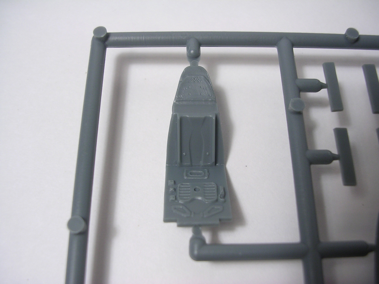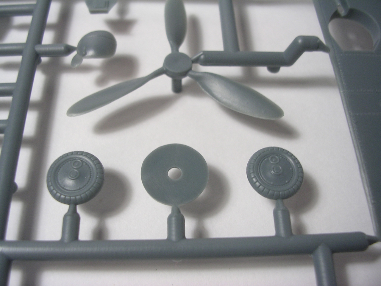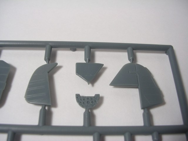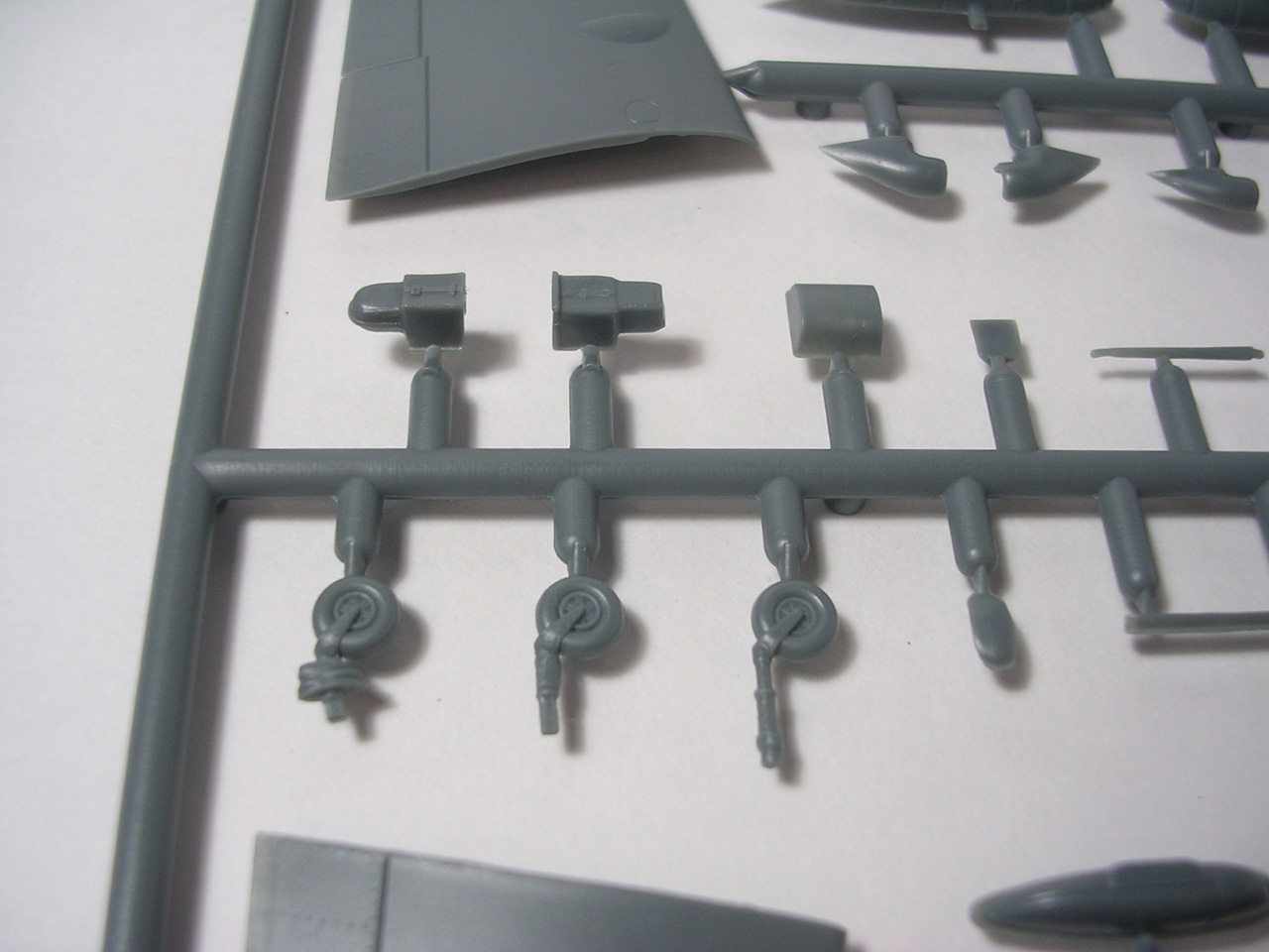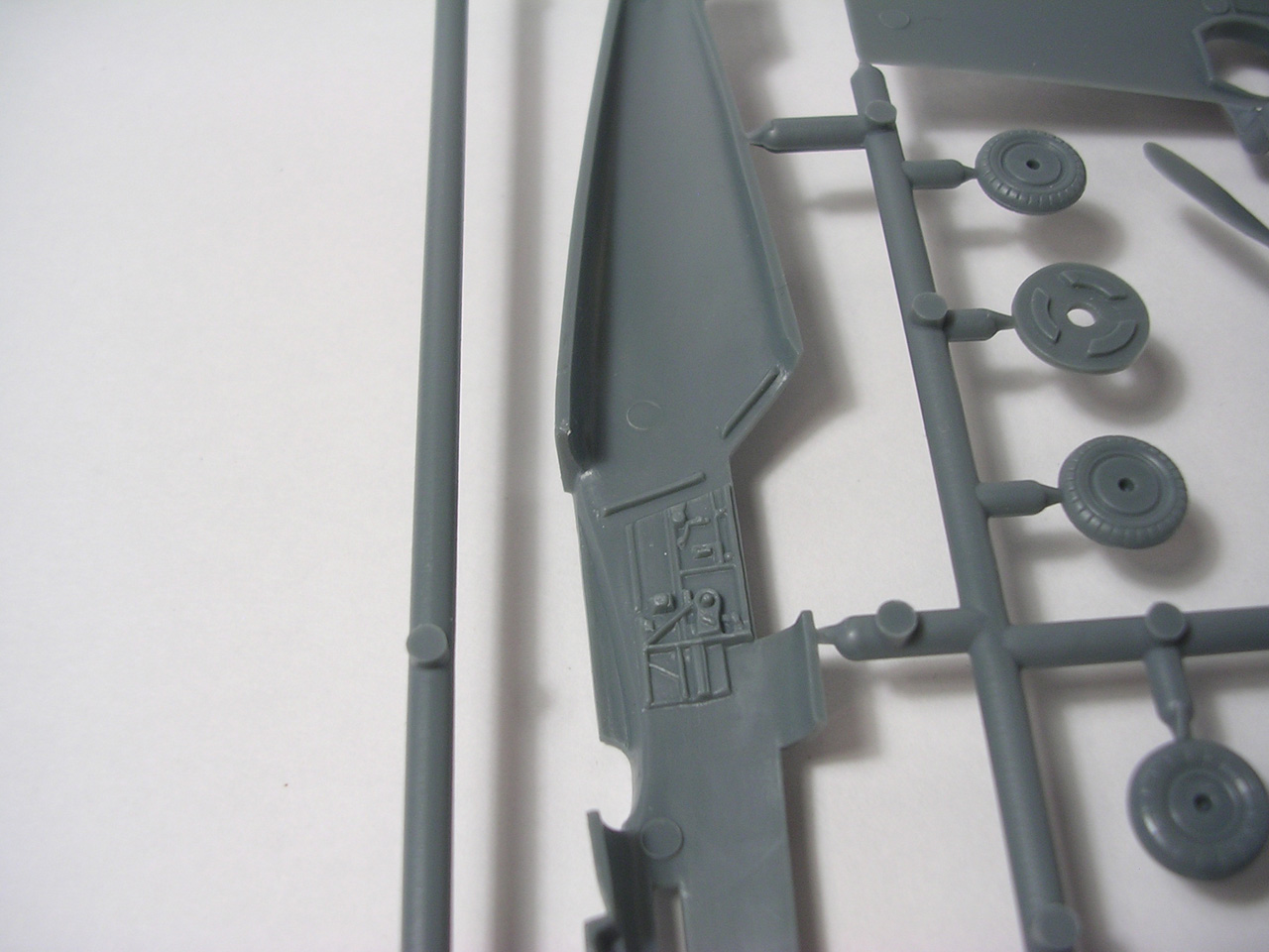 Итак,модели упакованы в небольшую коробку размером 250Х145Х40 мм с боковой загрузкой,на лицевой стороне коробки изображён Bf.109 в одном из вариантов окраски,на тыльной стороне нарисованы остальные 3 варианта окраски.Инструкция на 4-х страницах А4 выполнена в цвете,плюс отдельный лист с подробной схемой нанесения технических надписей,на мелованной бумаге,очень подробная и понятная ,даны рекомендации по окраске деталей интерьера и отдельных частей машины.Сами детали находятся на 2-х литниках серого цвета и одном литнике из прозрачного пластика с фонарём .Отлита модель очень качественно,облой,утяжины и прочие безобразия отсутствуют как класс,небольшие следы толкателей присутствуют только в местах,незаметных на собранной модели.Неплохо проработана поверхность,расшивка тонкая внутренняя,ровная и аккуратная,местами воспроизведена клёпка,полотно на рулевых поверхностях показано имитацией киперных лент.Интерьер кабины заслуживает на мой взгляд отдельной похвалы,часть его качественно отлита на половинках фюзеляжа,задняя часть со спинкой кресла пилота и полом кабины тоже имеет положенный рельеф,педали,штурвалы триммирования,два варианта кожуха пушки,два варианта прицела,чашка сиденья,выпуклая крышка аккумуляторного отсека(для машин с MW50) даны отдельными деталями.Приборная доска выполнена рельефной,плюс даётся декаль для её оформления,можно попробовать сточить её до нужной толщины ,рассверлить отверстия приборов и подложить снизу декаль,должно получиться неплохо.Вообще исполнение кабины очень понравилось,лучшее из виденного мною на Bf.109 в 72м(даст фору даже некоторым в 48м).Фонарь кабины тонкий и прозрачный,только жаль,что дан одной деталью.Также в пластике присутствуют два варианта крышки капота:для машин пр-ва Erla и пр-ва WNF/Mtt Reg,правда имитация пулемётов выполнена не очень удачно,правый пузырь на капоте дан только для машин пр-ва Erla,для получения других предлагается срезать ненужные части.Даётся два варианта киля и руля высоты(стандартный и высокий),два варианта стабилизатора,три варианта хвостового колеса,два варианта воздухозаборника нагнетателя,два варианта лопастей винта.Выхлопные патрубки даны отдельными деталями и выглядят очень неплохо.На внутренних поверхностях верхних половин крыла воспроизведён рельеф верхней части ниш шасси,на нижних половинах крыла отверстия облегчения в нишах и гильзосбросы пулемётов уже прорезаны,створки крыльевых водорадиаторов можно сделать в отклонённом положении,верхнюю подпилить с одного края и отогнуть,нижняя даётся отдельной деталью,створки имеют положенный внутренний рельеф.Стойки шасси вполне на себя похожи,есть два варианта колёс,крыло даётся с маленьким наплывом для стандартных для Г6 колёс,но также присутствуют отдельными деталями и большие обтекатели,для увеличенных колёс.Присутствует тропический фильтр,пилон для ПТБ и два варианта самого ПТБ,даны подвесные пушечные контейнеры.В общем после сборки останется довольно много запасных частей для оформления других моделей.