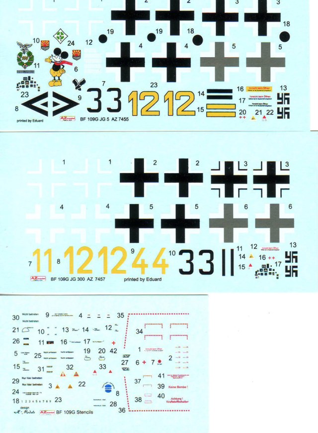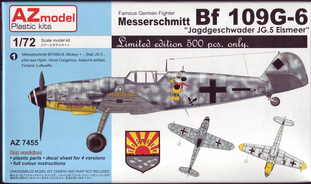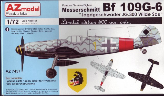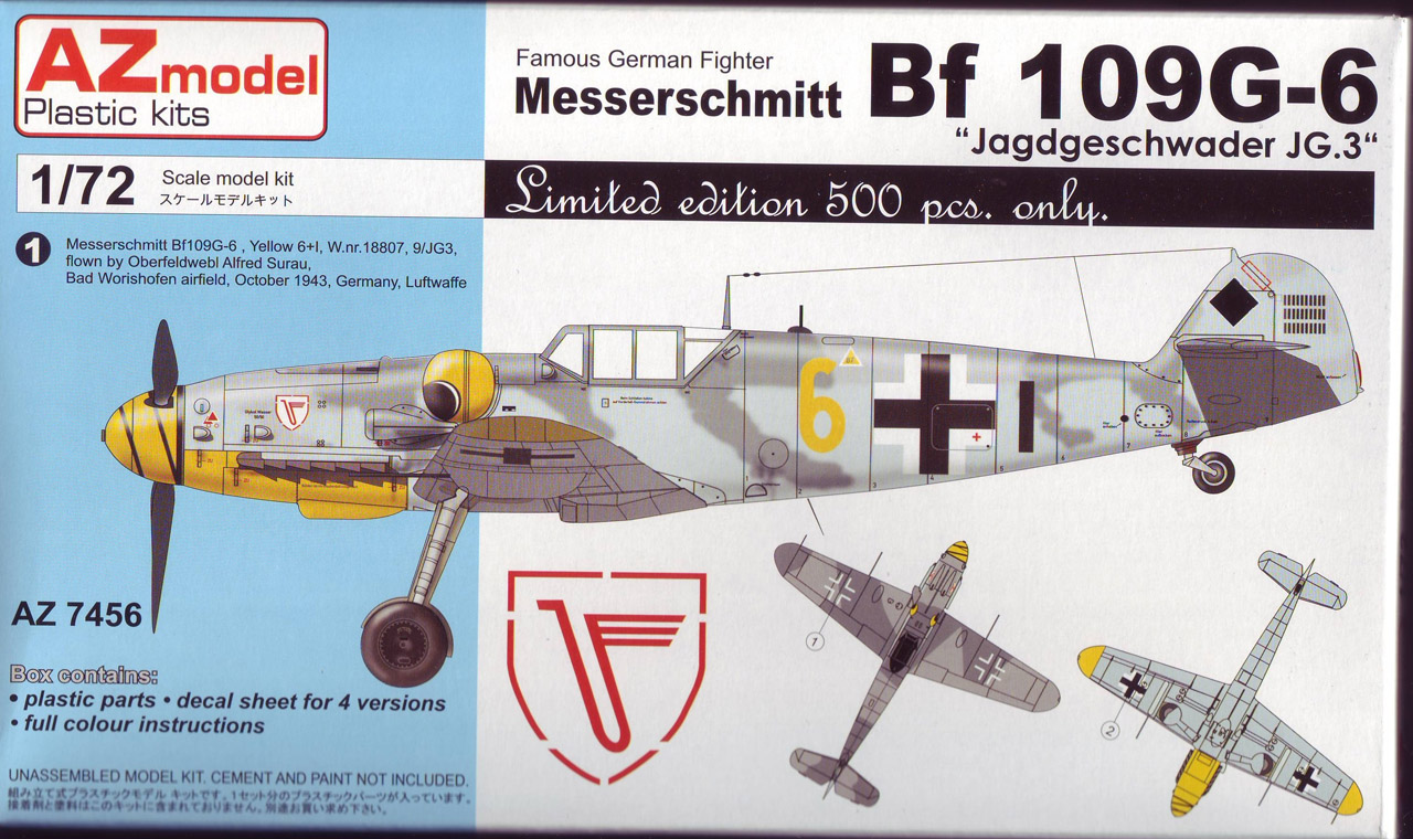 Здравствуйте,хочу поделиться обзором новых моделей Bf.109 от чешской фирмы AZmodel,представленные модели вышли ограниченным тиражом в 500 штук по специальной цене,пластик во всех моделях один и тот же ,отличия только в предлагаемых вариантах окраски и соответственно в декалях(это относится и к другим моделям Bf.109 производимыми AZmodel,но выпущенными в обычной упаковке)