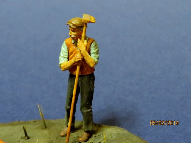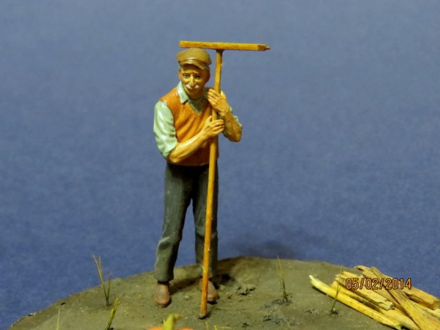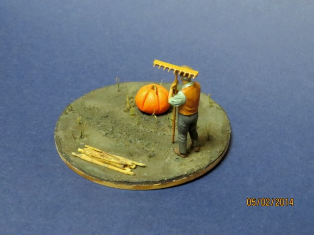 Всем привет Вот я закончил свою первую виньетку, первую роспись фигуры в 35. Фигурка - от МВ, тыква - самодел из пластики, трава - лен и старая кисть, дрова - спички, земля - шпатлевка + акрил, тонировал маслом и пастелью.