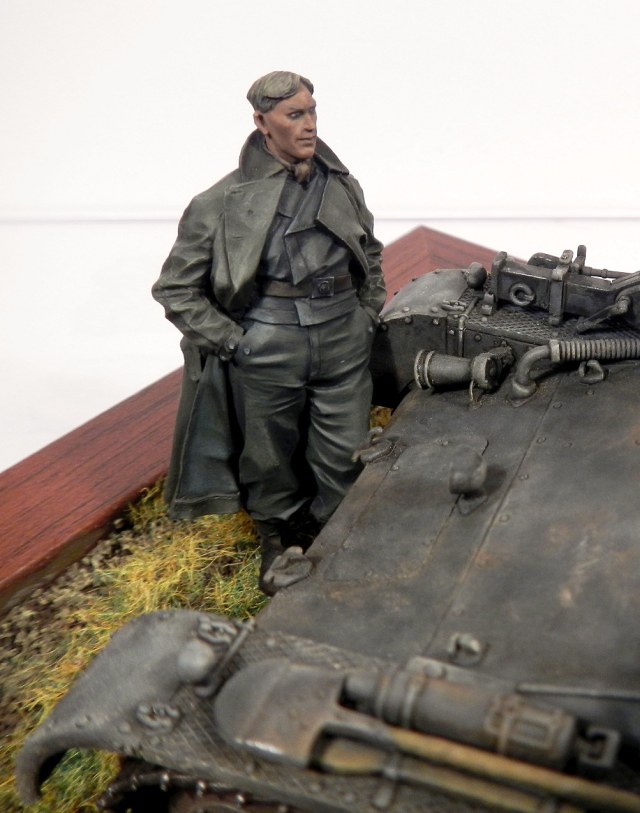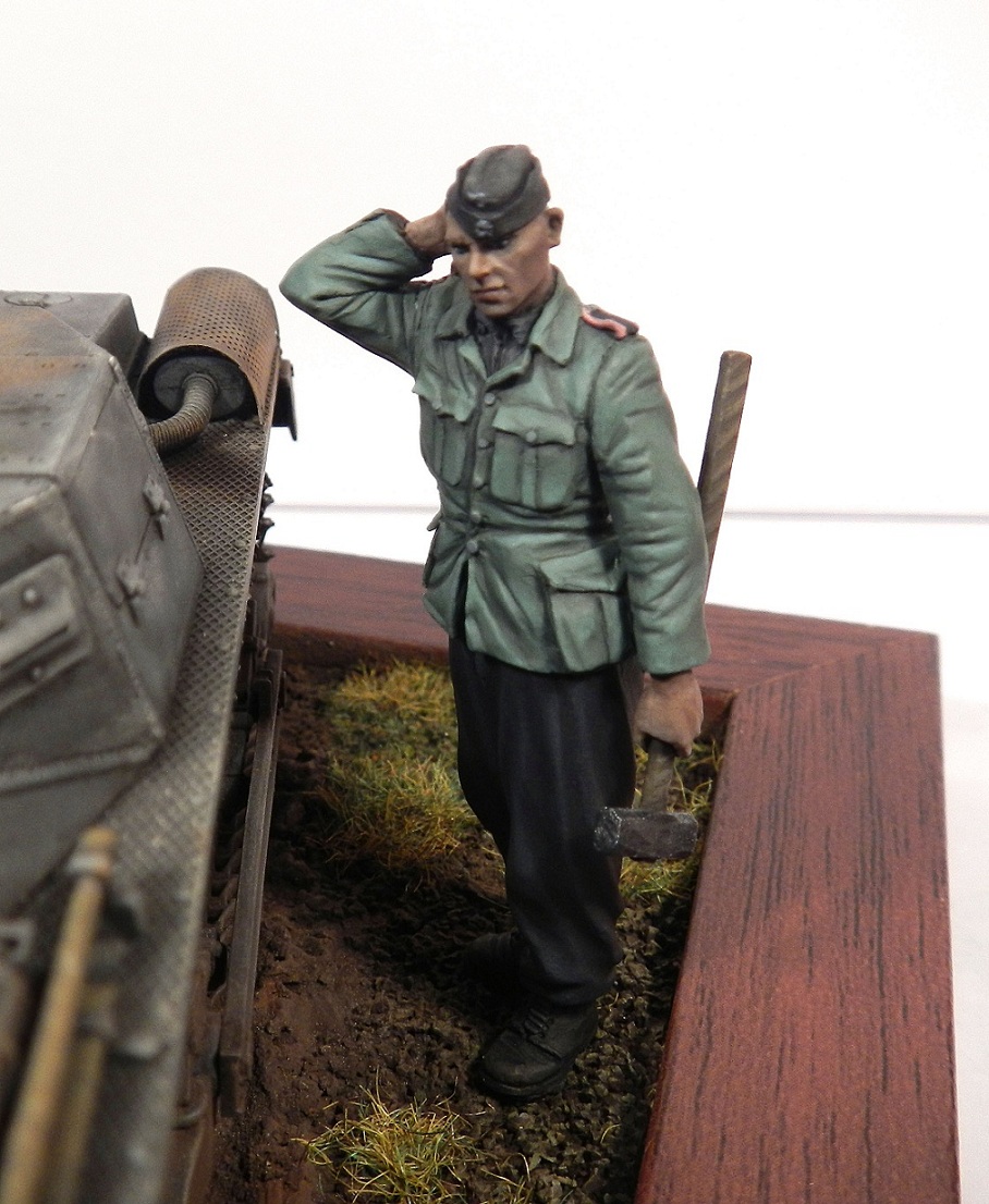Михаил , а с пуговицами что где забыл ? Орел у командира машины - действительно забыл , есть грех , заметил уже после монтажа на башню - не рискну дорисовывать . На рабочей куртке у солдата с кувалдой орла быть не должно , как , собственно и погон , но их срезать не стал , т.к. роспись этой фигуры давняя и фотографий того элемента формы , который имел ввиду Блескин , когда ее лепил я не нашел . Собственно не нашел я их и сейчас , только упоминание о светлозеленом рабочем комплекте для экипажей бронетехники и обслуживающего персонала на котором знаки отличия либо отсутствовали , либо имели вид знаков отличия двухсторонних костюмов (полоски и венки на рукаве).