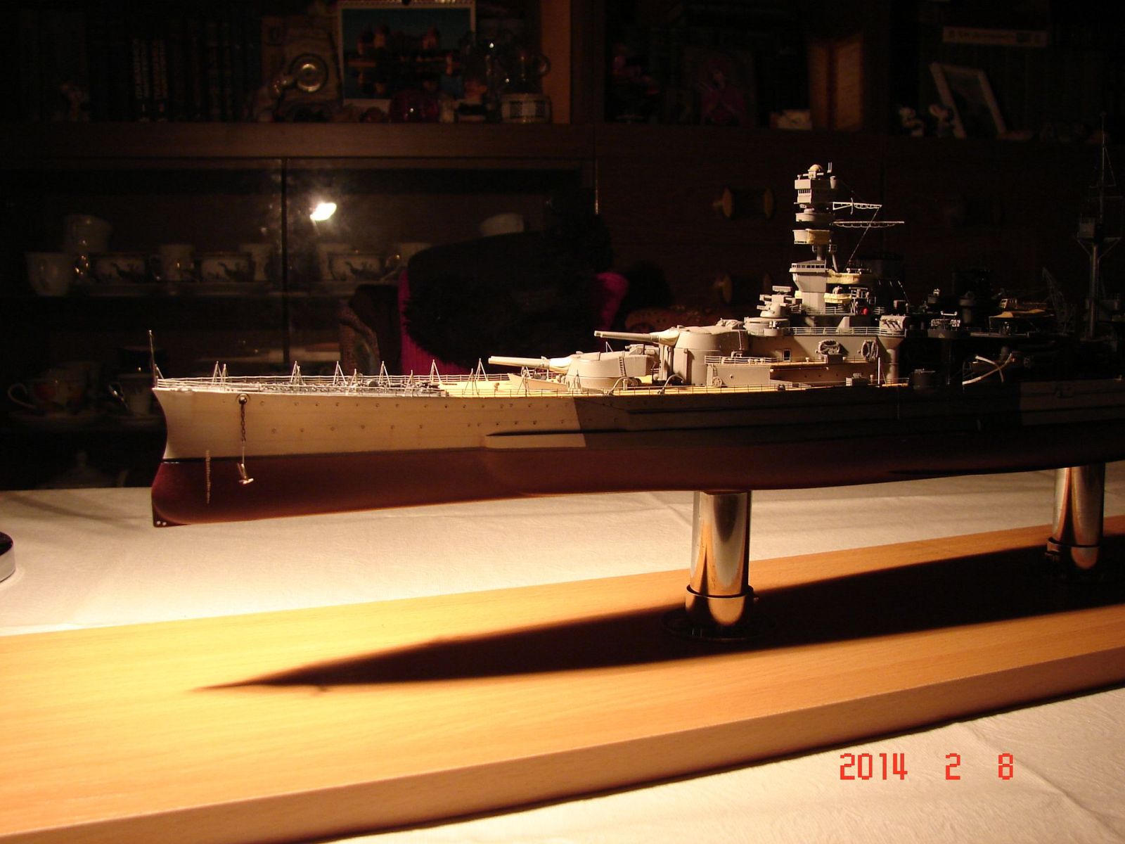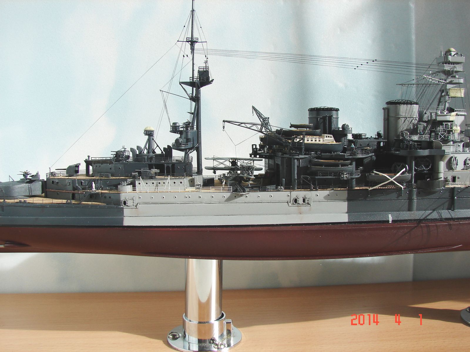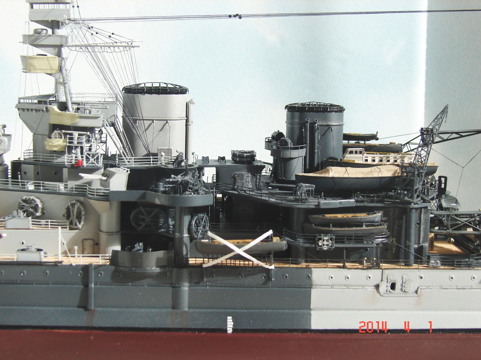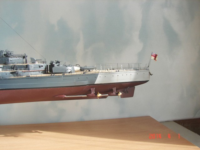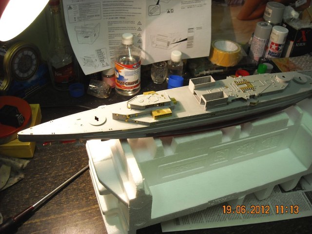 Сборка оказалась нелёгкой. Корпус пришлось шпаклевать, грунтовать, шпаклевать, грунтовать, бороться с трещинами, шпаклевать и т.д. Получилось – как получилось. Скажу точно – больше с такого типа корпусами не связываюсь. Проще, думаю, пошпангоутно самому собрать. Теперь на будущее только вертикальный разрез. Да и с надстройками мне было очень весело (вторая башня сидит на саморезе, кормовая надстройка вообще пошла винтом, мачта, уже в самом конце такелажных работ, отклеилась и всю конструкцию пришлось ломать, мачту укреплять, отчего вид её, мягко говоря, не соответствует прототипу из-за "подпятников" и т. д.). Косяков оказалось достаточно у всех – у меня, у Трумпа, и у Флая. Но если с Трумпом и со мной всё понятно, то почему дядя Флай, к примеру, не довёл “сарайчик” у кормовой надстройки по правому борту до торца этой надстройки – вопрос к дяде Флаю. А почему в травлении надстроек катеров Флай дал их целиковыми, когда есть куча фото этих катеров– тоже вопрос. Ну и так далее. Как всегда, очень мешало различие между окраской горизонтальных и вертикальных поверхностей.