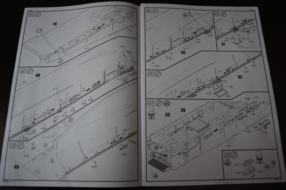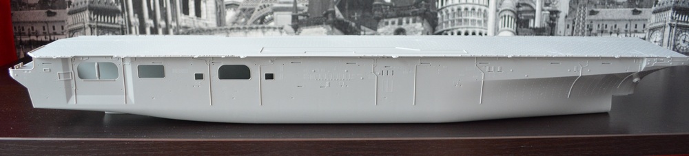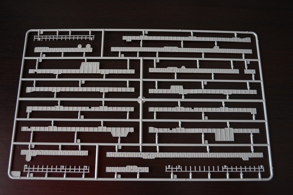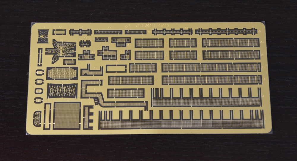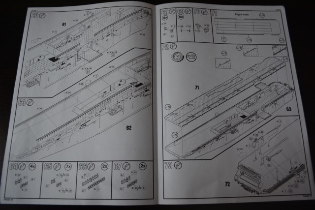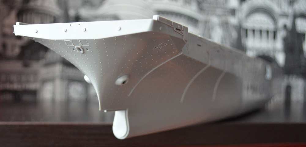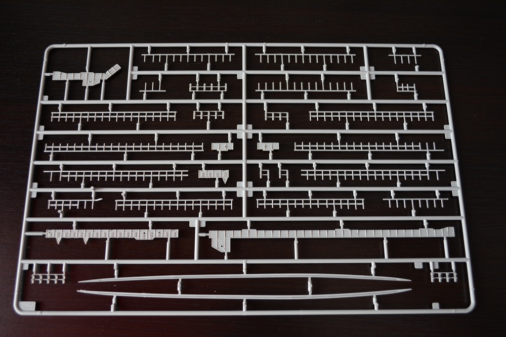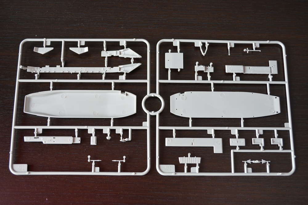 Теперь о модели. Всё упаковано в большую каропку из плотного гофракартона. Внутри корпус корабля, гора литников в пакетах, каробочка с прозрачными литниками, три листа травления, декальи и инструкция. Корпус отлит одной деталью, только бульб приклеивается отдельно. Полетная палуба дана одной деталью, что тоже весьма удобно. Набор позволяет сделать потроха корабля, доковую палубу, хранилище техники и ангарную палубу. Помимо корабля производитель даёт ещё почти всю боевую группу: два десантных корабля на воздушной подушке, две баржи десантные, куча вертолетов и самолетов, а также танки грузовики пушки и тп. Качество литья очень порадовало, облоя утяжин и прочих неприятностей не обнаруженно. проработке мелочей на высоте. Травленка вроде приемлемая по качеству, но тем не менее я заказал комплект травла от ка-моделс.