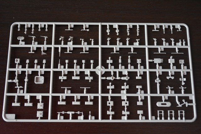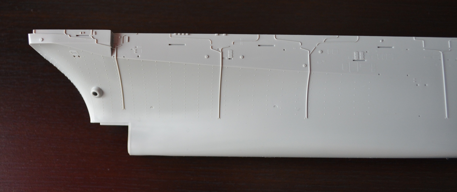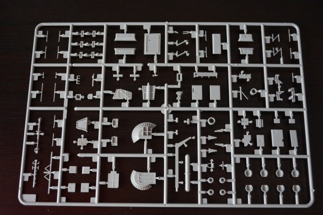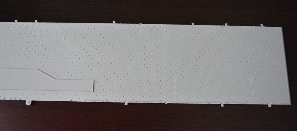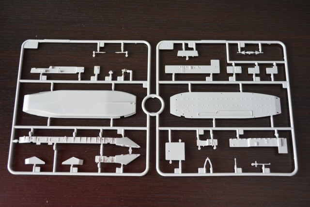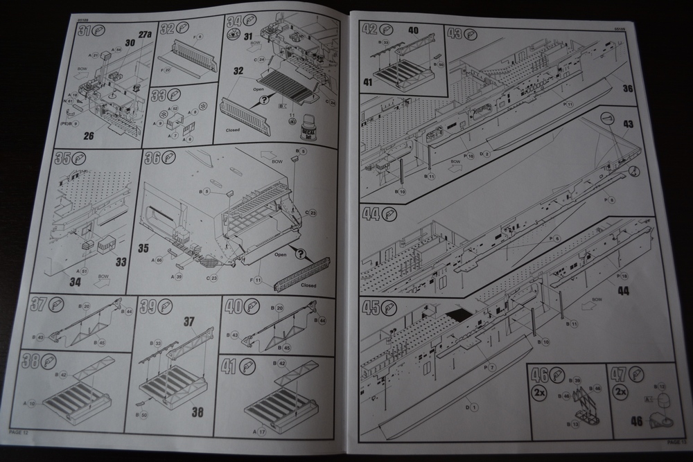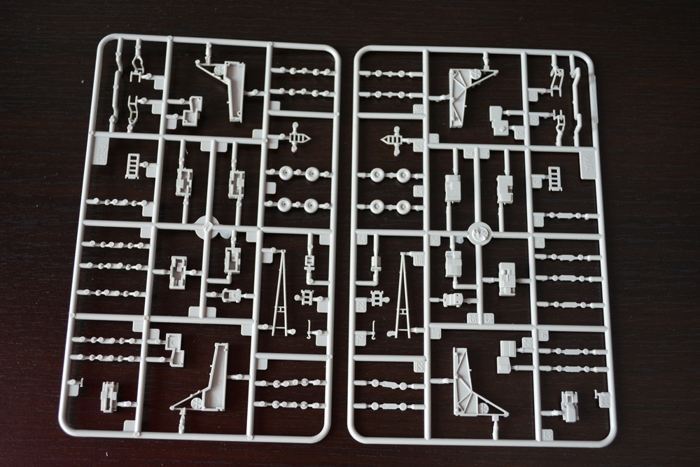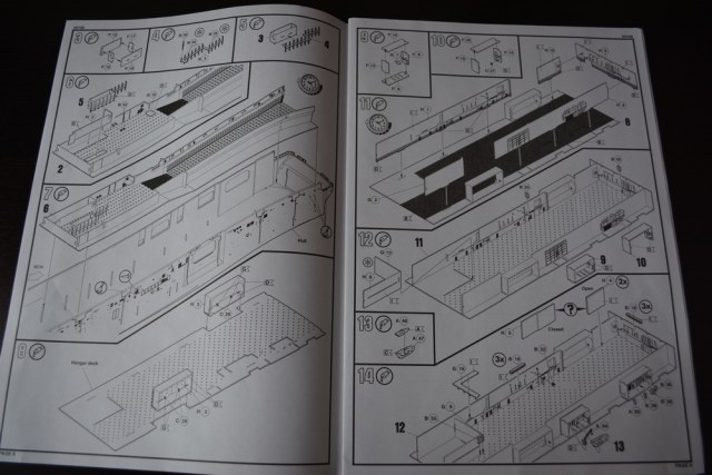 Теперь о модели. Всё упаковано в большую каропку из плотного гофракартона. Внутри корпус корабля, гора литников в пакетах, каробочка с прозрачными литниками, три листа травления, декальи и инструкция. Корпус отлит одной деталью, только бульб приклеивается отдельно. Полетная палуба дана одной деталью, что тоже весьма удобно. Набор позволяет сделать потроха корабля, доковую палубу, хранилище техники и ангарную палубу. Помимо корабля производитель даёт ещё почти всю боевую группу: два десантных корабля на воздушной подушке, две баржи десантные, куча вертолетов и самолетов, а также танки грузовики пушки и тп. Качество литья очень порадовало, облоя утяжин и прочих неприятностей не обнаруженно. проработке мелочей на высоте. Травленка вроде приемлемая по качеству, но тем не менее я заказал комплект травла от ка-моделс.
