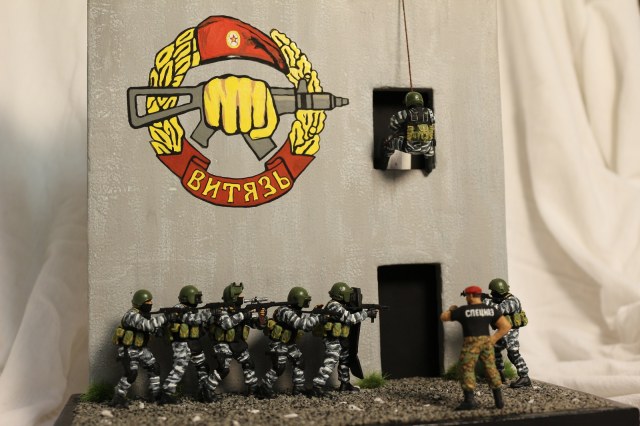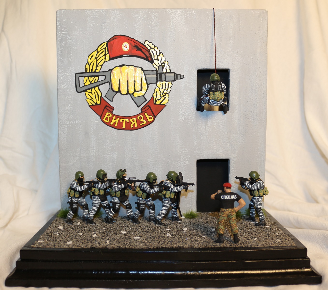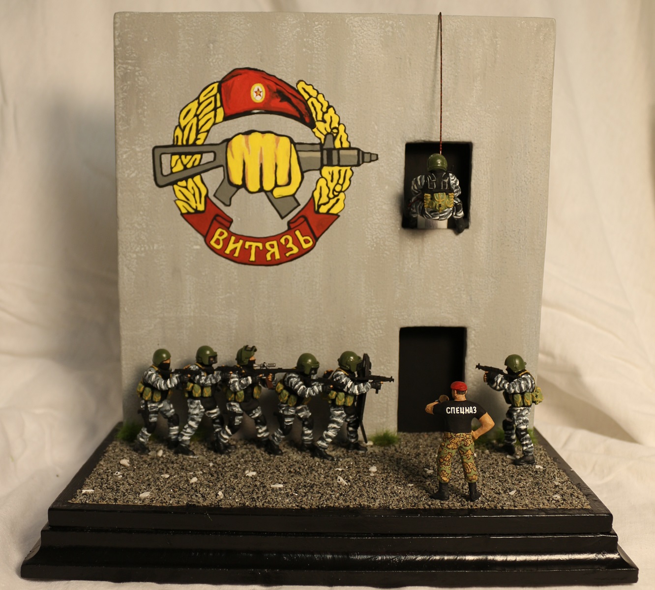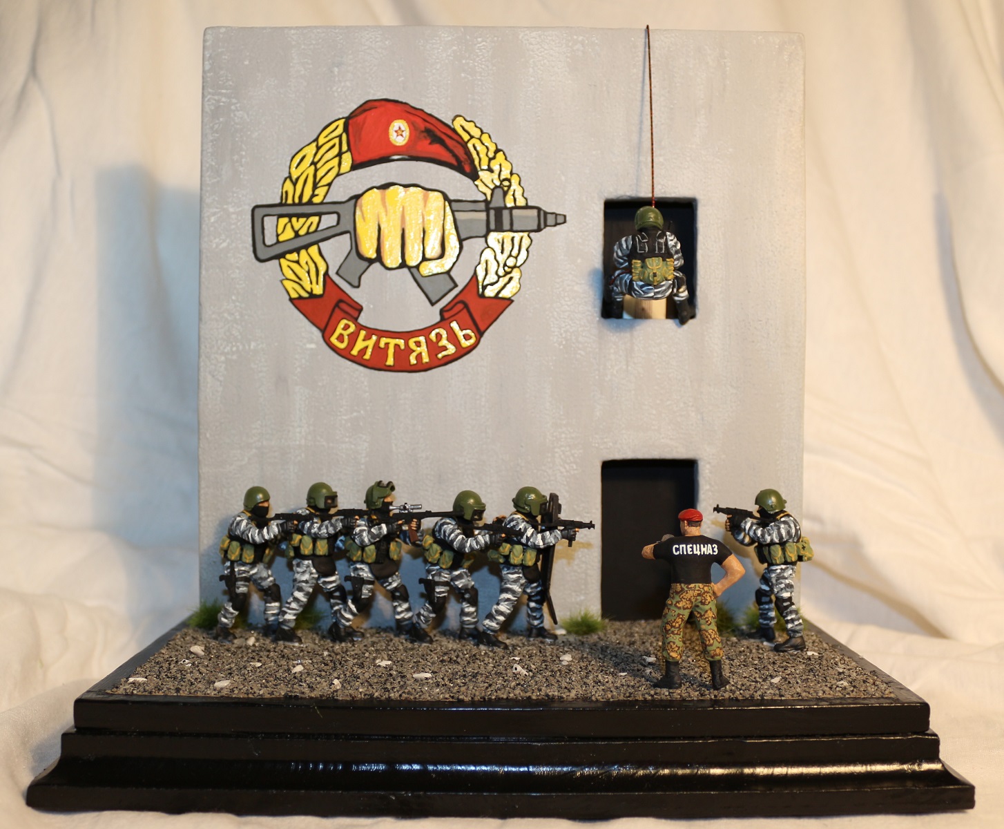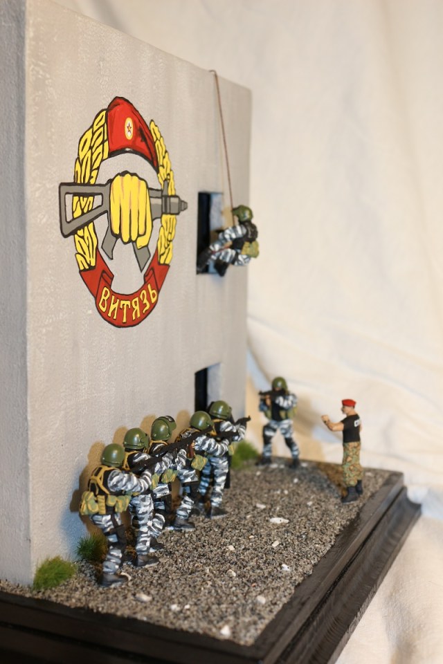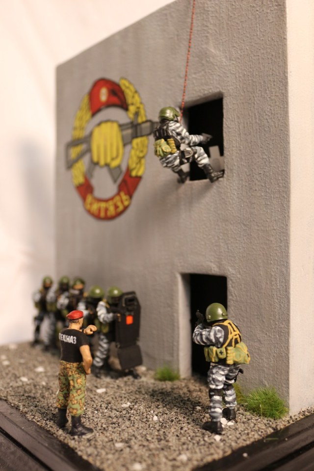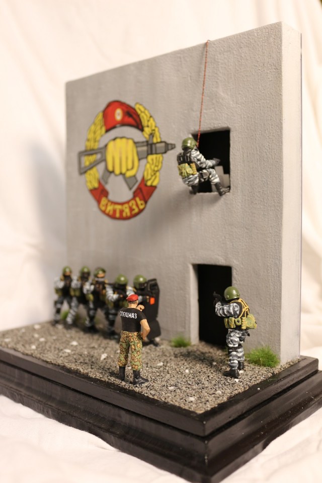 Вот если бы вы постарались вдохнуть жизнь в сюжет диорамы, он была бы выигрышней! Ну а стенку можно выполнить по прототипу из д. Новой, где Витязь проводит соревнования на краповый берет.