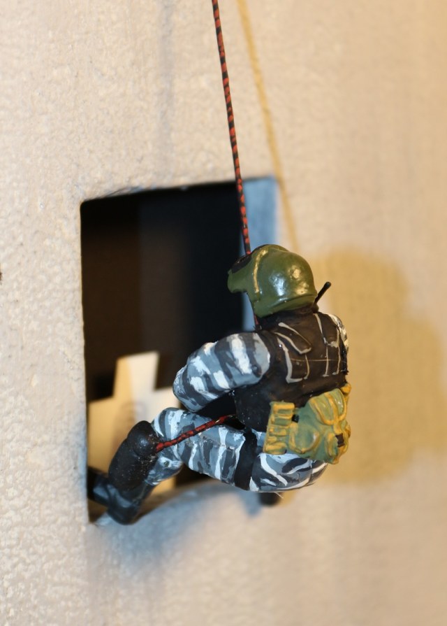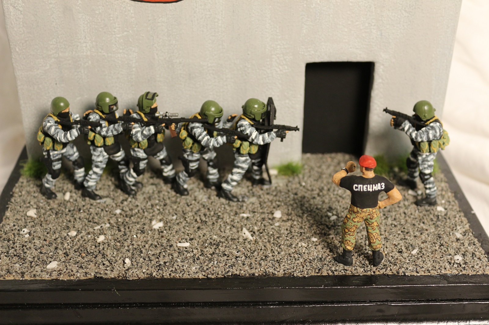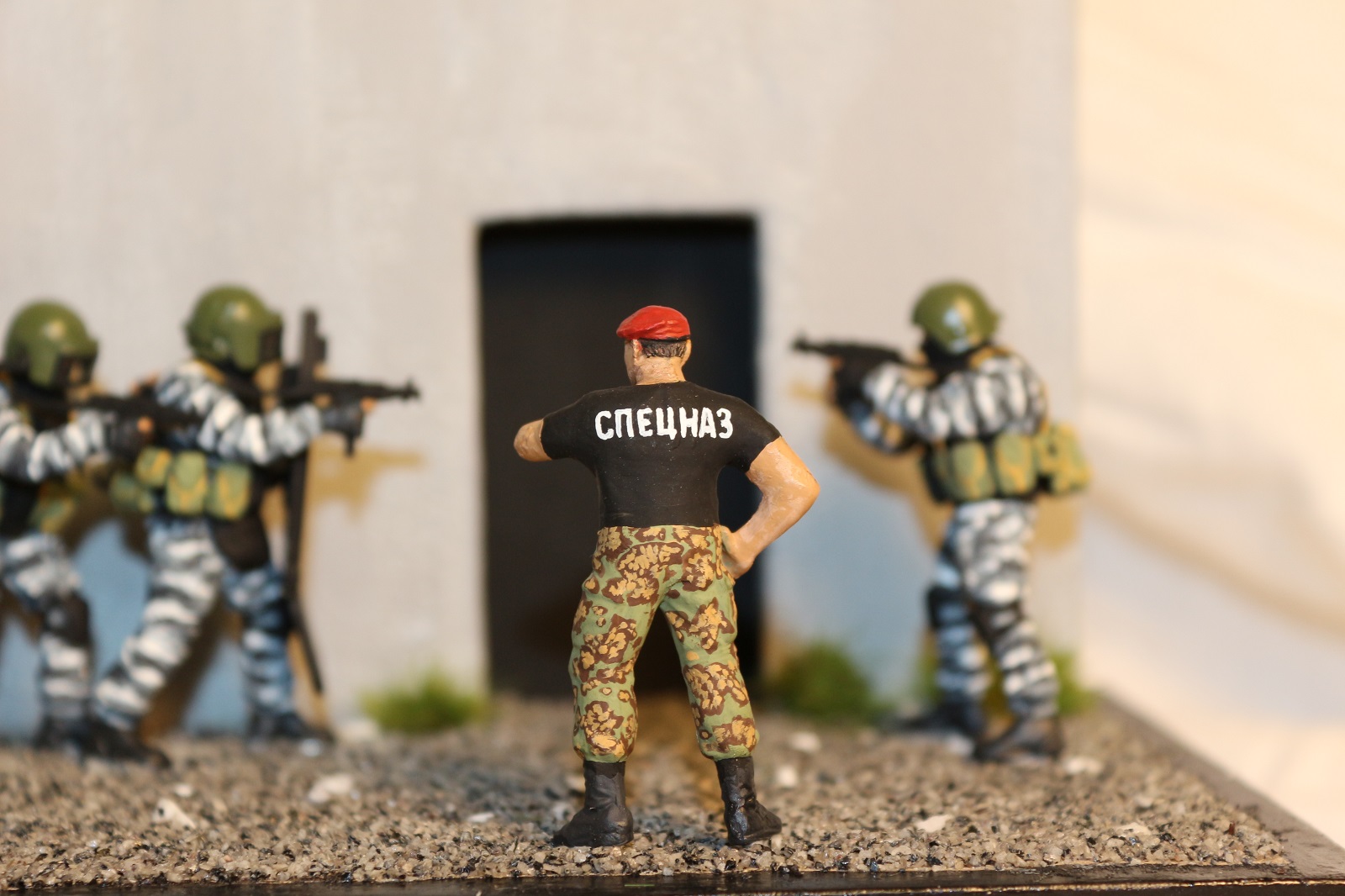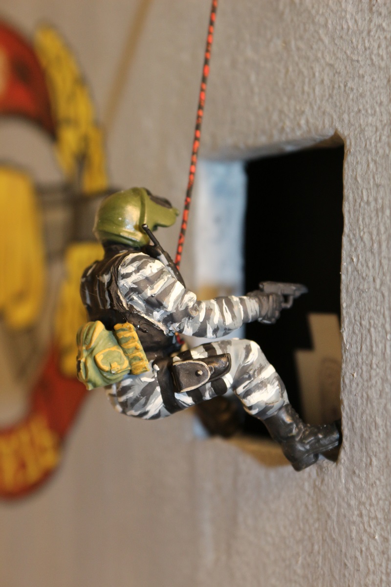 Ну мне кажется что боец что в окне, (он крупным планом)не аккуратно как то раскрашен, ремни... А боец в майке "спецназ" как то "игрушечно" смотрится, а так исполнение камо понравилось