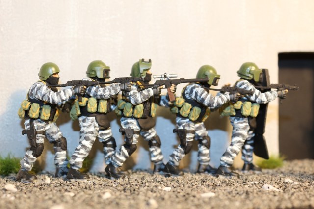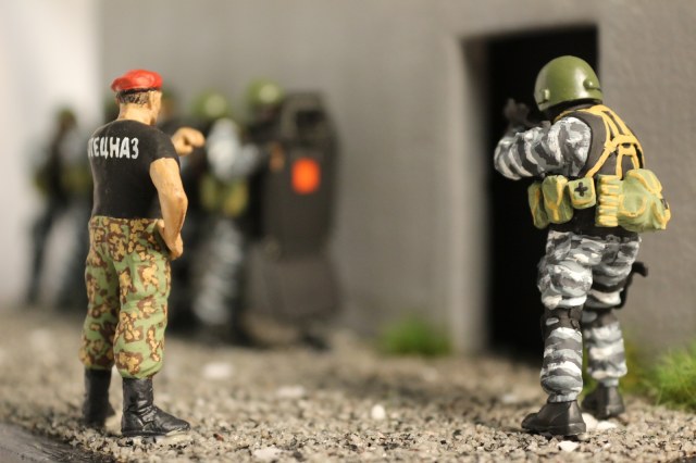 Предлагаю вашему вниманию мою новую работу. Отряд специального назначения "ВИТЯЗЬ". В этой диораме использовались два набора "Вымпел" от Звезды, частично использовались наборы "Российский СПЕЦНАЗ" номер 1 и 2, а так же набор от фирмы ICM "Конфликт в Косово 1999". Защитный шит из коробки переделал в "ВАНТ-ВМ". Буду рад вашим комментариям, если возникнут вопросы - спрашивайте. Спасибо за внимание!