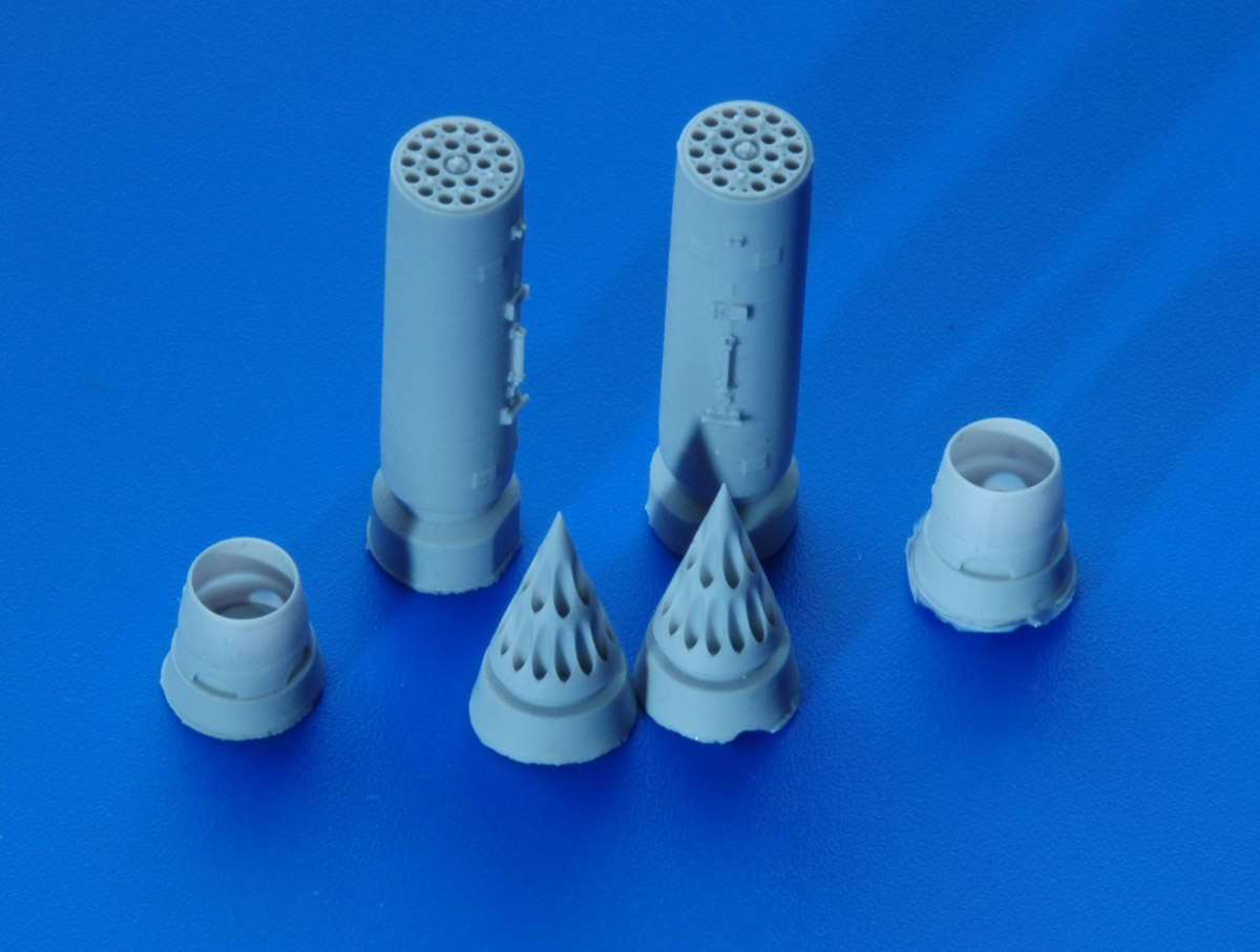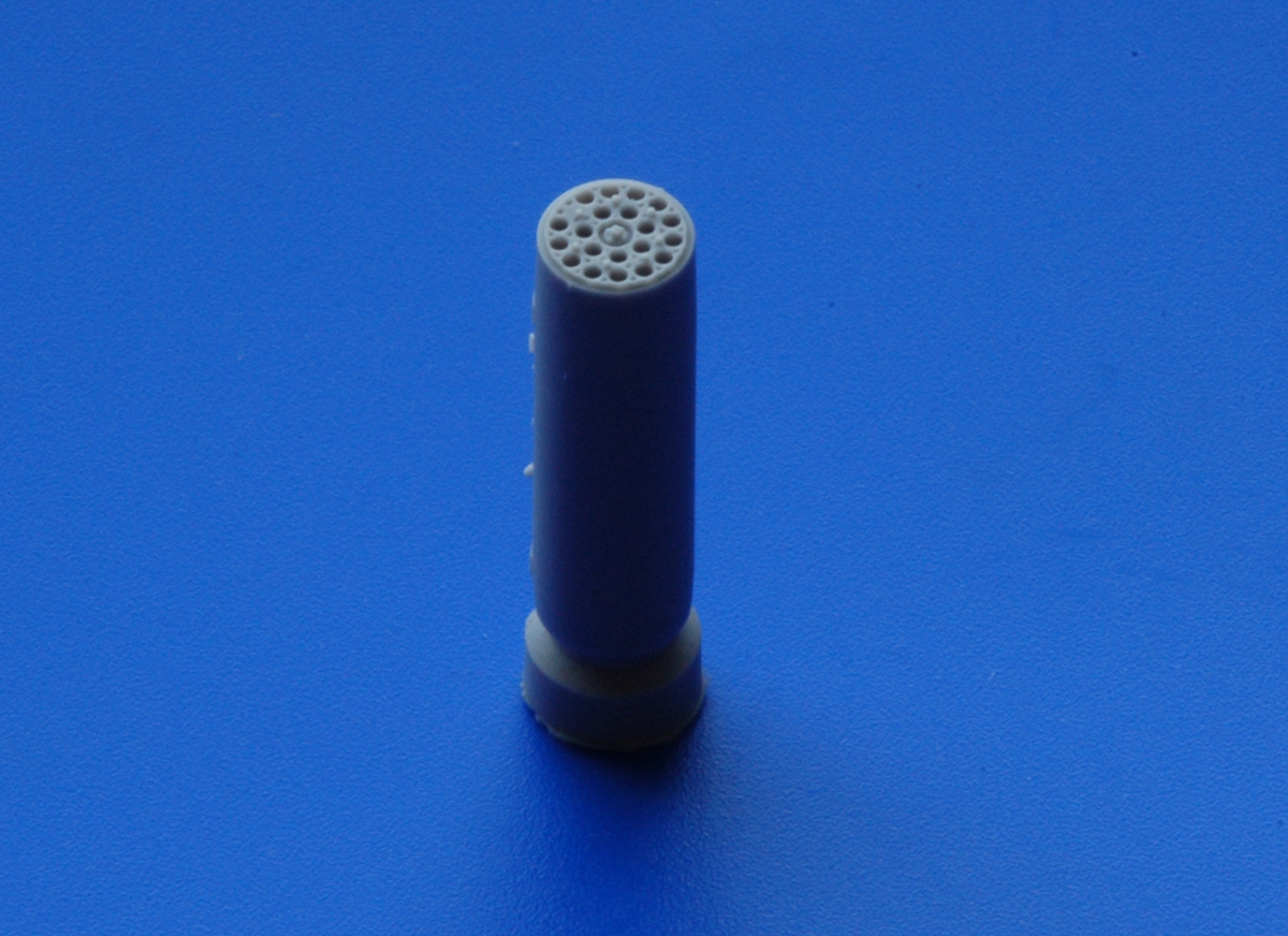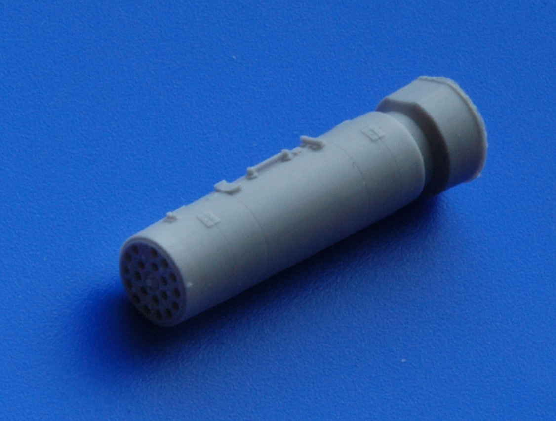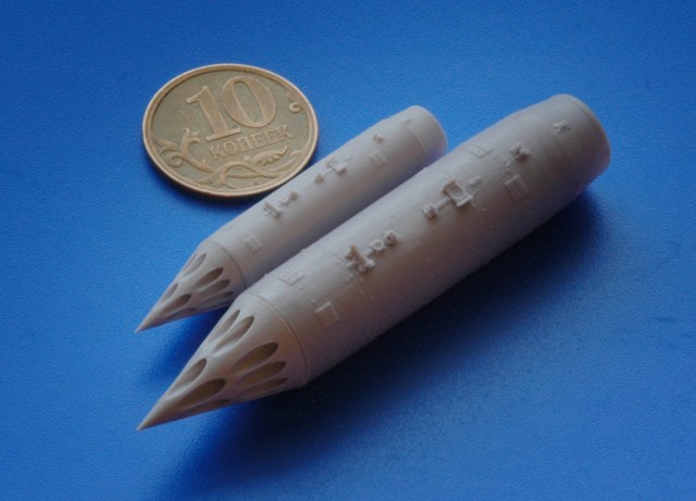В прозрачном пакете находится буклетик с описанием и отливки: с носовыми, центральными и хвостовыми частями для двух блоков, причем, рациональное членение соответствует реальному боеприпасу. Полиуретановая смола светло серого цвета достаточно пластичная и легко обрабатывается. Очень неплохо смотрятся каналы стволов, они не сквозные, но достаточно глубокие. Замечательно получилась замковая часть, а так же торцевая часть в хвосте блока (Это хорошо видно по прилагаемым снимкам). Так же добавил сравнительный снимок блока в двух масштабах.