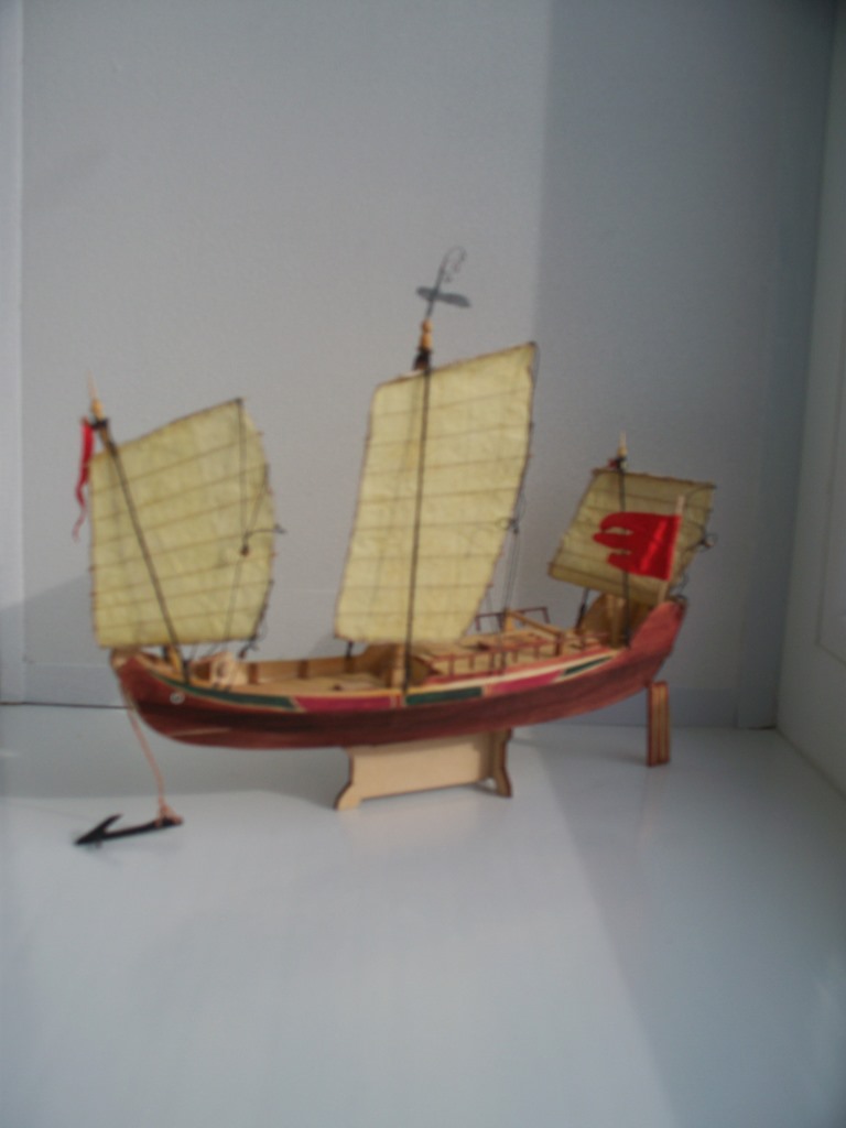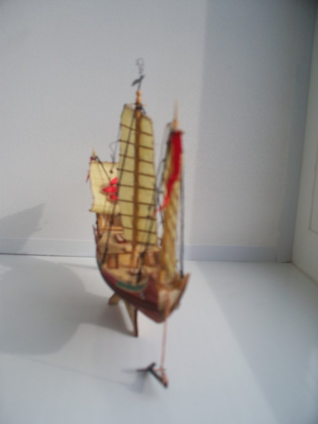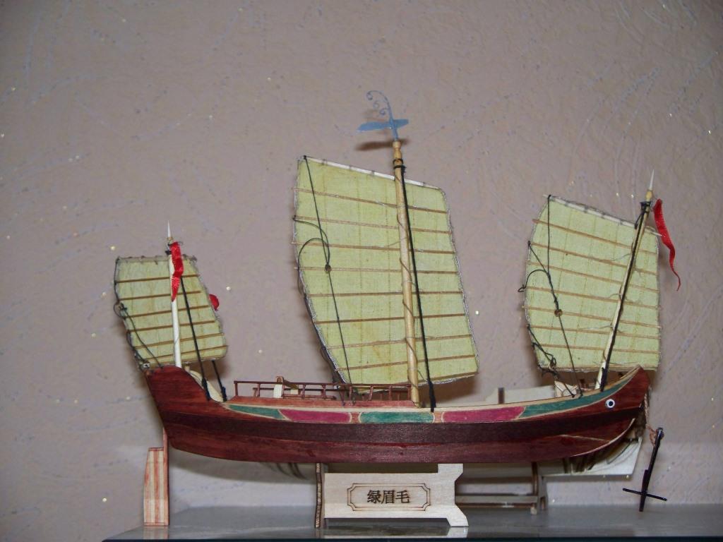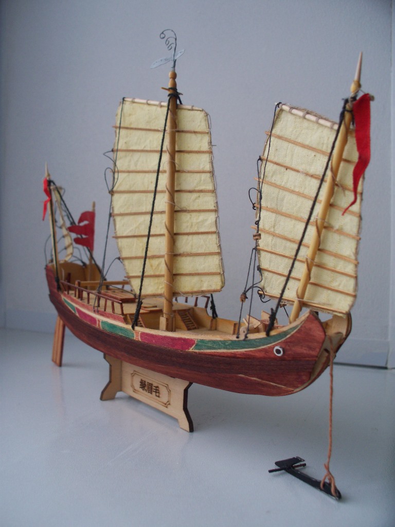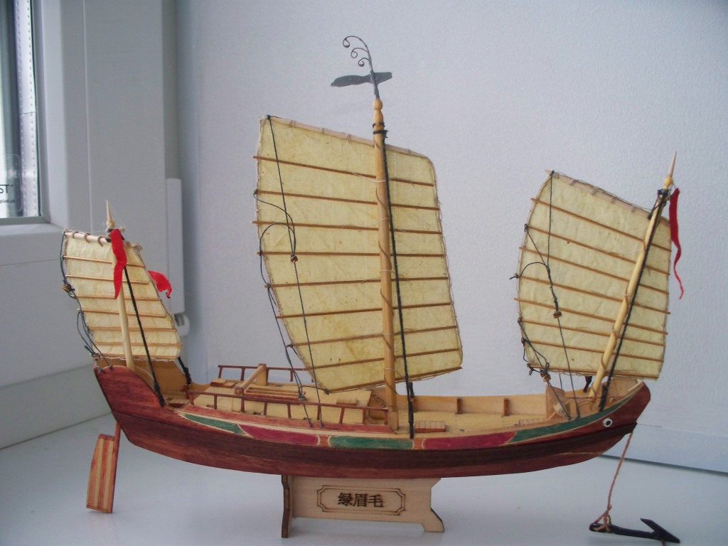 Китайская джонка из китайского кита, масштаб 1:148. Первая сборка 11-летнего сына под руководством. Добавлен якорь, флаги, флюгер и брашпиль. Все остальное - как есть. Покрытие морилка, акриловые краски, масло.