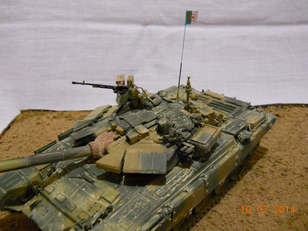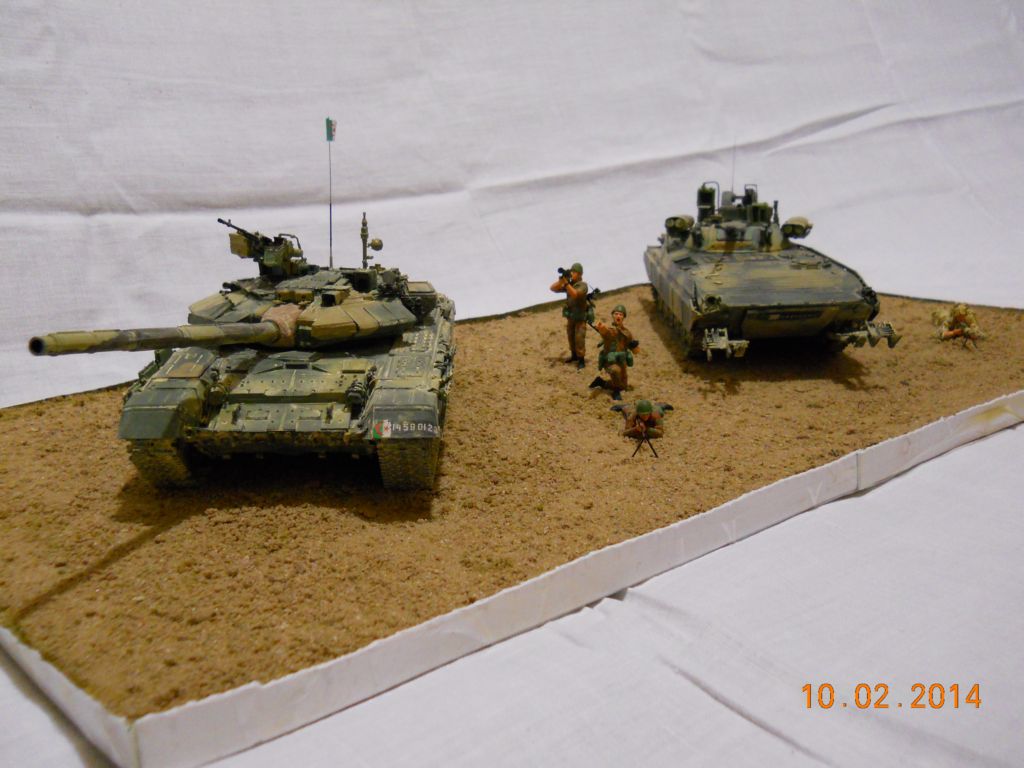 Здравствуйте, товарищи моделисты. Вот решил сделать диораму бронетанковых войск Алжира. Алжир выбрал, потому что по имеющейся у меня информации БМП 2 М и Т 90 СА стоят на вооружении именно в этой страны. Вы спросите, почему я делал БМП на базе "дешки", а не обычной двойки, отвечу: у базового варианта бортовые экраны с понтонами внутри не перекрывают борт целиком. Борта голые, телескопические амортизаторы торчат за катками, металлические приспособления перед ленивцами, которые очищают грязь... В общем, всё это при виде в профиль полностью портит весь эстетичный вид машины, а у "дешки" листы брони закрывают борта до катков и в результате эта машина выглядит более эстетично, современно, агрессивно, тем более что когда Алжир объявил конкурс на модернизацию своих строевых БМП 2, то в конкурсе приняли участия две машины. Белорусы предложили БМП 2 Д с сохранением основного вооружения, но с обновлённой СУО, а Россия базовый вариант с заменой боевого модуля на новый, но с сохранением защиты на прежнем уровне. Но улучшать только один параметр мне показалось не логично, и я немножко отошёл от реализма и сделал, перепил на основе "дешки". Прицел наводчика и командира, датчик ветра, гранатомёт, систему подачи снарядов к нему, снарядный бункер и силовые крепления для ПТУР делал с листов полистирола 1, 0,5 и 0,75 мм. Это мой первый опыт работы с ним, поэтому матчасть башни, пожалуйста, не оценивайте. Также сделал проводку к передним фарам, заделал переднюю ступеньку-ножку в листе брони правого борта и сделал из пластика таблички для флага и бортового номера на дополнительный лист передней брони и левой задней двери. Двери ДО делал открытыми, а так как они с внутренней стороны лысые я всю внутрянку дверей по фотографиям сделал из пластилина и пластика, крепёжные ремни из травла, которое должно было идти на корму башни. Аккумуляторный и топливный отсек, силовые элементы ленивцев, смотровые приборы, сидения и спинки к ним, топор, пилу, аптечку, крюки, на которых висит РПГ-7 и проушины, на которых в стальных скобах закреплены топор и пила - всё это сделано из пластика. Топливопровод и неизвестное мне приспособление у виде руля посредине - сделаны из проволоки. Модель окрашена тамиевскими аэрозольными красками "Зелёный НАТО TS-61" и "Тёмный жёлтый TS-3". Смывка делалась с помощью жёлтой заливки, но она почти не видна, имитация запыленности песком - пигмент MIG. В наборе был использован следующий афтемаркет: