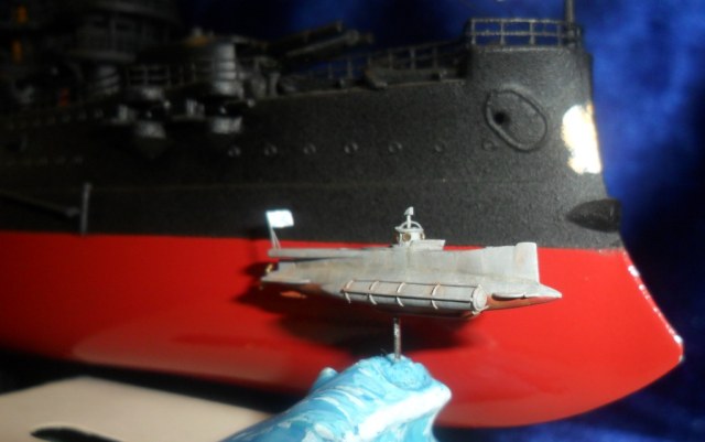 Для большей наглядности размеров модели и настоящей субмарины приведены сравнительные фотографии со спичкой (масштаб 1:1) и моделью ЭБР "Князь Суворов" (масштаб 1:350).