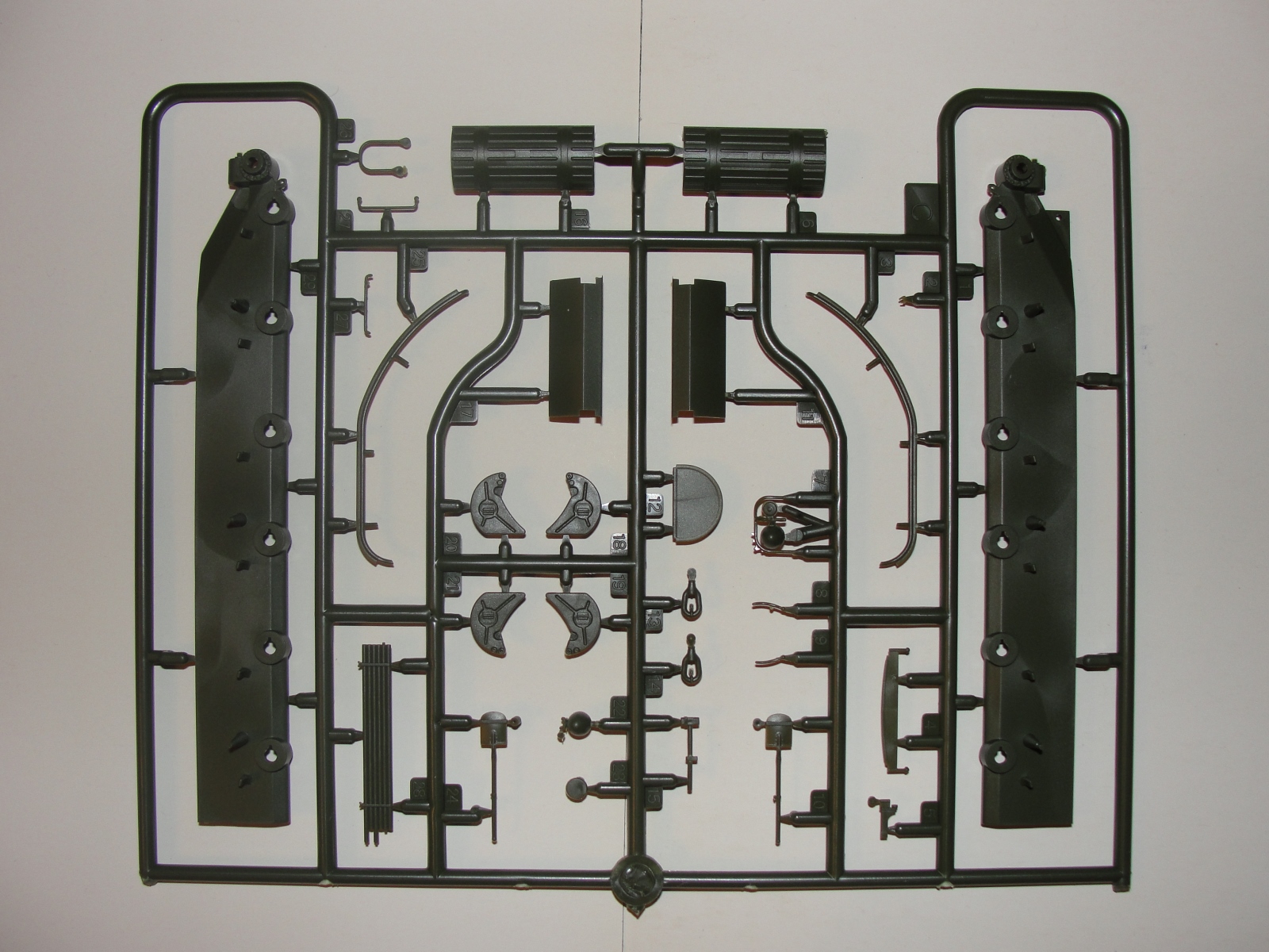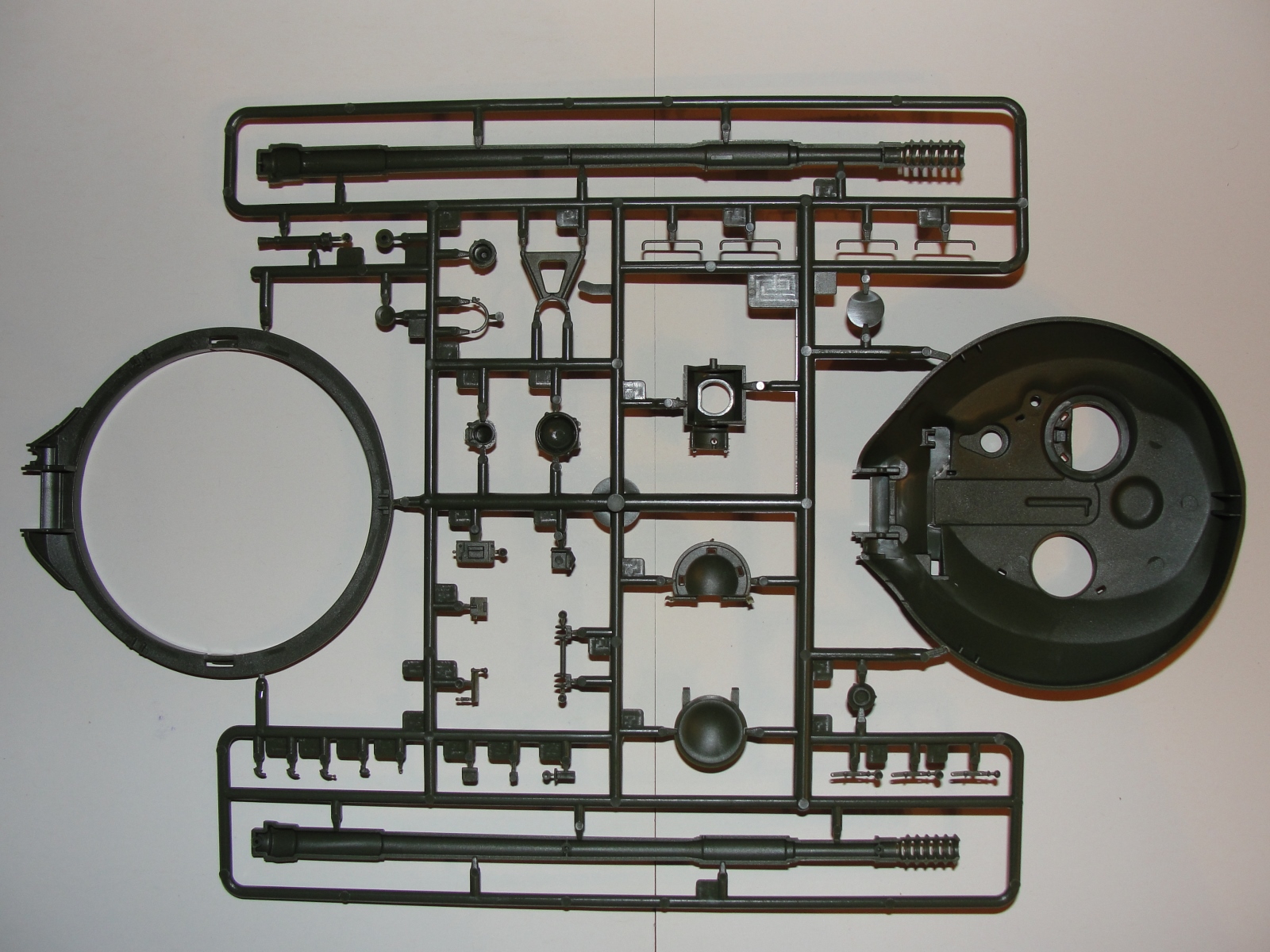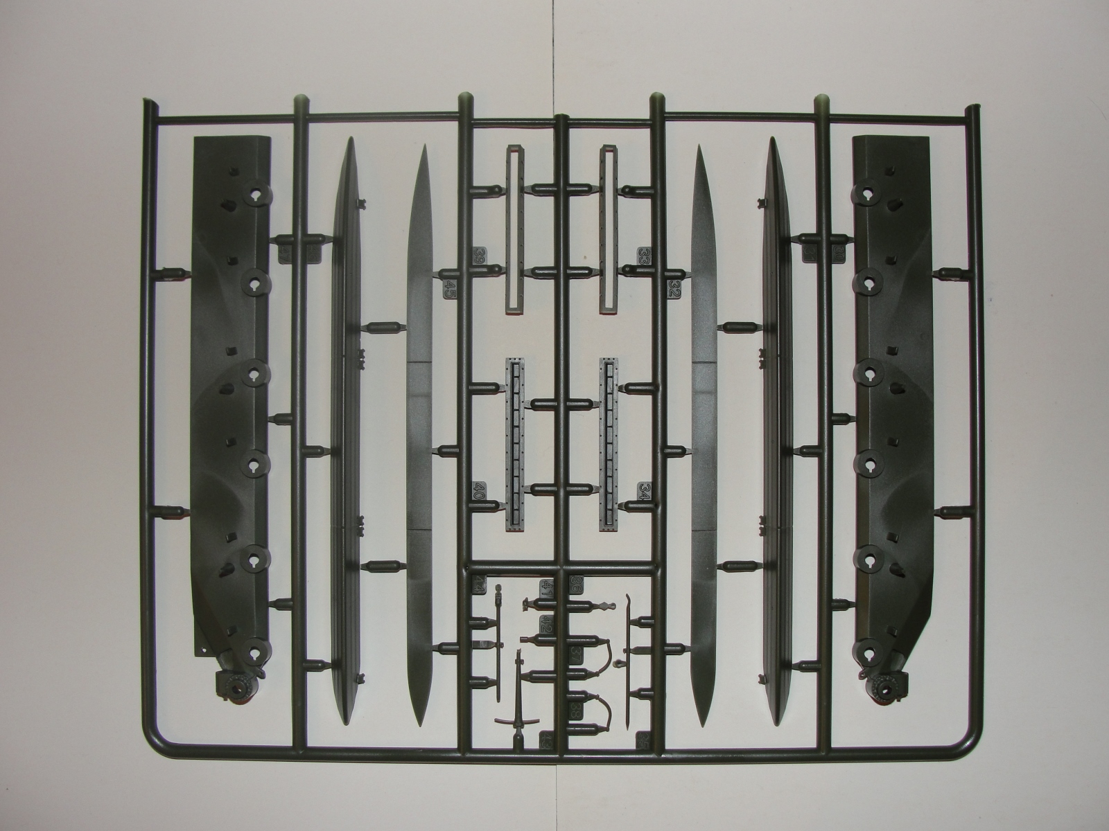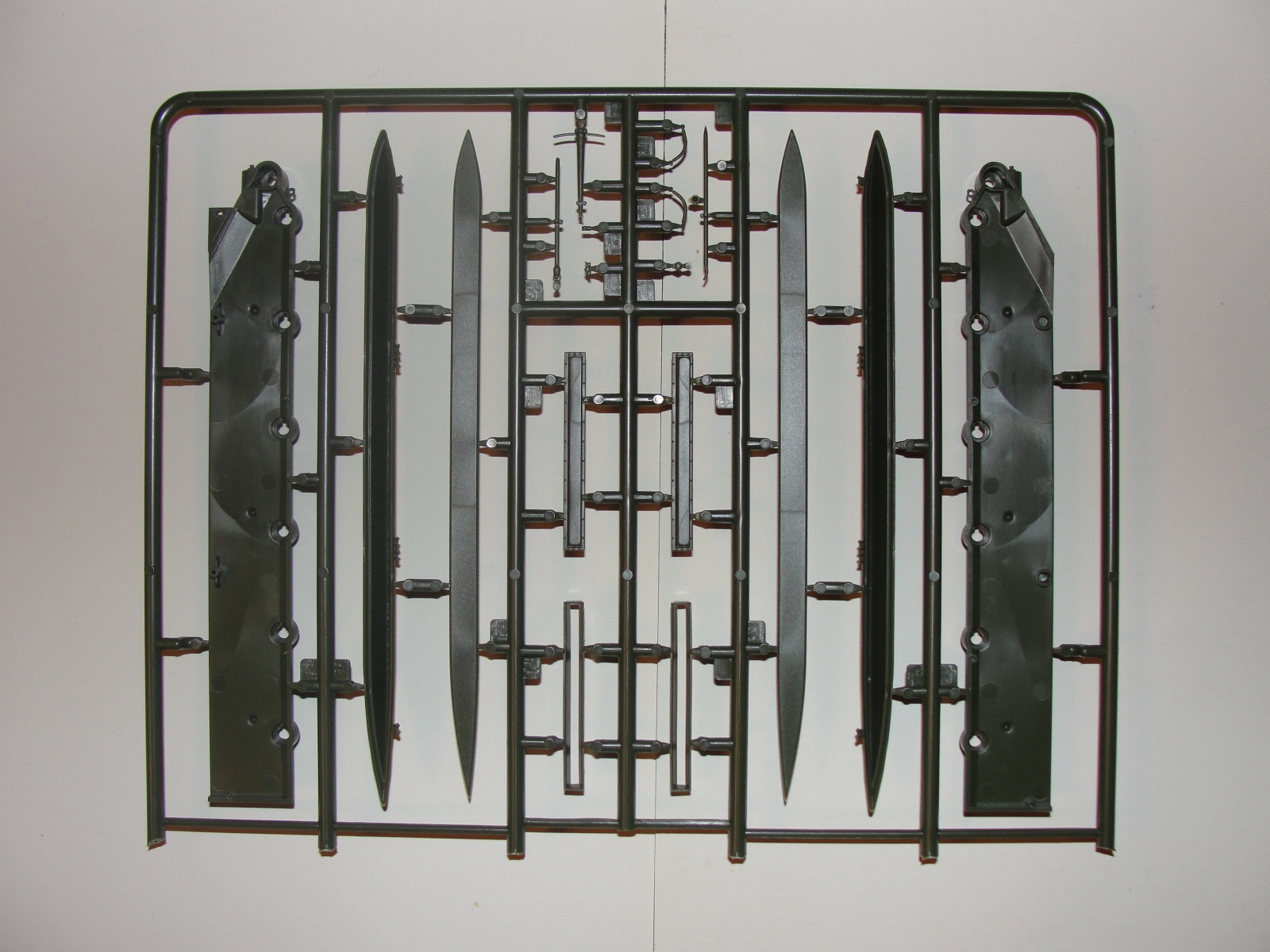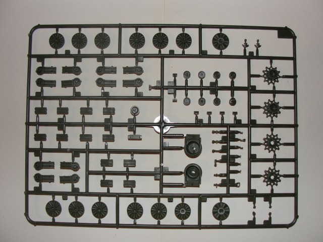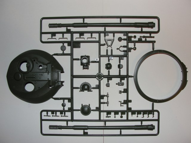 Модель выполнена из тёмно-зелёного пластика, в комплекте 7 литников плюс две детали корпуса, плата фототравления и медный трос.