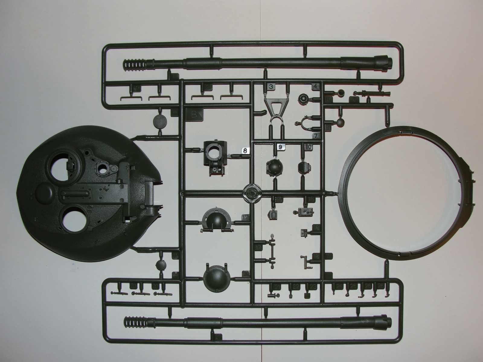 Членение некоторых деталей излишне проблемное. Например перед башни, где после склеивания верха и низа образуется заметный шов, который требует шпаклевания с последующей имитацией фактуры литой брони (это вроде как осилил), но по первой делать сложновато, особенно если учесть, что фактура на шве должна совпадать с фактурой на остальной части башни. Фактуру литья делал клеем и зубной щёткой, и пластик от обильного промазывания клеем почему то местами скукоживался и очень трудно расправлялся, что не радовало.