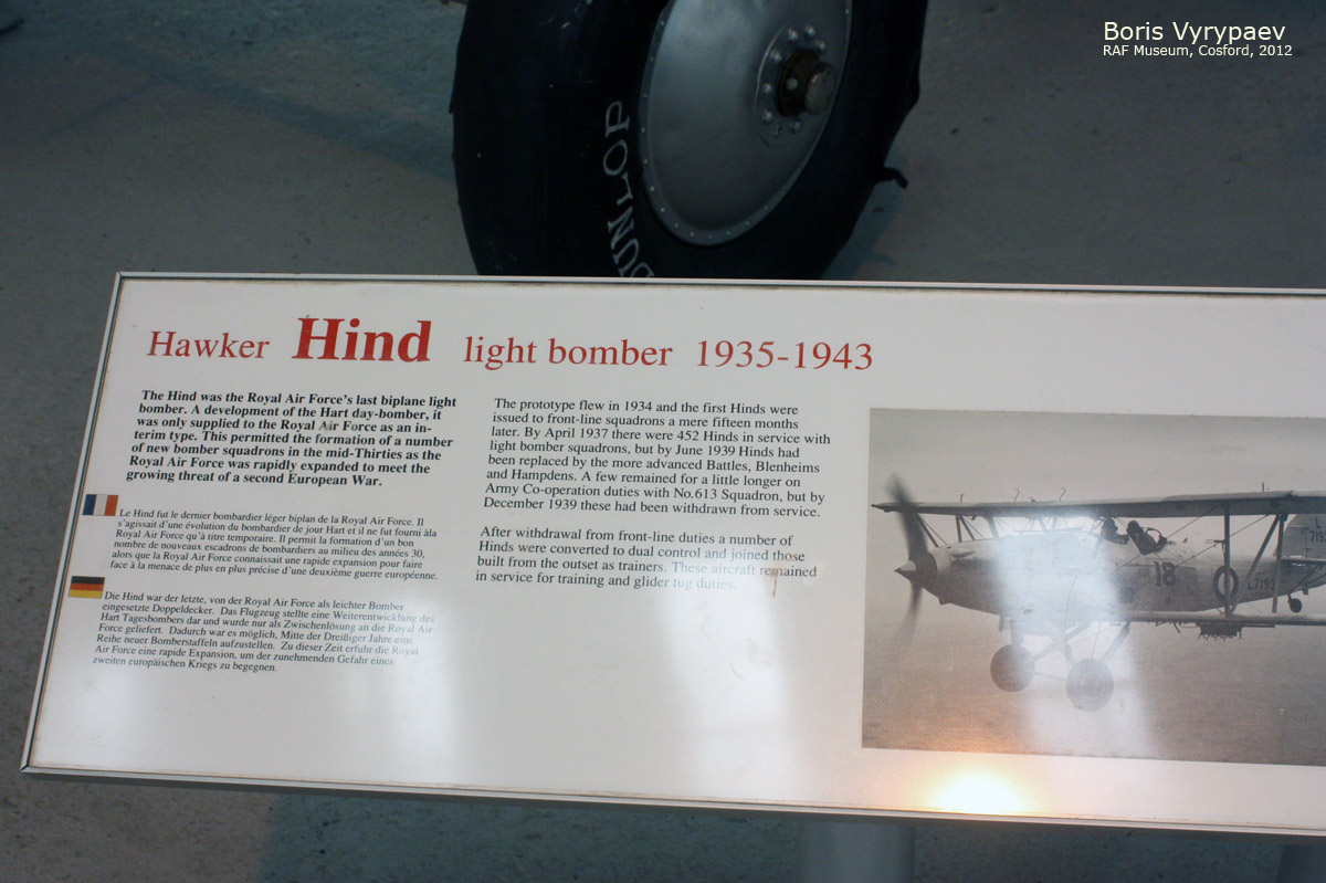 Hawker Hind- легкий дневной бомбардировщик, одномоторный цельнометаллический биплан с неубирающимся шасси. Создан в конструкторском бюро фирмы "Хаукер эйркрафт", под руководством Сиднея Камма. Опытный образец взлетел 4 сентября 1935 года, а в конце 1935 года на заводе "Хаукер" в Лэнгли было организовано серийное производство. Учитывая учебные варианты (20 единиц), было построено 507 самолетов разных модификаций. Производство завершено в 1938 году.