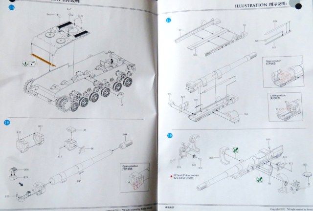 Ствол отлит целиком,дульник тоже,траки наборные на защелках,плюс пальцы идут на отдельных литниках,это то что бросилось в глаза.Имеется внутрянка.Так же имеется шаблон для сборки гусянок.Окраска на 4 варианта,2 варианта в зимнике.
