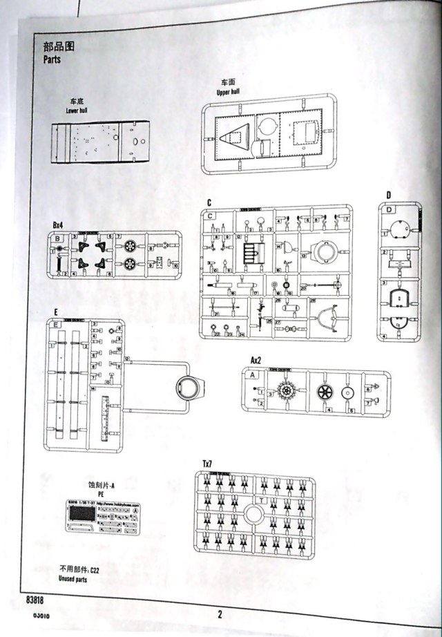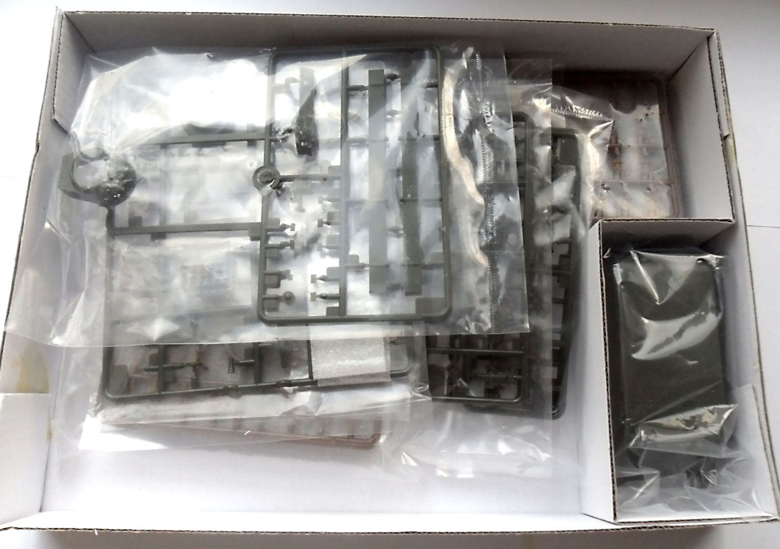 В традиционной коробке от "Хобби Босса" находится ванна корпуса, литник с верхом корпуса одной деталью, 9 литников с деталями машины и ходовой и 8 литников с наборными гусеницами, а также маленькая плата фототравления, инструкция и образец окраски. Декалей в наборе нет.