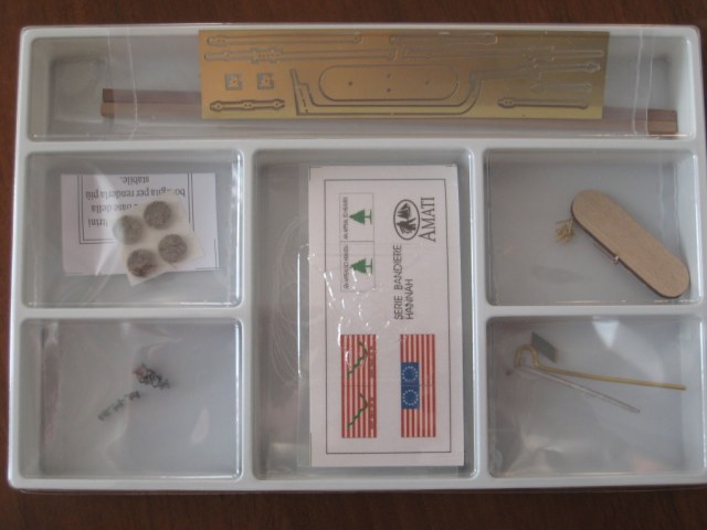 - Стандартный блистер амати с дельными вещами, травленкой, флагами и спец. инструментом.