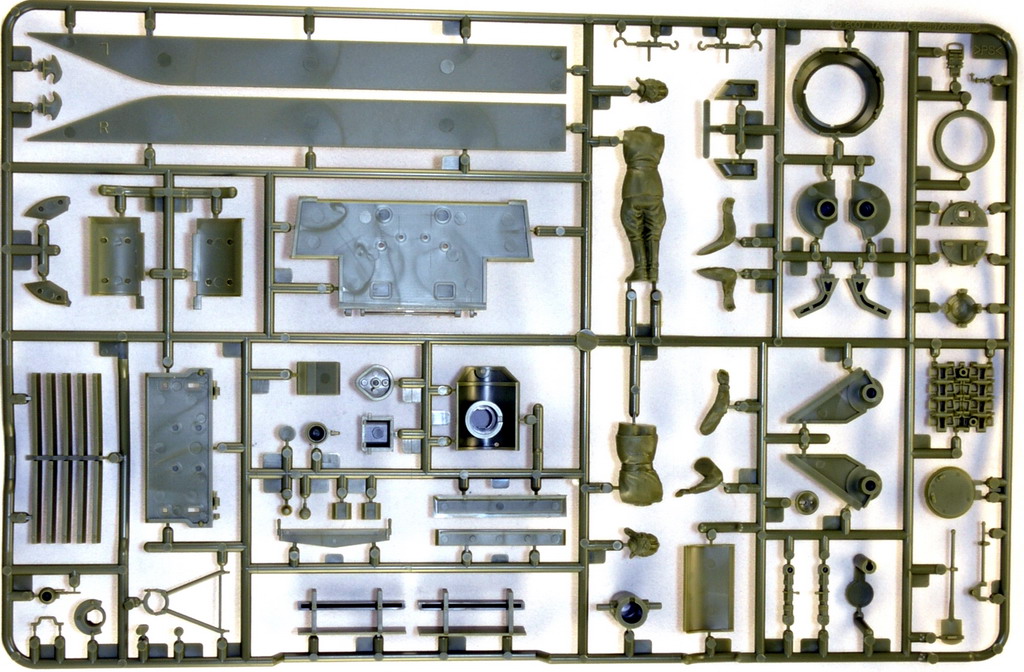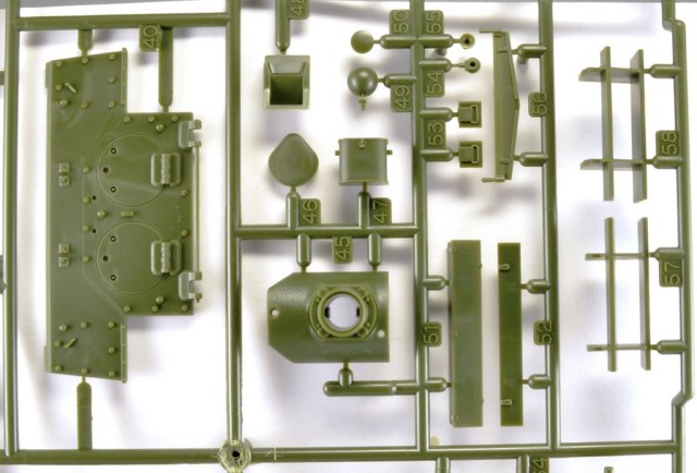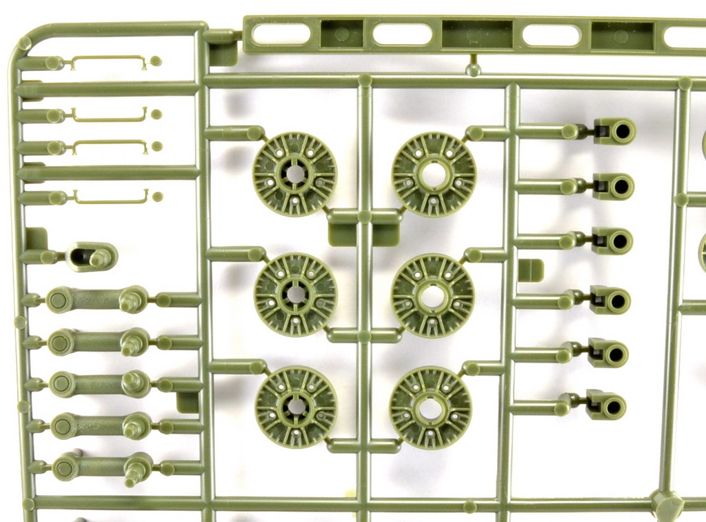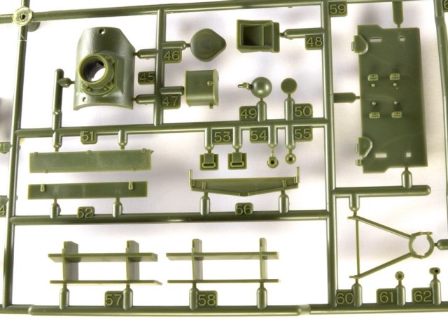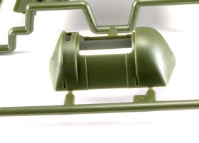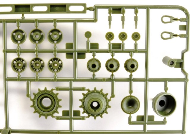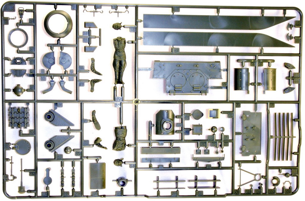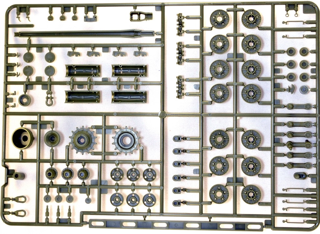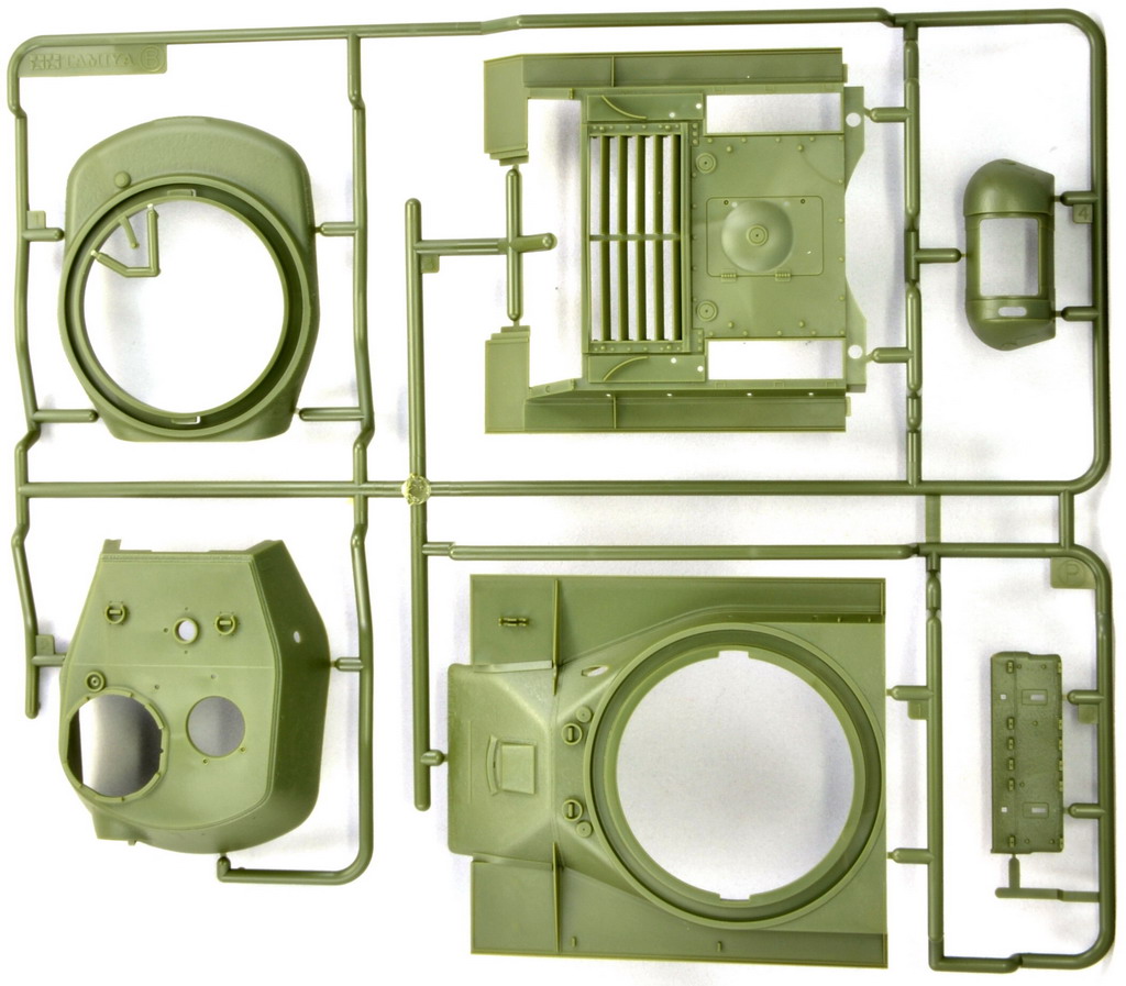 - Все детали модели умещаются на 4-х литниках из пластика зеленого цвета, из которых на одном крупные детали верха корпуса и башни, два с одинаковыми деталями ходовой и прочими дублирующимися элементами, и последний – со всеми оставшимися деталями, включая части тел двух танкменов. Тамия верна себе в склонности к упрощению. Ванна корпуса дана отдельной деталью. Качество отливок отменное, никаких расстройств в виде облоя, утяжин, недоливов и прочих чудес при беглом осмотре не обнаружено.